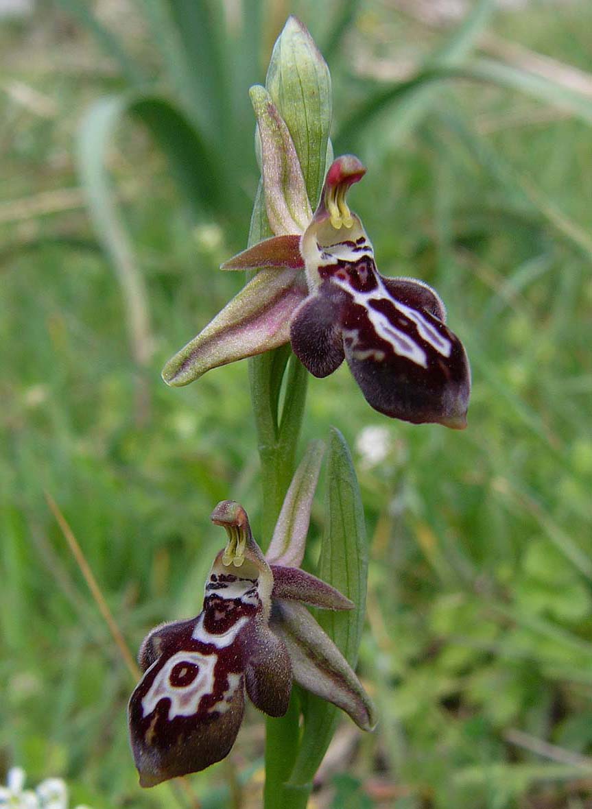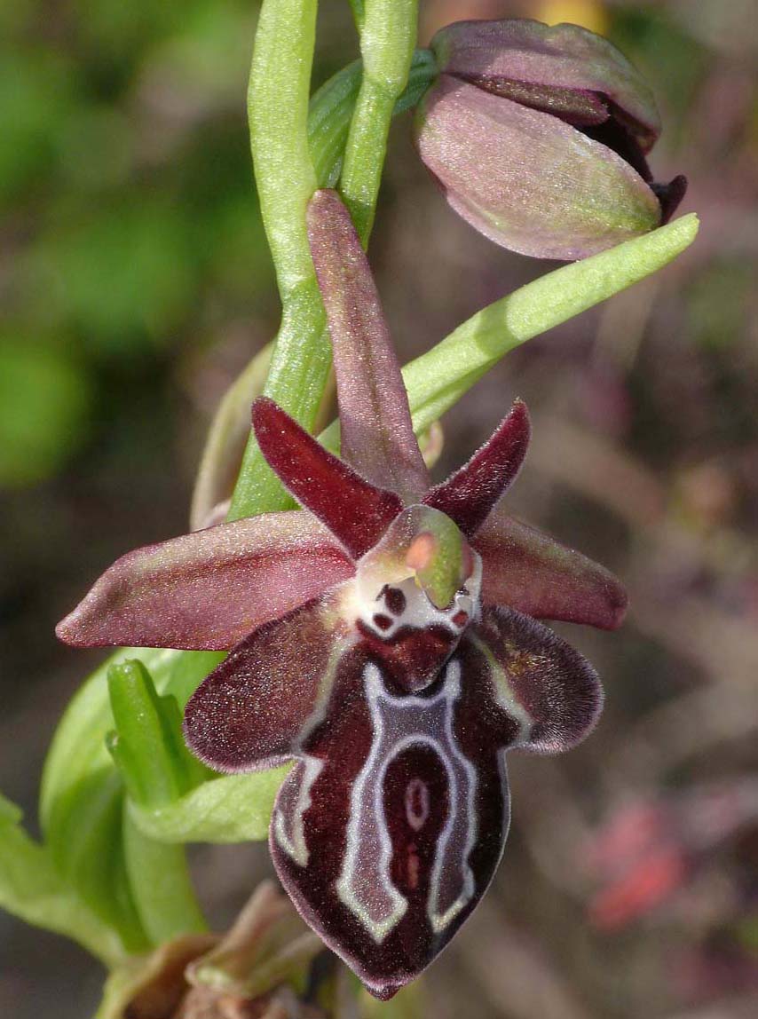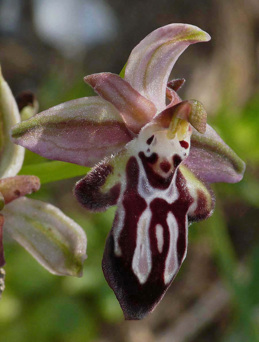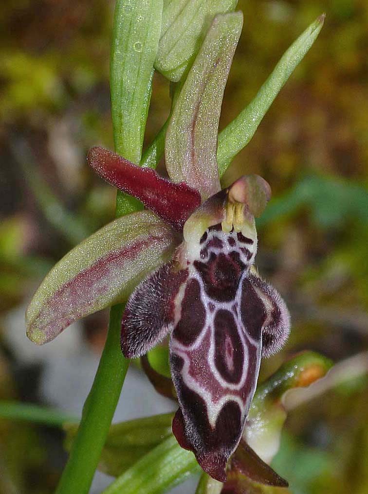 This species is a Greek endemic being found in the Cyclades, Karpathos and Crete where it is not uncommon on the eastern side of the island. It has also been recently discovered in small numbers on the mainland in both Attica and the southern Peloponnese. It is a very similar plant to O. cretica and on Crete itself, the two species are known to hybridize, though the scope for this is limited by minimal geographical overlap and significant differences in flowering times. Even in pure populations, natural variation ensures distinguishing between O. ariadnae and O. cretica is not always straightforward. In typical forms however, two features in particular serve to separate the taxons. The first of these is the stigmatic cavity which in O. cretica is constricted at the base, creating the appearance of a neck, whereas in O. ariadnae, it widens at the base or at least rises straight up from the shoulders (see pictures 4 and 13). A second characteristic is the normally more complex and extensive specular pattern of O. ariadnae. Commencement of flowering can vary, sometimes appearing up to a month before its close relative. They both however bloom for lengthy periods and can easily be found flowering concurrently, though rarely side by side. O. ariadnae starts flowering as early as February and is normally over by the end of April. The pictures are all from Crete and date from the first two weeks of April. |