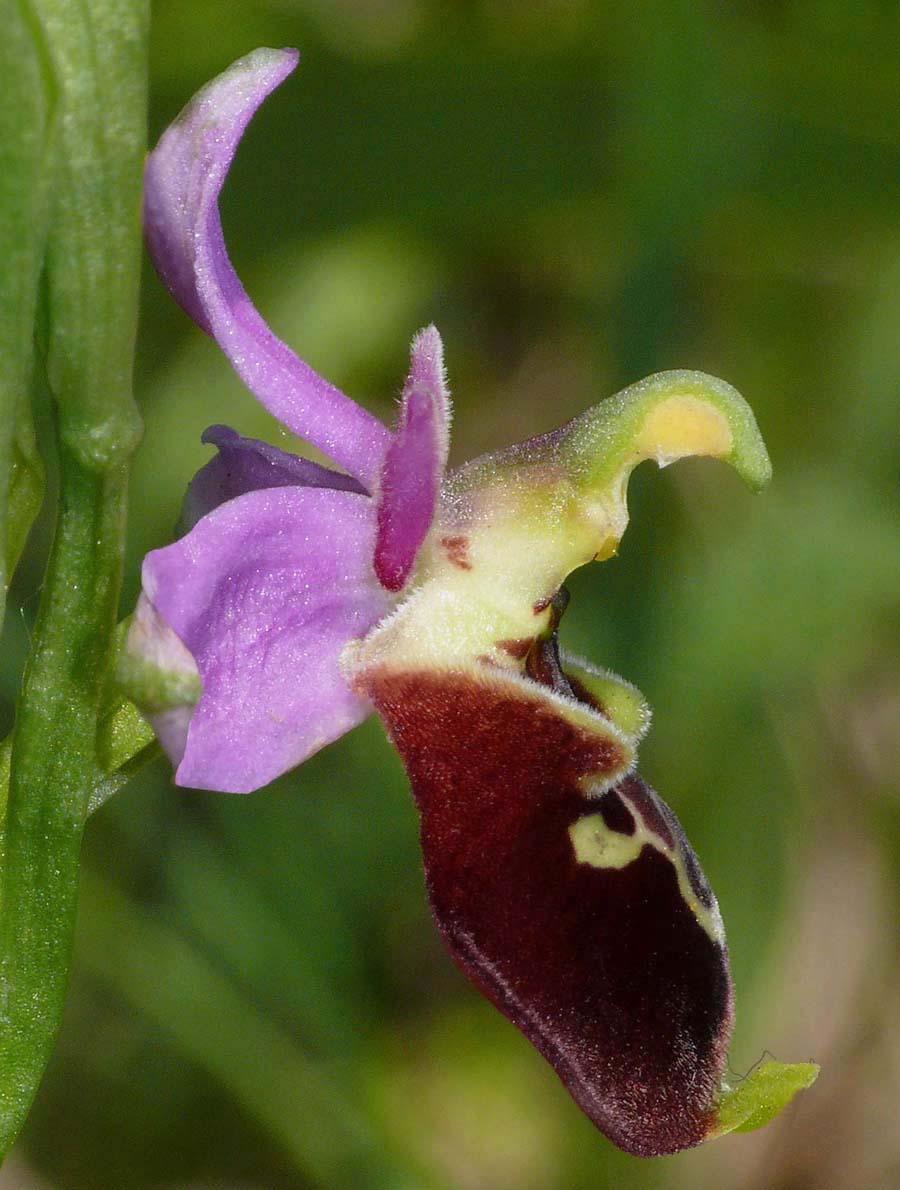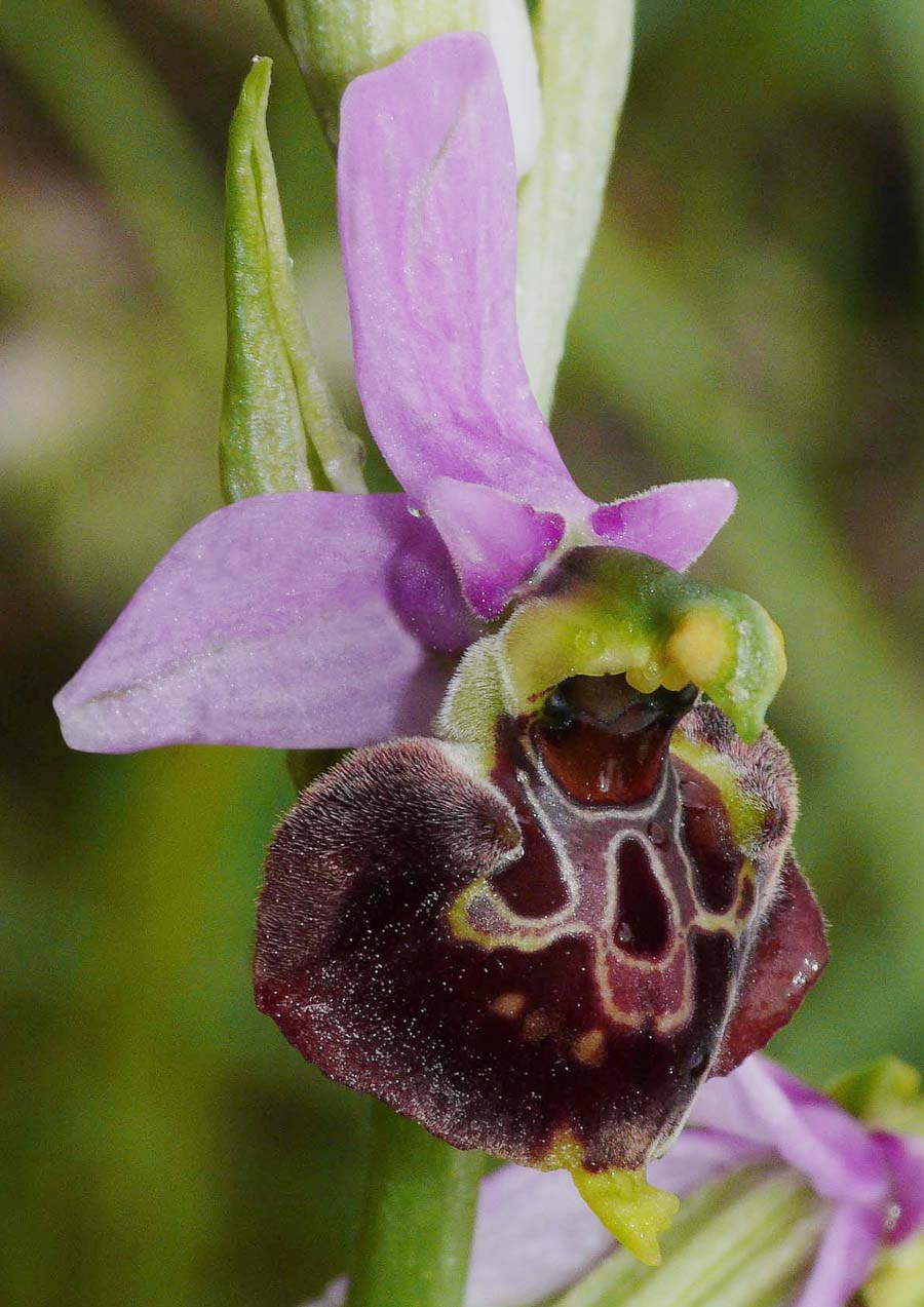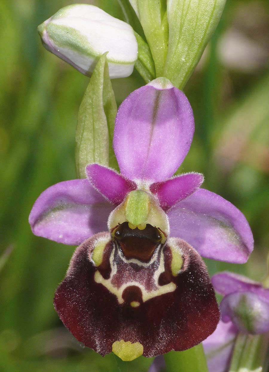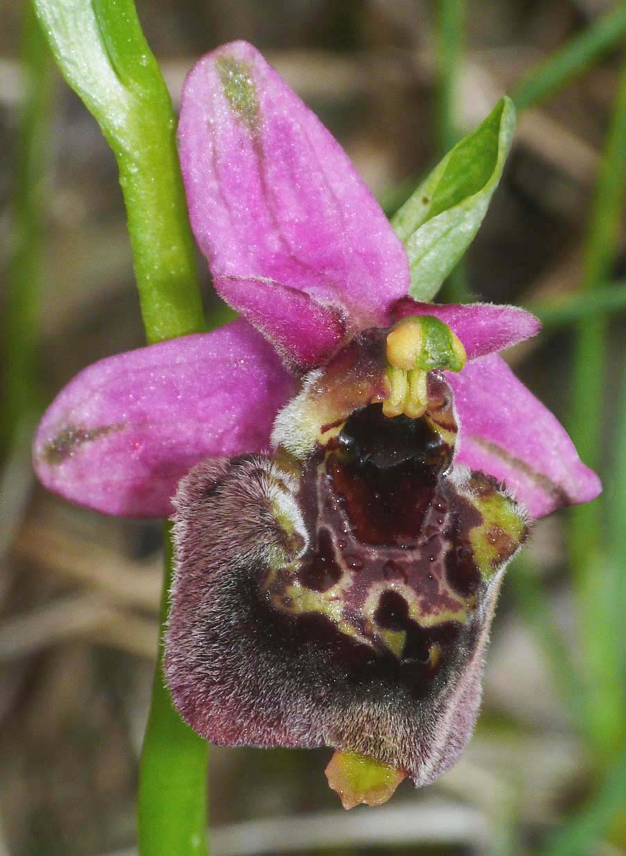 O. brachyotus was first described by Reichenbach from Genoa ( Italy) in 1830 and its name is a reference to the short petals exhibited by this species. It should perhaps be mentioned however, that as can be seen in picture three, the petals do not always fit the description of short and can in some cases be up to a third of the length of the sepals. It is one of the commoner members of the O. tetraloniae group and its home is the sub-Mediterranean areas of southern France and northern Italy. The species can reach as far north as Switzerland, but it is probably at its most frequent in the Maritime Alps and Alpine foothills of central southern France. The status of O. brachyotus as a valid species has been questioned for many years and little unanimity has been achieved, with the result that some authors consider it be synonymous with O. gresivaudanica and do not inlclude it in they're species lists. As with most members of this group, identification is not easy and there are several other species with which it may be confused, not least O. gresivuadanica. The most important feature of this particular species and the group generally is the characteristic, complete band of submarginal hair encircling the labellum. Lip shape is highly variable and can range from fuciflorid to scolopaxoid, though the former is much the more common. The perianth is normally pink and the petals often darker, particularly at the base. It is a medium sized flower, significantly larger than O. gresivaudanica and the inflorescence can contain as many as 12 individuals. O. brachyotus also differs from the latter in its phenology, first appearing in mid May and flowering through to mid June. The photographs are from several lower alpine valleys south of the Vercors and in Alpes-Maritmes, dating from the first week of June. |