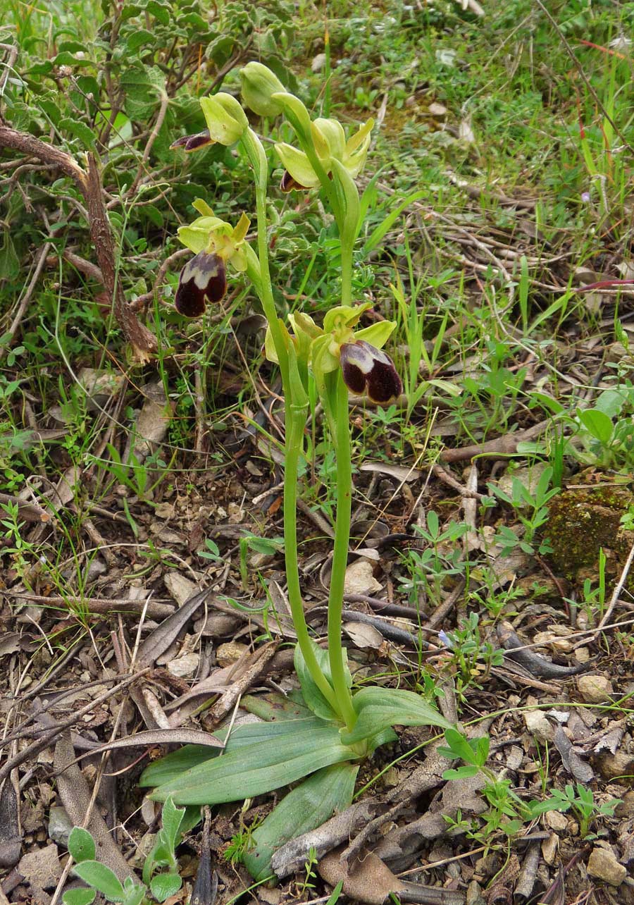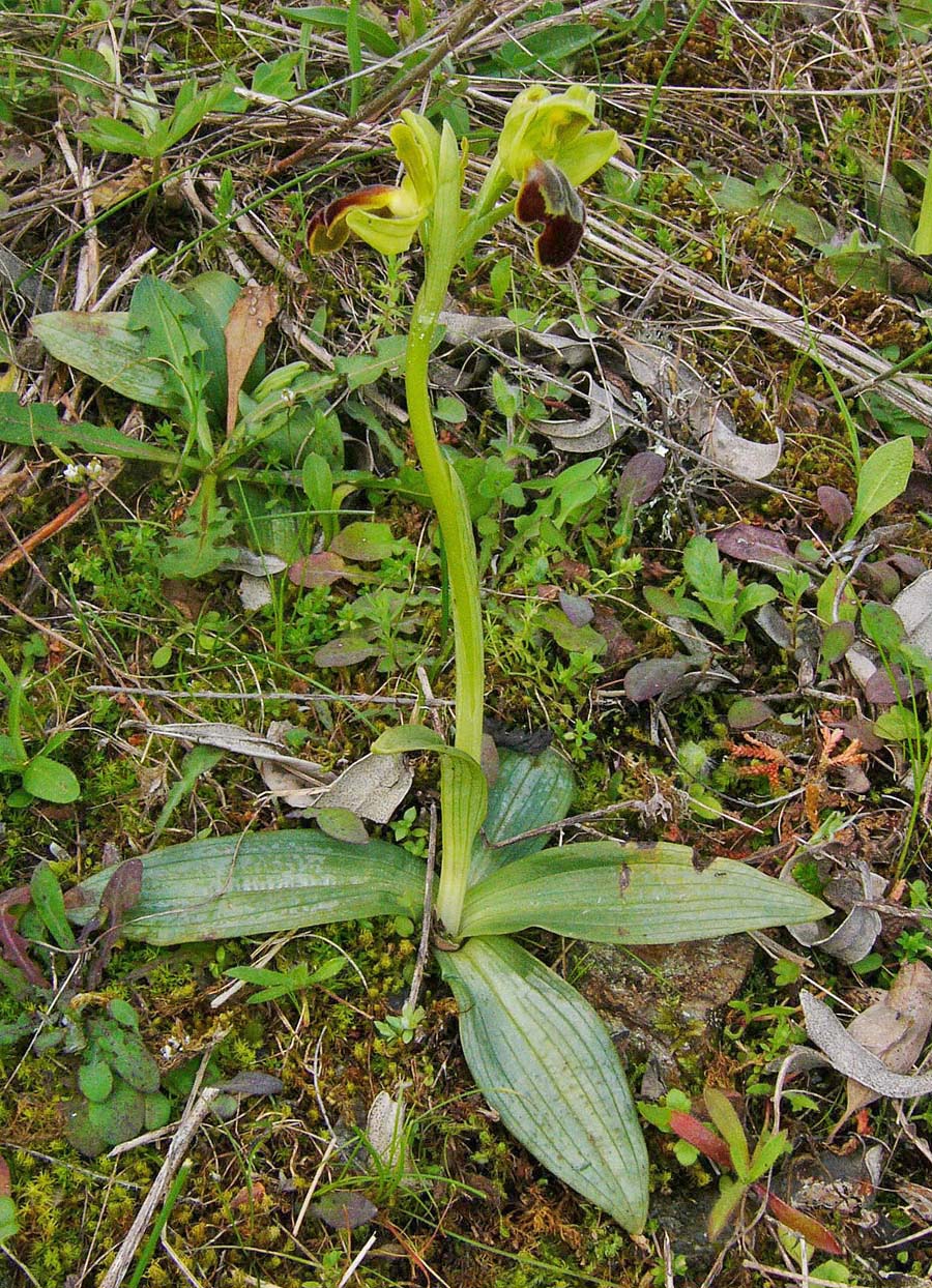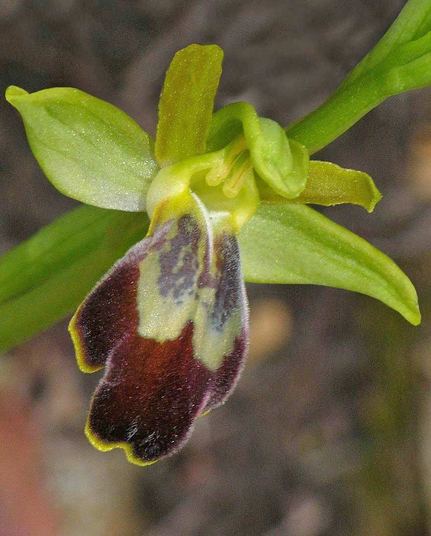 This species was originally thought to be endemic to Anatolia and more particularly to the Cesme Peninsula which juts into the Aegean less than 10 kms from the Greek island of Chios. It is perhaps no surprise therefore that the taxon has now been reported not just from Chios but from its northerly neighbour, Lesbos. O. cesmeensis is by any standards an impressive Ophrys with up to six large flowers held on a robust stem above a rosette of silvery green leaves. Whilst this latter characteristic can be noted in many Ophrys species, it is particularly pronounced in this rare and little researched orchid. Unlike many Pseudophrys, O. cesmeensis generally seems to shun hot, dry conditions preferring a degree of shade and moist, alkaline soils, conditions which can be commonly found in open pine woods, abandoned olive groves and heavily overgrown cultivation. The large flowers serve to easily distinguish this species from similarly marked taxa but a further distinctive characteristic is the lip which is markedly reflexed at both basal and distal ends whilst exhibiting a flat spot in the centre. There is always a thick yellow band around the margins of the lip though this can often be partially concealed by the recurvature of mature flowers. These photographs come from the Greek, Aegean islands of Chios and Lesbos, dating from the first week of April. |