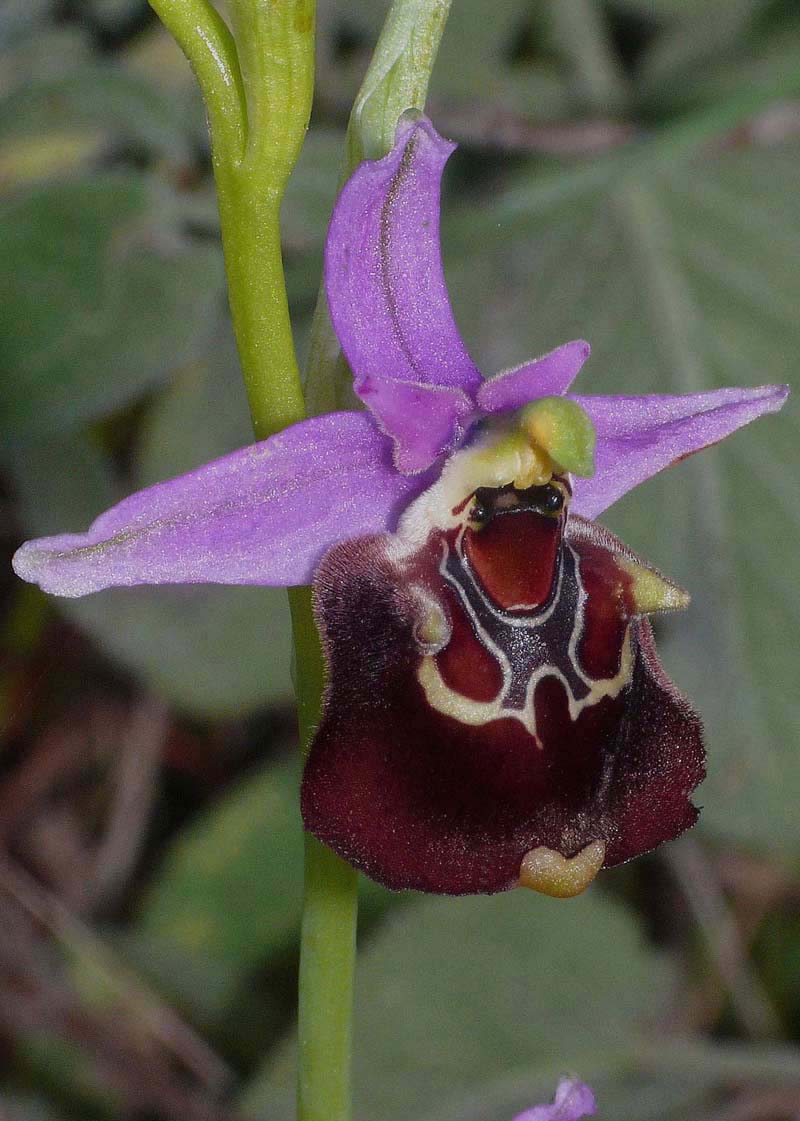 This species now resides within the O. heldreichii group and although at present only known with certainty from Rhodes, very similar plants flowering at the same time have been discovered in Anatolia that may well prove to be O. colossaea. It is also entirely possible that this species may be present on other of the Aegean islands. This is a tall Ophrys (up to 70cms) with characteristically large flowers that serve as important diagnostic markers when trying to identify it. Another significant indicator is its flowering period, which does not commence until at least the second week of April when O. calypsus and O. calypsus var. pseudoapulica are past their best. The Rhodes endemic O. halia is also a later flowerer but its distinctive appearance makes confusion unlikely. O. colossaea can be a variable species but typically the median lobe is trapezoid and lacks the "pot belly" appearance of O. calypsus. Sepals are distinctively long and triangular with concolourous, pink petals. Labellum colouration ranges from rich chestnut to a deep mahogony red with an uncomplicated, large but somewhat drab specular pattern. The pictures are from Rhodes and date from the end of April. |