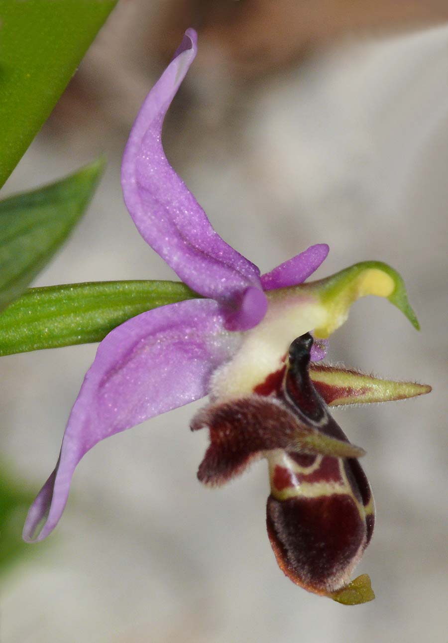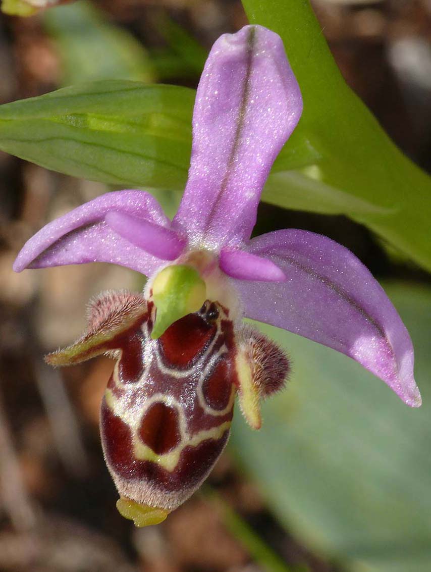 O. crassicornis was first described from the Ionian island of Lefkada, as a form of O. cornuta by Renz in 1928 and promoted to full species status in 2004 by Devillers and Devillers-Terschuren. Its name means "thick horned" and is a reference to the well developed protuberences of the species. It's a member of the large O. oestrifera group which has been the recipient of much study and attention over the last two decades but none of which has satisfactorily clarified significant taxonomic questions, particularly as they relate to the group in the eastern Mediterranean. The distribution and very existence of O. crassicornis has been called into question over recent years. The description that follows reflects one of the views, that it is a valid species with a range encompassing the southern Ionian islands and adjacent areas of the Greek mainland and northern Peloponnese. Distinguishing this species from O. cerastes is a job for the experts and in the absence of pollinator identification the plants depicted here have been selected with reference to the parameters of their known distribution. The photographs all come from the island of Cephalonia where only O. stavri and O. cephaloniensis present challenges to identification though both are extremely rare and relatively easy to differentiate. It is worth mentioning however that O. crassicornis grows alongside both these taxons in some sites. O, crassicornis exhibits a slightly larger flower than any of the previously mentioned species and is also a more robust plant with a basal rosette of silvery green leaves. The pictures date from the first week of April. |