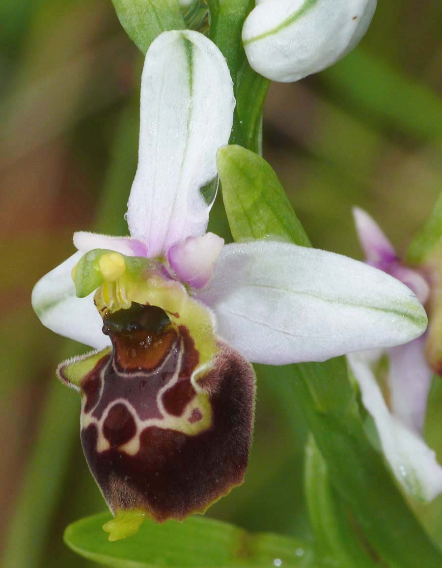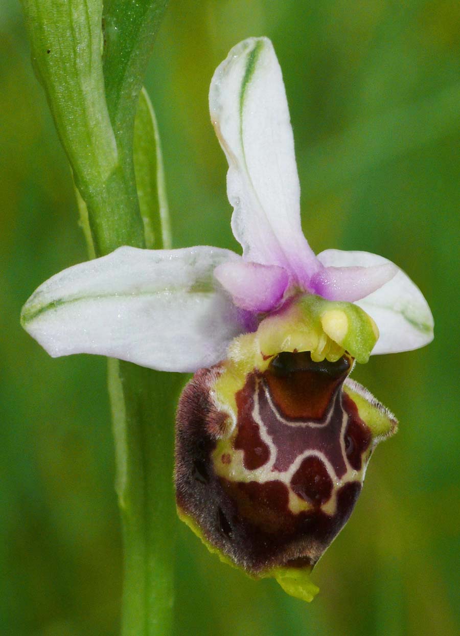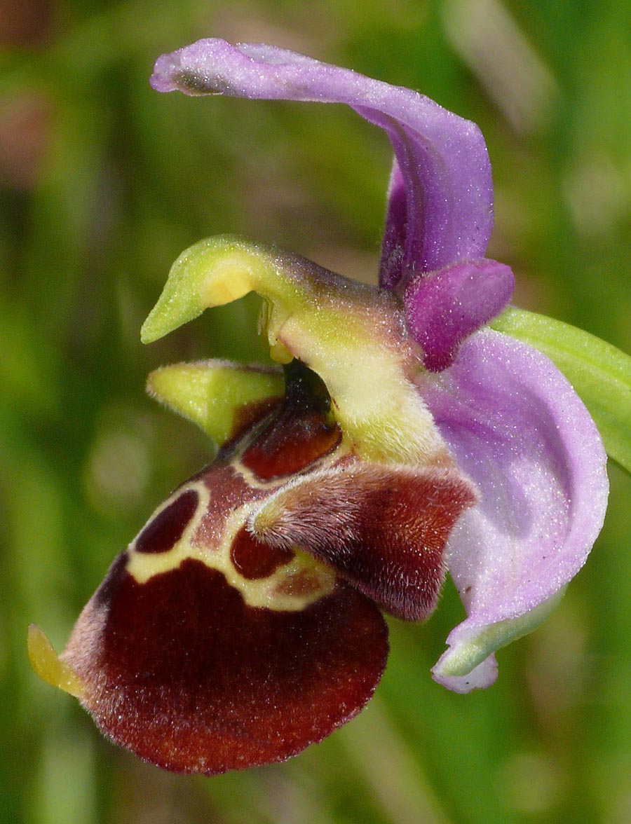 O.demangei was first described as a full species by Delforge from the department of Drome in 2015 and is named after the late French botanist Michel Demange. It's a member of the O. tetraloniae group which take their name from the tetralonia genus of bees representing the groups most significant pollinators. This species has been known for many years, notably from the Vercors where it was seen as a link between the O. scolopax and O. fuciflora groups, perhaps even a stabilized hybrid. It was referred to as O. pseudoscolopax by some authorities but this was to confuse it with O. linearis and others of the southern French O. tetraloniae group. In any event it had gone without any serious study until 2015 when Scappaticci recognized it as O. fuciflora ssp demangei and Delforge subsequently described it as a full species. This is a somewhat variable orchid that can appear in different forms, sometimes mimicking other fuciflorid species but more usually with only limited flaring of the lip margins. A key identifying characteristic however is its size, which at an average length of 10mms, is little bigger than the flower of O. passionis and certainly smaller than most other similar species. The lip is usually globular, rarely scolopaxoid and exhibits a complete, though not always particularly dense band of marginal hair. The basal field and stigmatic cavity are wide and give the orchid a hunched shoulders look. The speculum is often complicated and can exhibit strong yellow or cream candicoid lining. The inflorescence is widely spaced but stems may carry as many as ten individual flowers. The pictures are all from the Vercors, dating from the second week of May. |