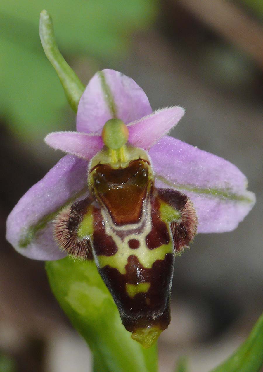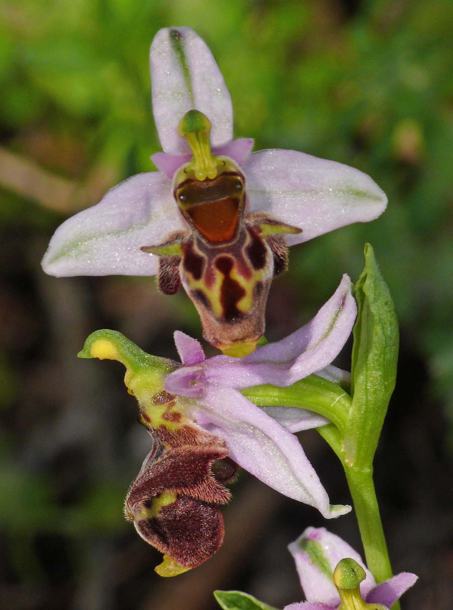 O. dodekanensis was originally described by Kretzschmar and Kreutz from Rhodes in 2001 but a similar species had already been described by Renz and Taubenheim from Turkey in 1991 and named O. heterochila. Following research by Paulus and Hirth into the latter taxon it was concluded that the two species were in fact synonymous and the name heterochila (meaning "variable lip") was retained. This was the prevailing view until recently when the opinion was reversed and the two species were again regarded as separate taxons. This view is not at all universally endorsed with many pointing to the fact that they share the same pollinator and that both are reported as very variable with formal descriptions that do not satisfactorily distinguish them. These two species are extremely difficult to differentiate and the authors cannot present this page as authoritative. O. dodekanensis has a similar range and often grows in close association with O. heterochila with both tolerating a range of habitat but favouring a degree of shade. The key distinguishing features are lip shape and flowering period. The lip of the former is strongly reflexed and forms a pleat at the rear which gives the lip a very narrow appearance whereas the latter tends to range from scolopaxoid to fuciflorid configurations. These are however variable species and lip shape can only be regarded as a guide. The second feature that shows a likely difference is flowering time and this in the authors experience is a more valid differentiator. O. dodekanensis flowers from the end of February to late March whereas O. heterochila does not start until early March and will therefore be fresh at a time when O. dodokanensis is fading. The pictures are from Samos and date from the last week of March. |