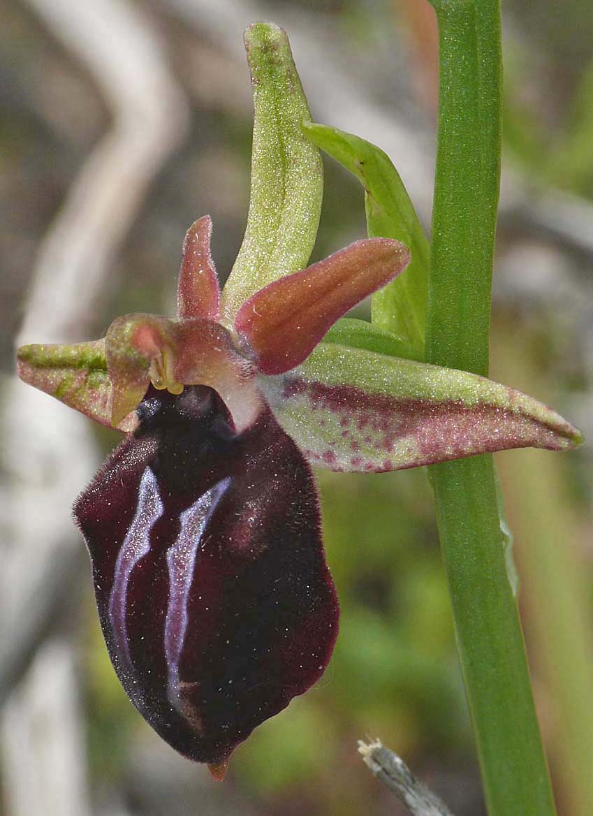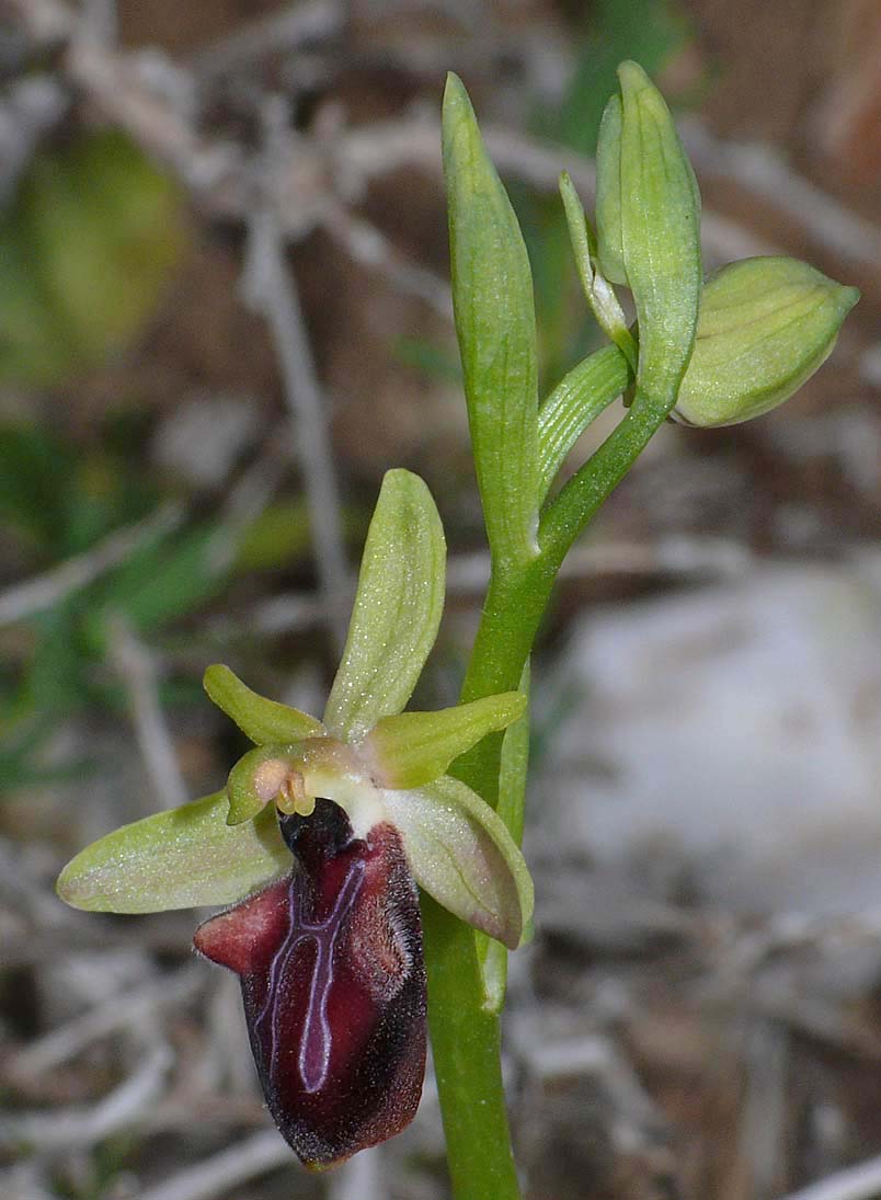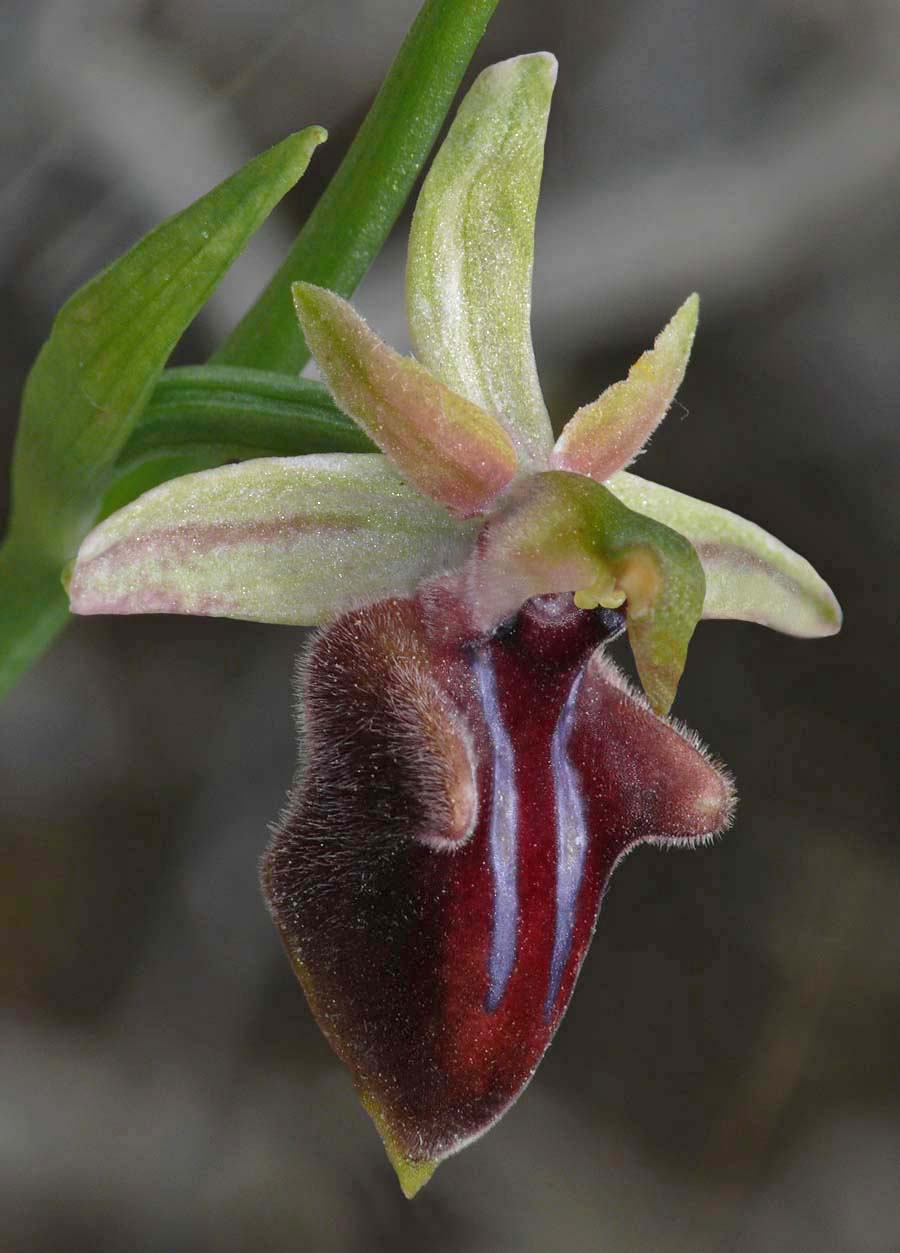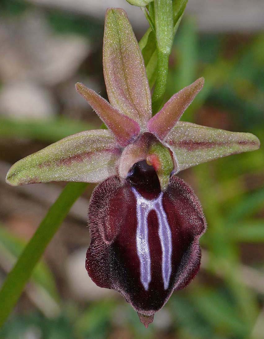 In 2005, Helmut Presser studied several Cretan colonies of what were thought to be the typical Greek O. mammosa but it was eventually concluded that these plants were in fact the same as those collected from Gavdos and named O. doerfleri. By way of complication Messrs Baumann and Lorenz (also in 2005) had separately been reviewing this species and named it O. mammosa subsp falsomammosa. Given that the original name (O. doerfleri) had been incorrectly linked to a species of the O. reinholdii group, falssomammsa may be considered more appropriate and the name that goes forward. Nonetheless it has now been agreed that O. mammosa does not occur on Crete and that currently the group is represented by O. doerfleri. Some authorities believe that O. doerfleri is an ancient intermediate between O. mammosa and O. spruneri. This species is smaller flowered than O. mammosa, the plant itself more spindly and its sepals are generally lighter in colour. The sepals, whilst usually split into typical O. mammosa group colour hemispheres, can often be a uniform green which gives the flower a close resemblance to O. gortynia. It is reported that around a third of all flowers possess pink sepals, this being a feature unknown outside Crete and adding weight to the postulation of its link with O. spruneri. The photographs date from mid April at which time the plants were just coming into flower and were taken in eastern Crete where the species is considered most common. |