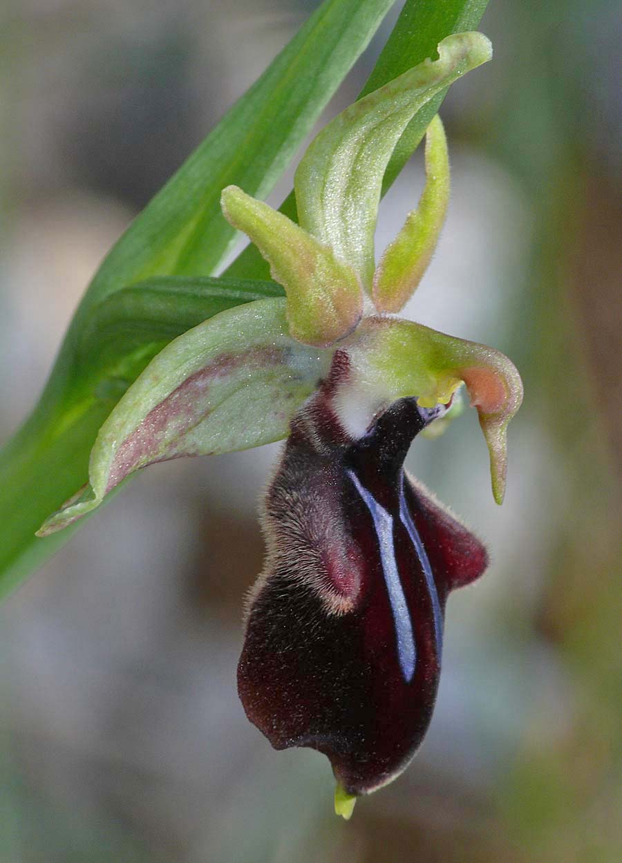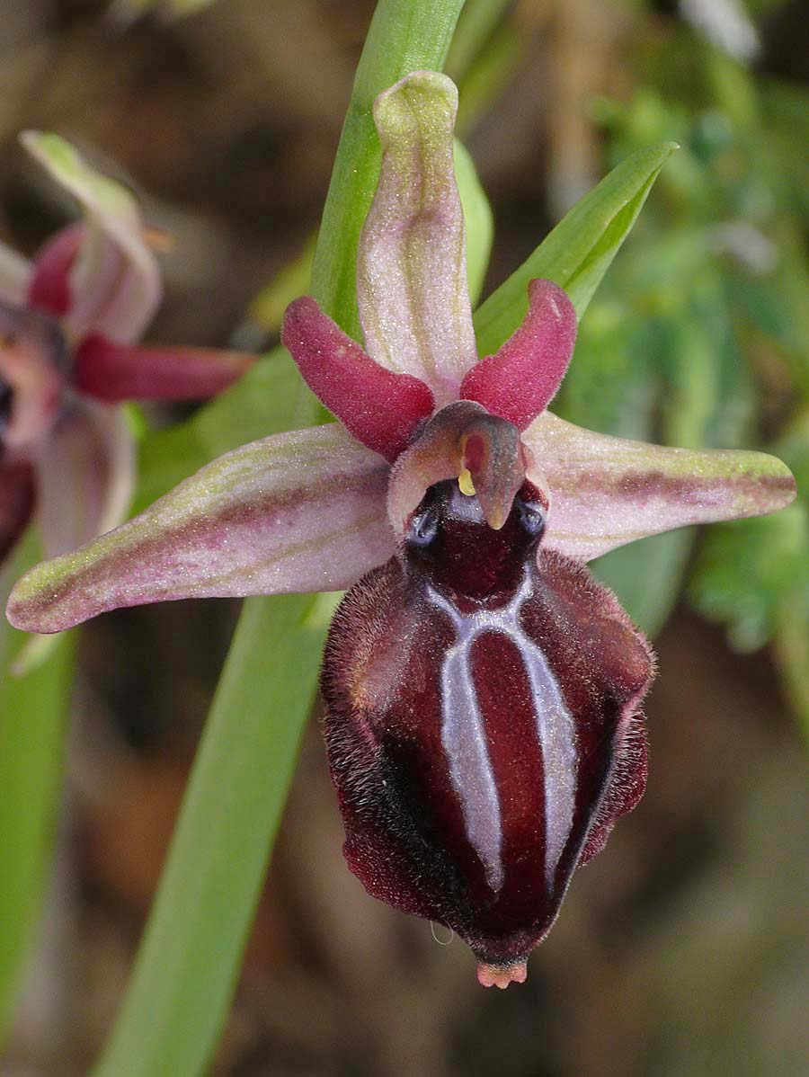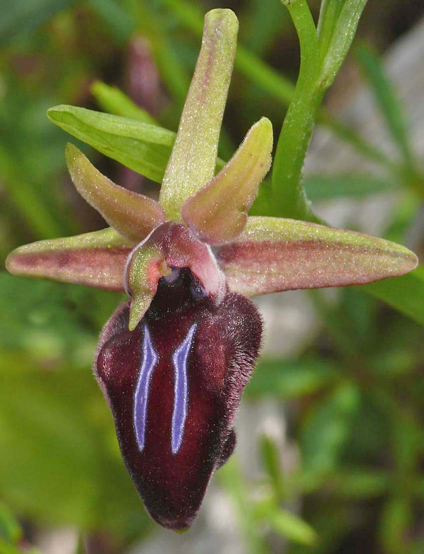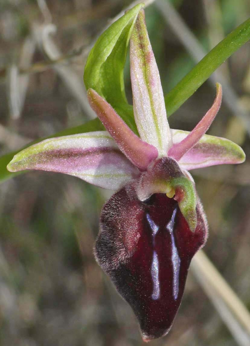 In 2005, Helmut Presser studied several Cretan colonies of what were thought to be the typical Greek O. mammosa but it was eventually concluded that these plants were in fact the same as those collected from Gavdos and named O. doerfleri. By way of complication Messrs Baumann and Lorenz (also in 2005) had separately been reviewing this species and named it O. mammosa subsp falsomammosa. Given that the original name (O. doerfleri) had been incorrectly linked to a species of the O. reinholdii group, falssomammsa may be considered more appropriate and the name that goes forward. Nonetheless it has now been agreed that O. mammosa does not occur on Crete and that currently the group is represented by O. doerfleri. Some authorities believe that O. doerfleri is an ancient intermediate between O. mammosa and O. spruneri. This species is smaller flowered than O. mammosa, the plant itself more spindly and its sepals are generally lighter in colour. The sepals, whilst usually split into typical O. mammosa group colour hemispheres, can often be a uniform green which gives the flower a close resemblance to O. gortynia. It is reported that around a third of all flowers possess pink sepals, this being a feature unknown outside Crete and adding weight to the postulation of its link with O. spruneri. The photographs date from mid April at which time the plants were just coming into flower and were taken in eastern Crete where the species is considered most common. |
