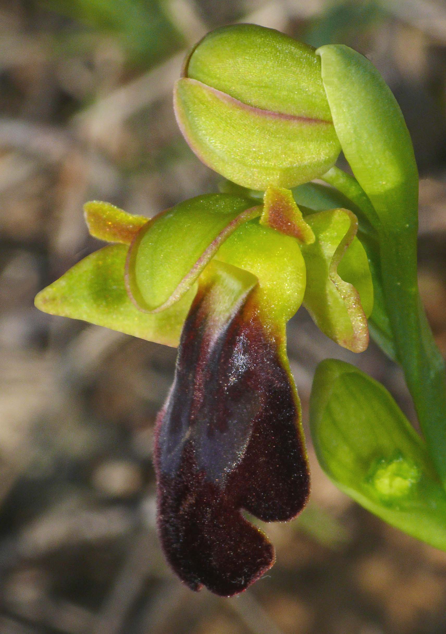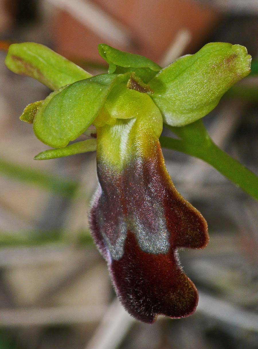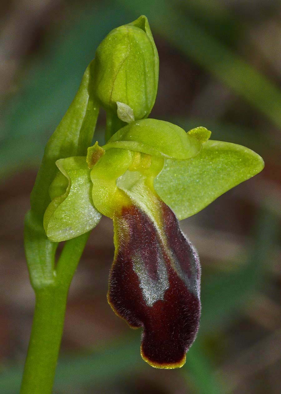 These studies resulted in the repositioning of some species and also the description of new species such as O. delforgei and O. malacitana. In the case of O. forestieri it emerged that the small flowered variant was a separate taxon and subsequently named O. delforgei whilst the larger flowered variant retained the name of O. forestieri. It was further concluded that plants in Southern France and northern Spain formerly regarded as O. lupercalis, were in fact synonymous with O. forestieri. At present O. lupercalis still seems to be regarded as a valid species elsewhere in its range but this position is unclear and requires study. O. forestieri is now included in the O. obaesa group and thought to be closely related to both O. sulcata and O. vasconica. It is a fairly robust, tall stemmed plant with stalked flowers appearing at short intervals up the stem. The flowers are large and usually present a more colourful appearance than other Pseudorchis with which it can sometimes grow. This impression is created by the normally wide yellow margin and reddish tones that often permeate the speculum. O. forestieri is an early flowerer and as was the case with the plants illustrated here, can be in full flower by the middle of March. The pictures come from the Marseille region of Southern France and also from populations on the northern coast of Spain which cannot as yet be confirmed as being part of this species newly defined distribution. |
