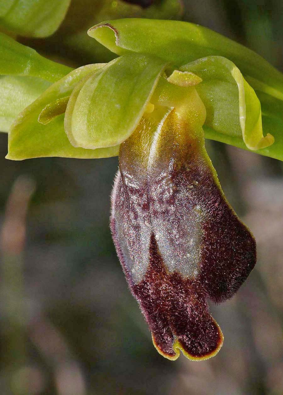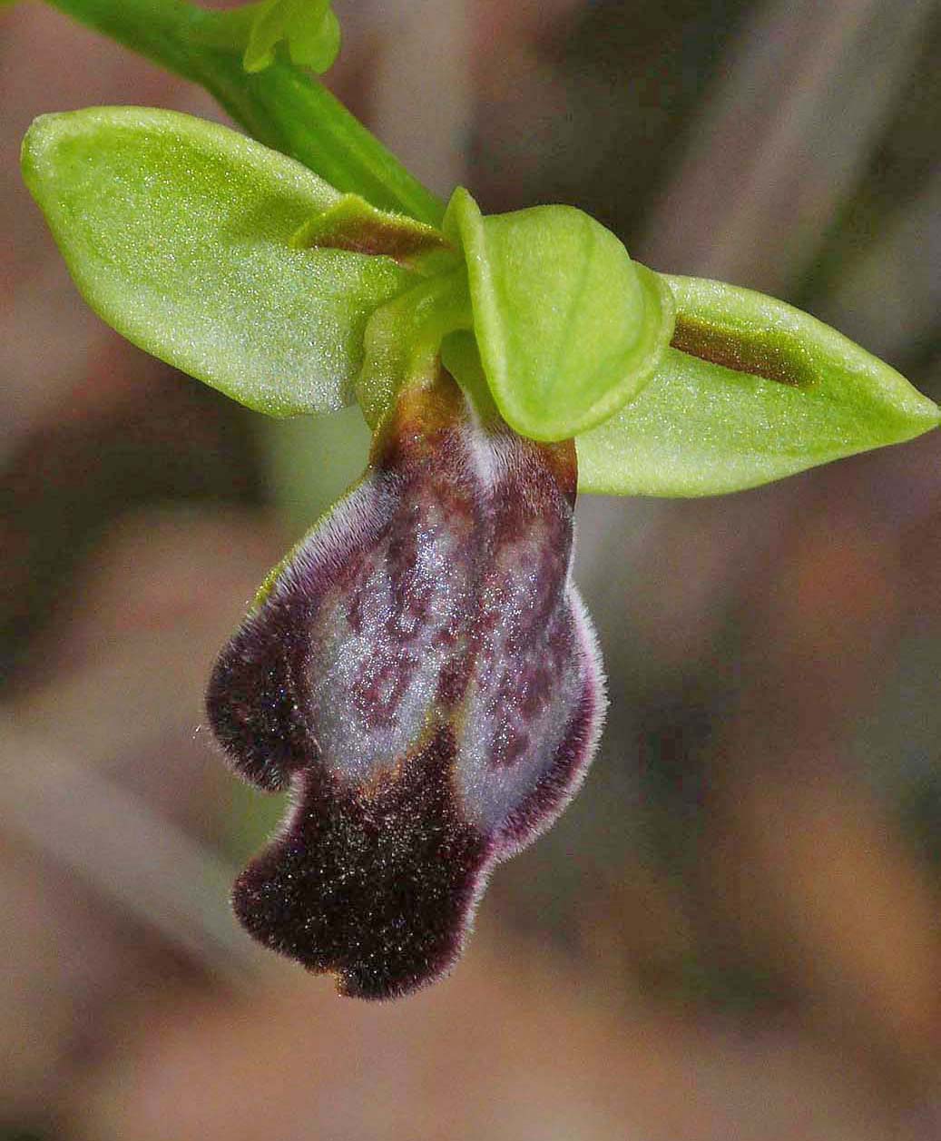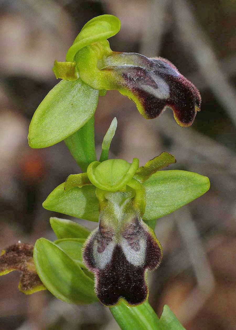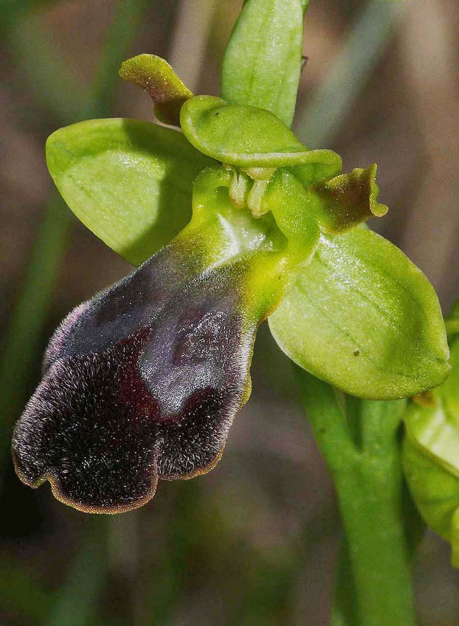 was first described from Lisbon, Portugal in 1800 (Link) and its name refers to the darkness of the labellum. This characteristic led to the orchid acquiring the common name Dull or Sombre Ophrys.  This species, or perhaps more correctly the name, O. fusca, was the original plant from which, over the years, numerous subspecies have been identified and more recently, many new species described. The term O. fusca (sl) is still in common use as an inclusive grouping that describes unidentified Pseudophrys of a similar appearance. It was first thought that O. fusca occurred throughout the Mediterranean but current understanding believes it to be restricted to the western countries of the region, particularly North Africa, southern France, Spain and Portugal. This is a species that can be abundant and no more so than in Portugal, where it grows in a locally distinct form that may soon be accorded separate species status (see pictures 1,9 and 10 which are examples from Lisbon). It is not particularly choosy in its choice of habitat but shows a preference for Alkaline substrates growing as a relatively tall plant with up to ten large flowers. Where it grows with other Pseudophrys such as O. arnoldii and O. forestieri it readily hybridizes, creating numerous intermediates. In its pure form it is most easily distinguished by its dark, blackish/purple colouration and the large, raised longitudinal prominences which usually produce a significant curve in the lip. The speculum is normally quite dull, being dark blue/grey and sometimes with a mottled appearance. The central Portuguese populations, as mentioned above, are however rather more colourful, with a lighter speculum which often includes two lighter crescents at the tip and a more noticeable yellow margin. | ||