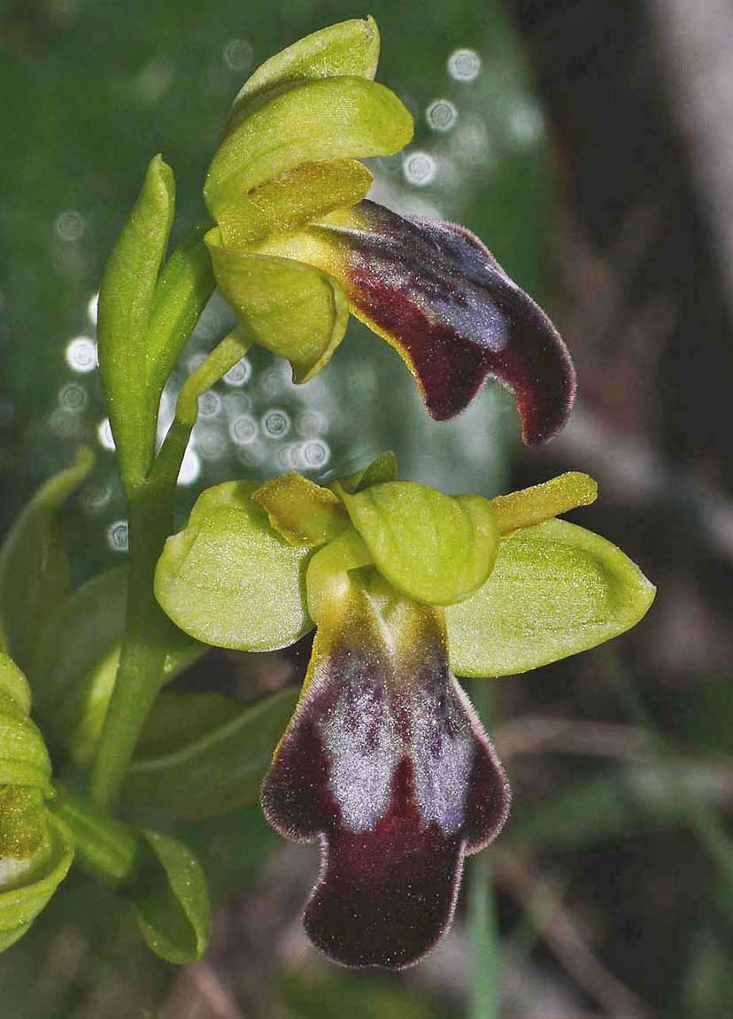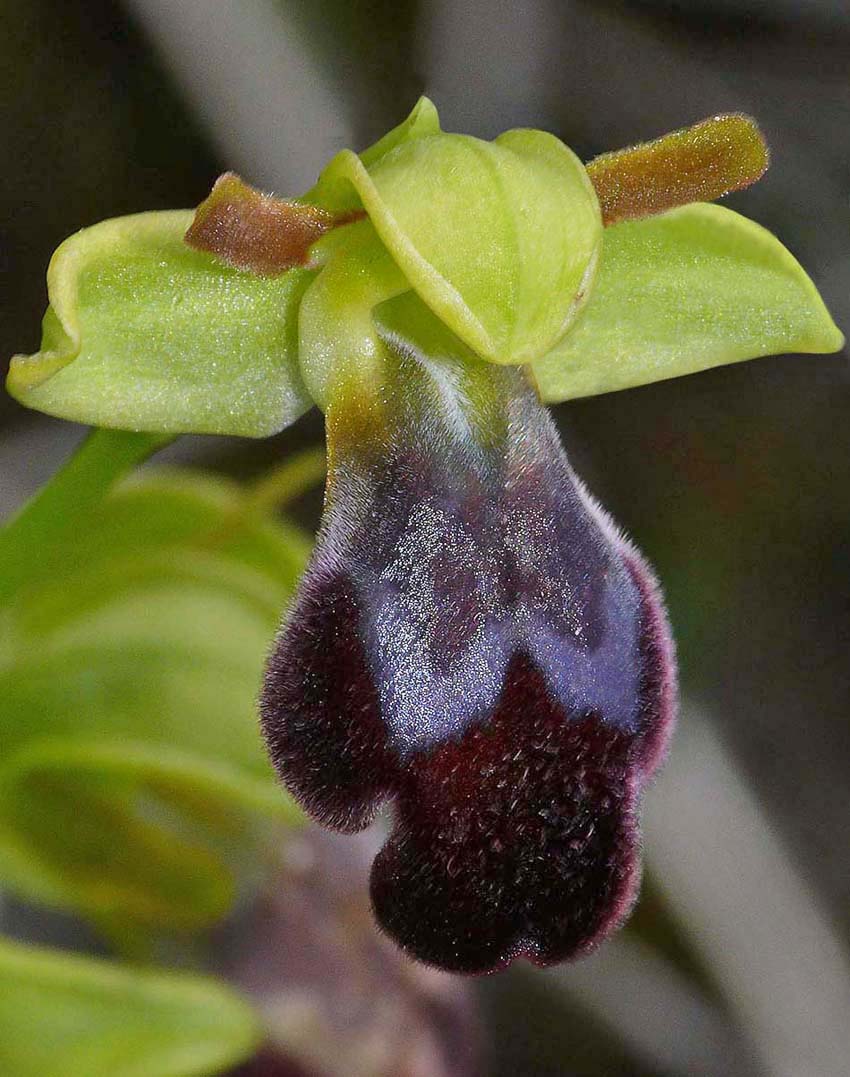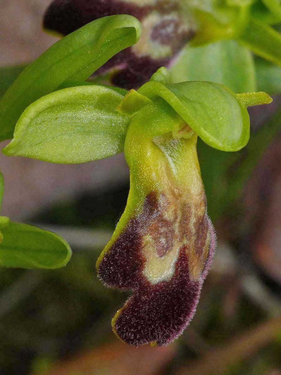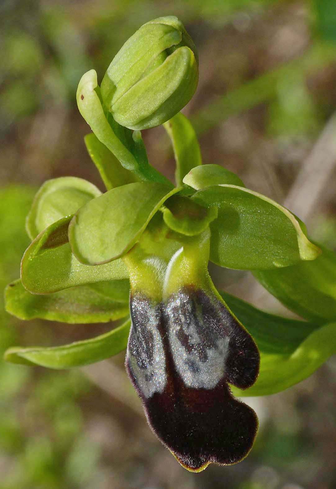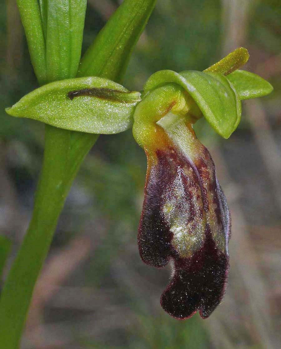 was first described from Lisbon, Portugal in 1800 (Link) and its name refers to the darkness of the labellum. This characteristic led to the orchid acquiring the common name Dull or Sombre Ophrys.  This species, or perhaps more correctly the name, O. fusca, was the original plant from which, over the years, numerous subspecies have been identified and more recently, many new species described. The term O. fusca (sl) is still in common use as an inclusive grouping that describes unidentified Pseudophrys of a similar appearance. It was first thought that O. fusca occurred throughout the Mediterranean but current understanding believes it to be restricted to the western countries of the region, particularly North Africa, southern France, Spain and Portugal. This is a species that can be abundant and no more so than in Portugal, where it grows in a locally distinct form that may soon be accorded separate species status (see pictures 1,9 and 10 which are examples from Lisbon). It is not particularly choosy in its choice of habitat but shows a preference for Alkaline substrates growing as a relatively tall plant with up to ten large flowers. Where it grows with other Pseudophrys such as O. arnoldii and O. forestieri it readily hybridizes, creating numerous intermediates. In its pure form it is most easily distinguished by its dark, blackish/purple colouration and the large, raised longitudinal prominences which usually produce a significant curve in the lip. The speculum is normally quite dull, being dark blue/grey and sometimes with a mottled appearance. The central Portuguese populations, as mentioned above, are however rather more colourful, with a lighter speculum which often includes two lighter crescents at the tip and a more noticeable yellow margin. | ||