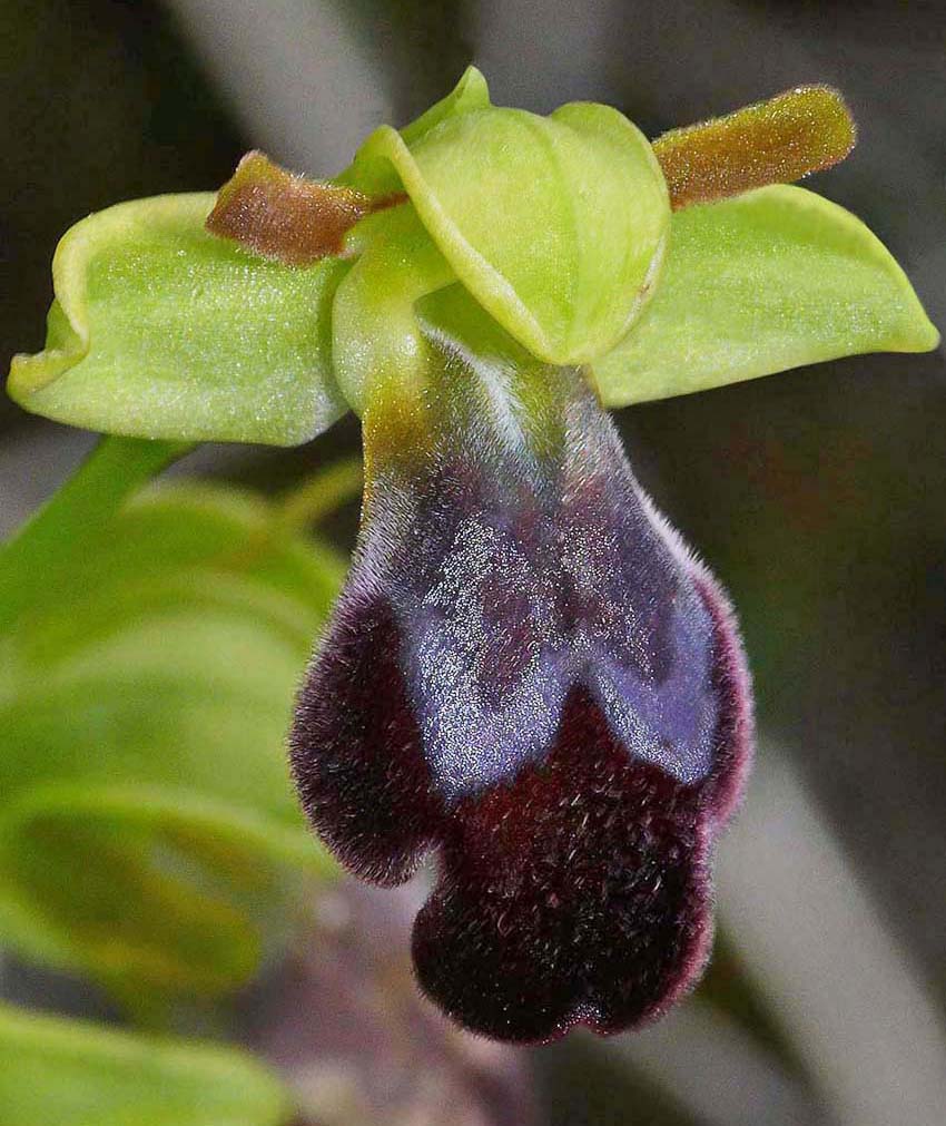 This species, or perhaps more correctly the name, O. fusca, was the original plant from which, over the years, numerous subspecies have been identified and more recently, many new species described. The term O. fusca sl. is still in common use as an inclusive grouping that describes unidentified Pseudophrys of a similar appearance. O. fusca was originally thought to occur throughout the greater Mediterranean region but over the last twenty years, various studies and the recognition of numerous new species have led to the conclusion that its range is now restricted to a relatively small area of central Portugal. It is not particularly demanding in its choice of habitat but does show a preference for alkaline substrates, where it grows as a relatively tall plant with up to ten large flowers. It is most easily distinguished by its dark, blackish/purple colouration and by the large, raised longitudinal prominences and relatively shallow V shaped groove which attenuates just above the specular crescents. The lip is relatively flat but recurved at the distal end and usually exhibits a yellow or orange margin. The speculum is quite dull, being dark blue/grey, sometimes mottled, but sitting above prominent, shiny silver/blue crescents. Accepting that O. fusca is indeed limited to this relatively small area of Portugal it really only encounters two similar Pseudophrys with which it can be confused. O. pintoi is a shorter plant with significantly smaller flowers and O. bilunulata which is similarly proportioned but easily distinguished, not least by its broad yellow lip margin. |