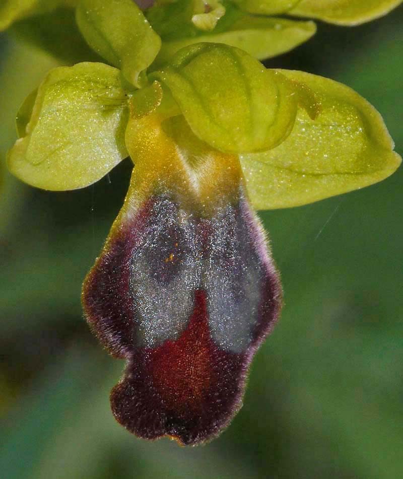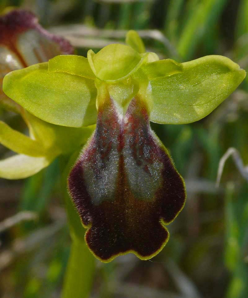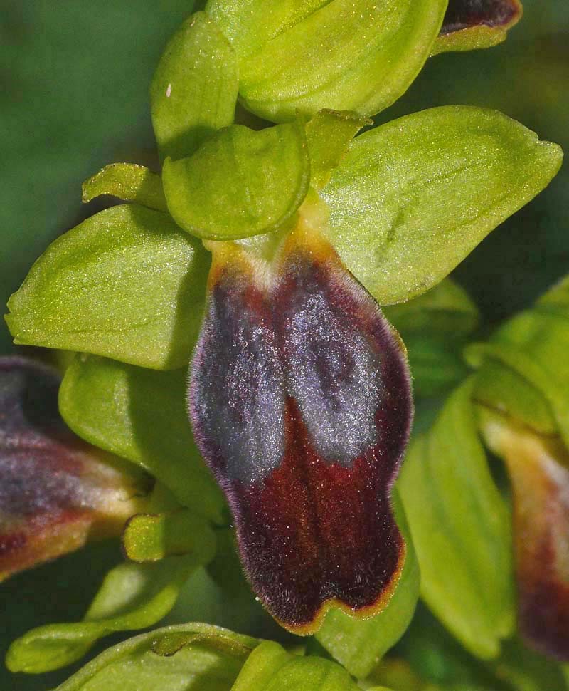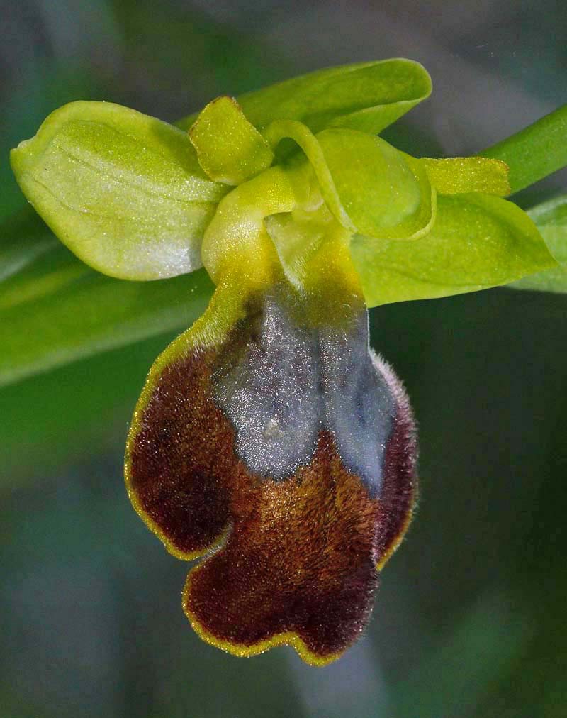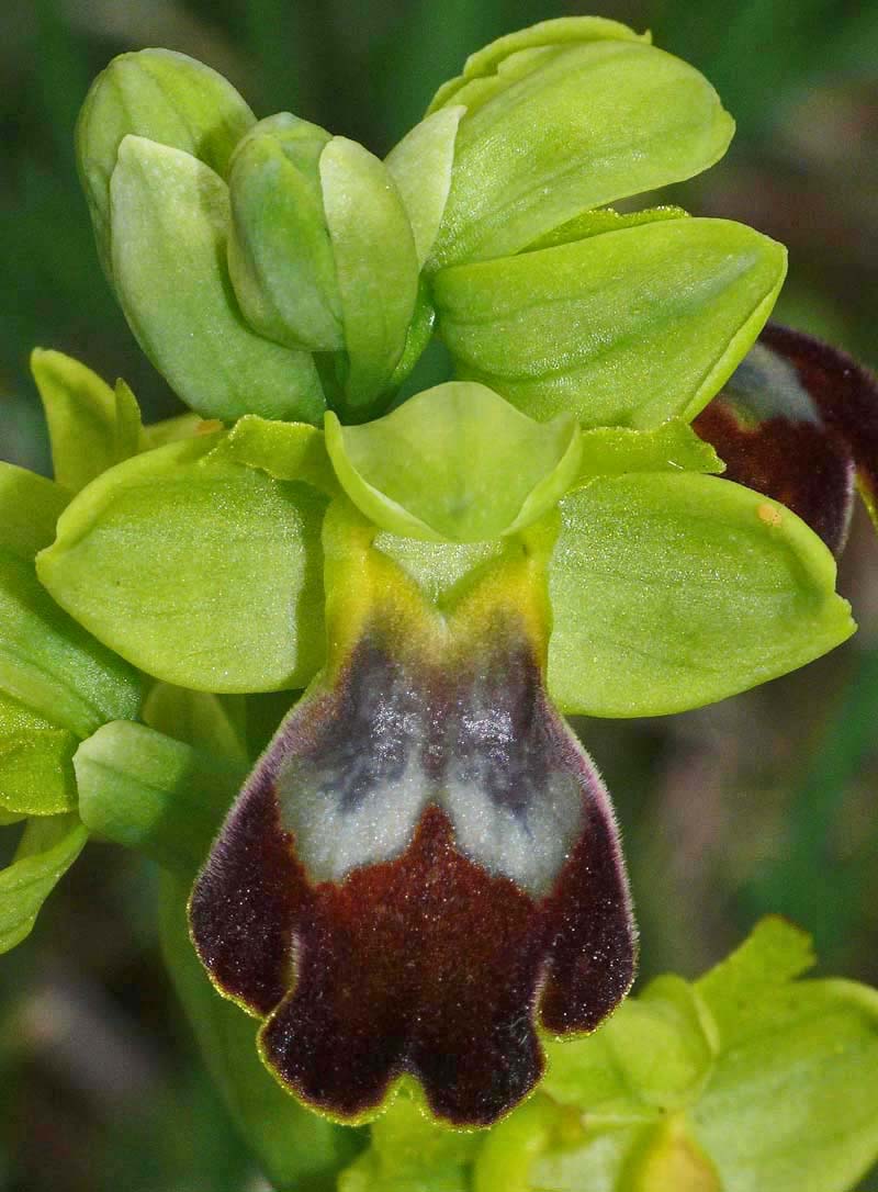 This Ophrys was first described by Delforge from Siracusa, Sicily in 2004 and is a member of the O. funerea group of Pseudophrys. It is one of several Sicilian species that have generated considerable professional disagreement, principally between Messrs Gack and Delforge. According to he latter, O. gackiae was first formally described by him in 2004, but named in honour of Gack as a recognition of the research she had undertaken in the early 1990's, which had resulted in the plant being provisionally named O. florentina-fusca. Delforge's detractors maintain that O. gackiae is not that plant and that it was O. flammeola that should bear the name of the German biologist. The plant studied by Gack was thought to be hybridogenous, with O. lutea and O. fusca sl as progenitors and it's clear that O. flammeola more obviously demonstrates these characteristics than does O. gackiae. The Sicilian Pseudophrys are a difficult group to separate and the main sources of confusion arise when trying to separate O. sabulosa, O. gackiae and O. lupercalis. There are however features which although difficult to demonstrate through photography, may help in the field, the first of these being the significantly larger flowers and general sturdiness of O. sabulosa . Both O. gackiae and O. lupercalis bloom much earlier and will be in poor condition by the time O. sabulosa appears. O. gackiae is a small plant with few flowers (rarely more than 5) whereas O. sabulosa and to a lesser extent O. lupercalis are both more robust and more floriferous (up to 10 flowers per stem). Finally, the latter's lip has a smaller average width to length ratio and therefore appears to be both longer and narrower. These pictures date from the second two weeks of April. |