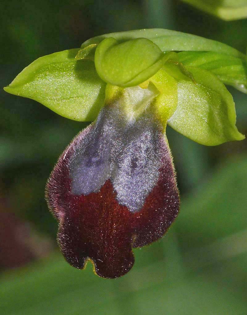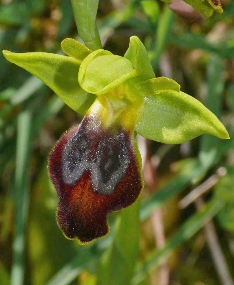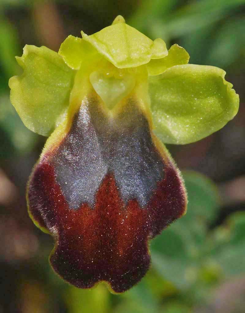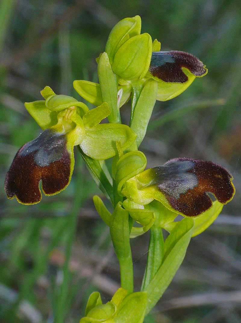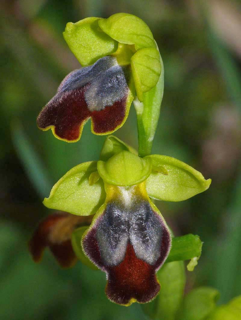 This Ophrys was first described by Delforge from Siracusa, Sicily in 2004 and is a member of the O. funerea group of Pseudophrys. It is one of several Sicilian species that have generated considerable professional disagreement, principally between Messrs Gack and Delforge. According to he latter, O. gackiae was first formally described by him in 2004, but named in honour of Gack as a recognition of the research she had undertaken in the early 1990's, which had resulted in the plant being provisionally named O. florentina-fusca. Delforge's detractors maintain that O. gackiae is not that plant and that it was O. flammeola that should bear the name of the German biologist. The plant studied by Gack was thought to be hybridogenous, with O. lutea and O. fusca sl as progenitors and it's clear that O. flammeola more obviously demonstrates these characteristics than does O. gackiae. The Sicilian Pseudophrys are a difficult group to separate and the main sources of confusion arise when trying to separate O. sabulosa, O. gackiae and O. lupercalis. There are however features which although difficult to demonstrate through photography, may help in the field, the first of these being the significantly larger flowers and general sturdiness of O. sabulosa . Both O. gackiae and O. lupercalis bloom much earlier and will be in poor condition by the time O. sabulosa appears. O. gackiae is a small plant with few flowers (rarely more than 5) whereas O. sabulosa and to a lesser extent O. lupercalis are both more robust and more floriferous (up to 10 flowers per stem). Finally, the latter's lip has a smaller average width to length ratio and therefore appears to be both longer and narrower. These pictures date from the second two weeks of April. |