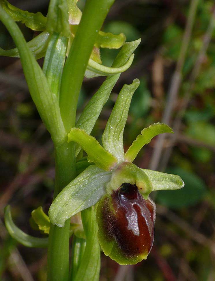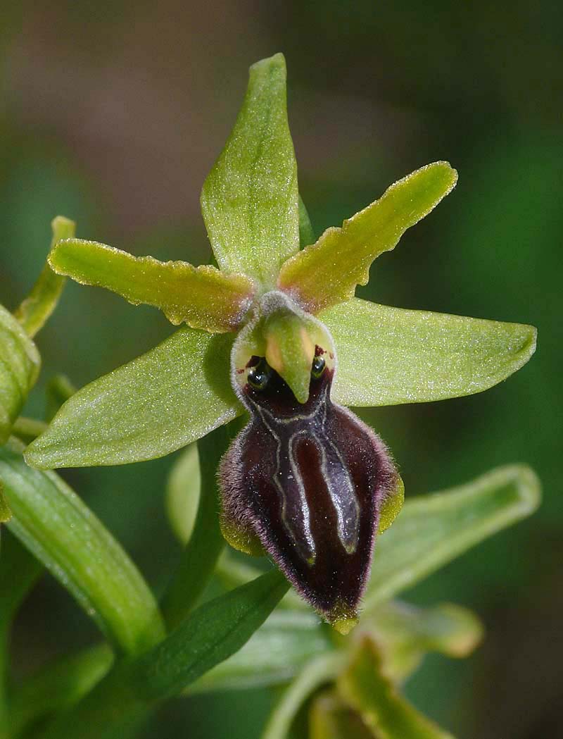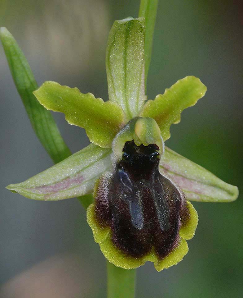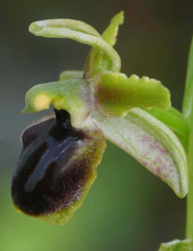 This species had been known from the north eastern foothills of Mount Etna for some years but until it was formally recognized in 2010, had languished in un-named obscurity, being variously viewed as a variety of O. sphegodes or a semi stabilized hybrid involving O. passionis, a species to which it bears a close resemblance. The full range and population density of O. grassoana has not yet been fully established but it's currently thought to be a scarce orchid, growing in small colonies in a limited area centred on Linguaglossa, a small town lying in the northern shadow of Etna. This is a district heavily scarred by volcanic activity resulting in lava trails and fields of varying ages and states of stabilisation. O. grassoana shows a preference for flows that are of relatively recent origin, being at its most frequent on those that were thrown up during the last hundred years. This is a habitat that does not support too many orchids, O. brancifortii being one of the few other species that shows a similar tolerance. O. grassona is a distinctive species showing little variation. The stigmatic cavity is always dark, the perianth is green, occasionally lightly flushed pink and there is normally a broad yellow margin to the lip. Pilosity is at its heaviest, though not confined to the lateral lobes and the lobes themselves are well defined but small. It's in flower from late March to April and the pictures here come from a site along the Via Maraneve to the east of Linguaglossa, dating from the beginning of April. |