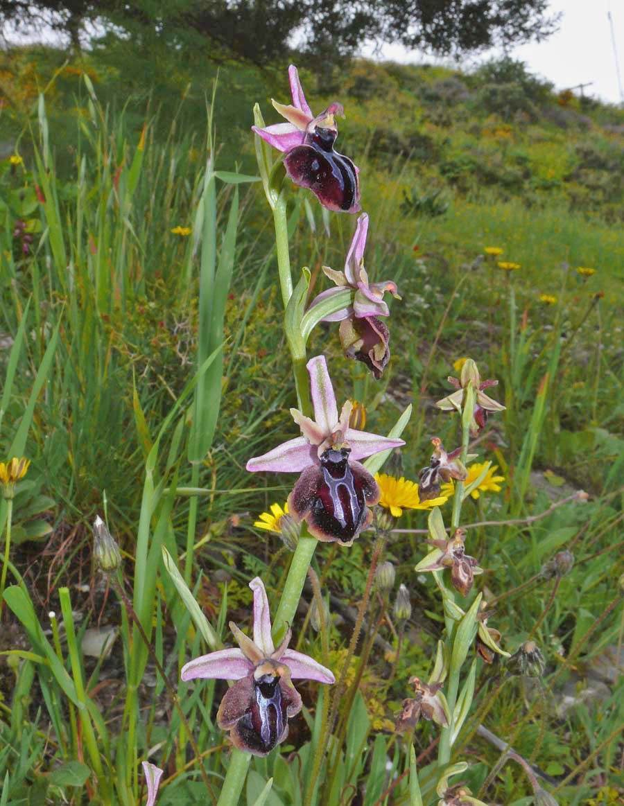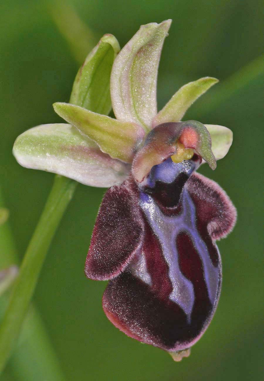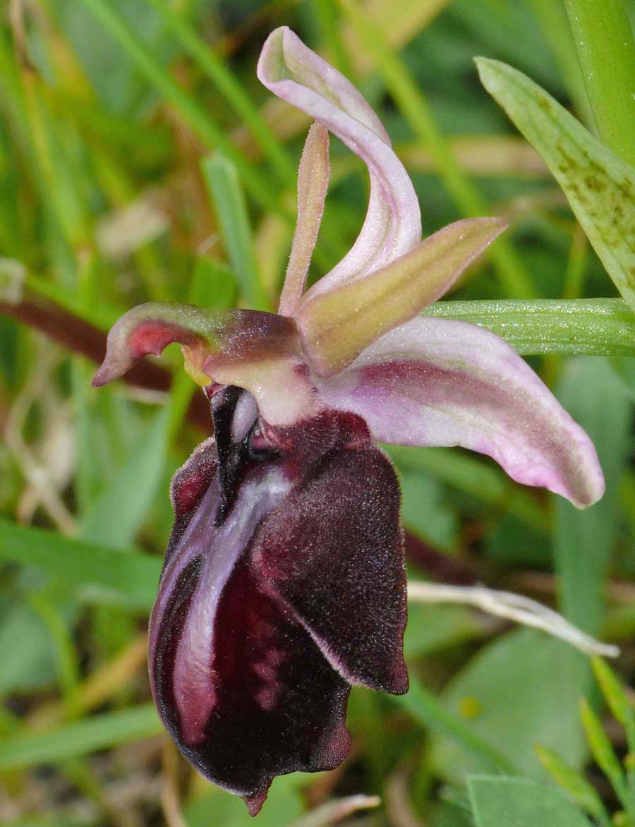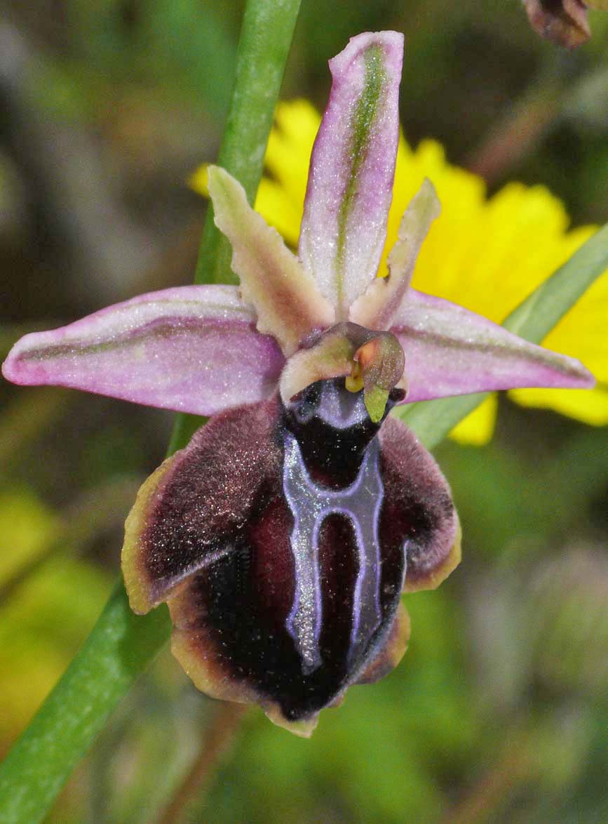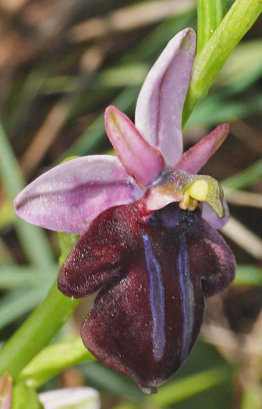 This species was first described by Fleischmann from Chania, Crete in 1925 and was then named O. sphaciotica by virtue of its discovery in the Sphakia region. Subsequent research by Kretzschmar and Kretzschmar has however determined that the species Fleischmann described was unlikely to be O. grigoriana and probably just a robust O. spruneri. The name O. grigoriana was therefore prioritized, this referring to the village of Grigoria which is at the heart of the orchids range. This species is endemic to Crete and although it can turn up throughout the island, it is largely confined to the mountainous regions between Zaros and Akoumia, in the south of central Crete. The flower of O. grigorina is probably the largest of any Ophrys species but whilst this feature is diagnostic in pure examples of the species, such populations are becoming scarce. Apart from its distinctive size, O. grigoriana is separable from O. spruneri in only small characteristics such as its proportionately larger stigmatic cavity and darker lip colouration. O. grigoriana seldom occurs in pure populations and will most frequently be found growing in close association with O. spruneri, a curious phenomenon that is not fully explained by identical habitat preference. Inevitably intermediates are common, if however you regard O. grigoriana as pure only when lip length exceeds 30mm, it is a rare orchid indeed. If defined by a lip length exceeding 15mm it is relatively frequent. It is a highly variable orchid that can exhibit differing perianth and lip margin colouration and a labellum which can be entire or perhaps more frequently three lobed.The flower does appear, both in the field and photographs to be broader and thicker set than O. spruneri. Picture seven depicts a highly unusual hybrid with O. cretica. The photos date from the second week of April. |