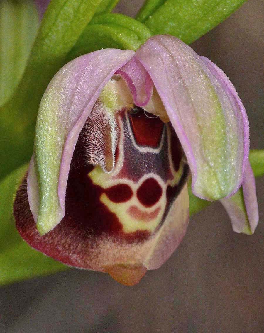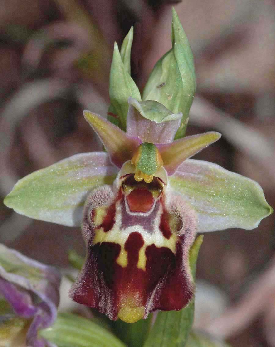 The fuciflorid species of the Aegean have been much studied over the last few years and O. halia was one of several newly recognized species to be described. This research is ongoing and it seems highly likely that more new species will be identified in the years to come. The Aegean islands are proving fertile ground for species hunters and the rate of splitting has become a source of scepticism for some botanical authorities. Having said this, O. halia is one of the more convincing new species and is relatively easy to identify, even on Rhodes which holds several similar Ophrys of the same and closely related groups. This species is somewhat variable in terms of lip shape and specular pattern but there are two features which can be regarded as characteristic and reasonably consistent. The first of these are the petals which are characteristically both erect and elongated in a similar way to those of O. linearis (although they are less acuminate and more triangular in shape). Secondly and importantly the sepals are invariably a base colour of pink with a green wash that although always present may vary from a light shading to a heavy coating that can virtually eliminate the pink colouration altogether. These photos date from the first two weeks of April and are from southern Rhodes around Kattavia. |