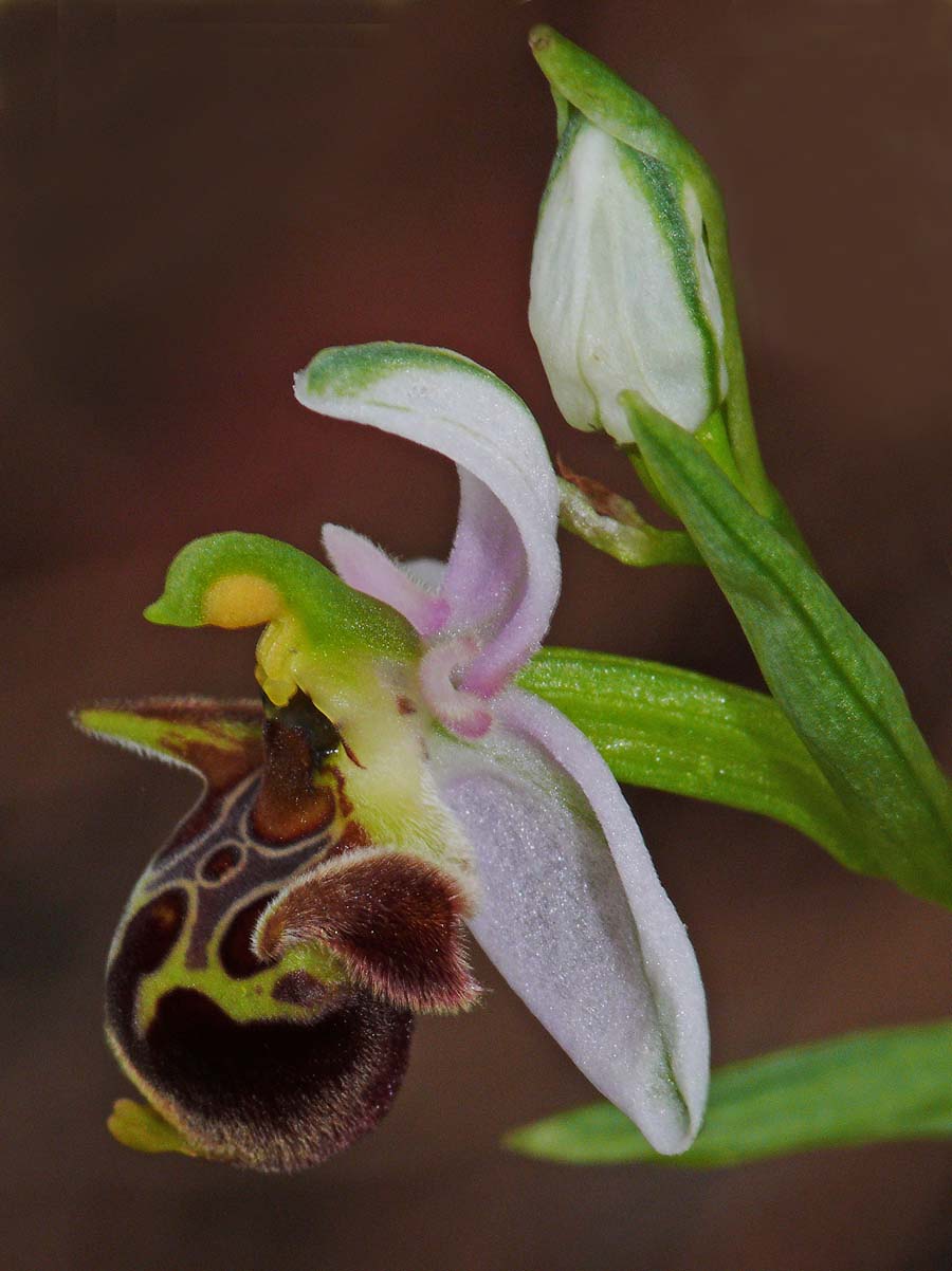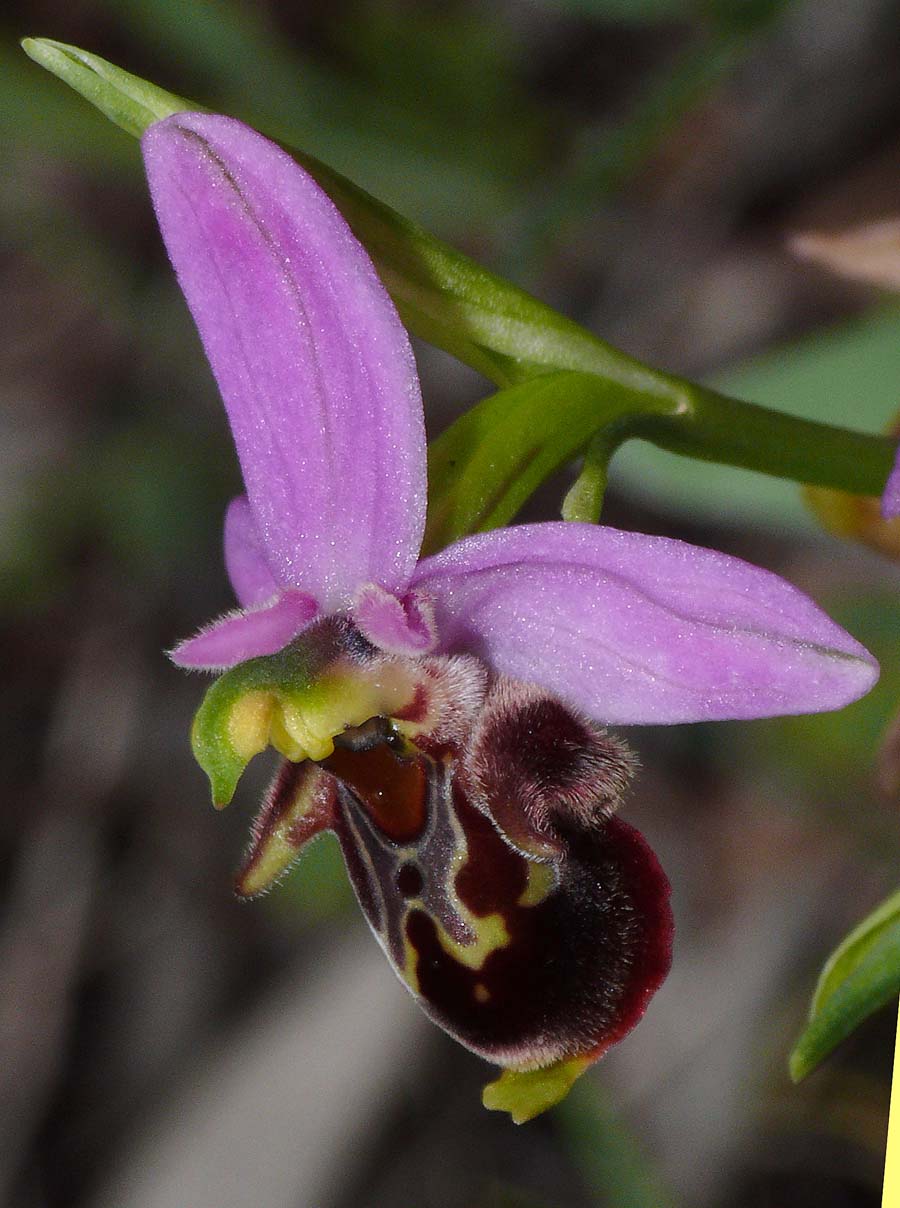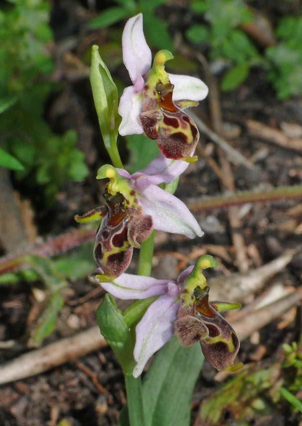This was the prevailing view until recently when the opinion was reversed and the two species were again regarded as separate taxons. This view is not at all universally endorsed with many pointing to the fact that they share the same pollinator and that both are reported as very variable with formal descriptions that do not satisfactorily distinguish them. These two species are extremely difficult to differentiate and the authors cannot present this page as authoritative. O. heterochila was originally thought to be endemic to Rhodes but has subsequently been discovered on other of the Aegean islands, notably Chios, Samos and Lesbos. It's a member of the eastern Mediterranean O. heldreichii group, which although local, can be abundant in a variety of habitats. A key differentiator between O. heterochila and O. dodekanensis is flowering time with the latter declining as the former first appears in mid March. The former also differs in that its lip shows a tendency towards a fuciflorid form whereas the latter generally appears long and thin due to the strongly reflexed lobes. Both species may be differentiated from the similar O. minutula and O. cornutula by the less colourful, drabber speculum. The pictures are from Rhodes, Samos and Chios, dating from the first week of April. |