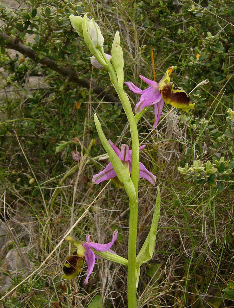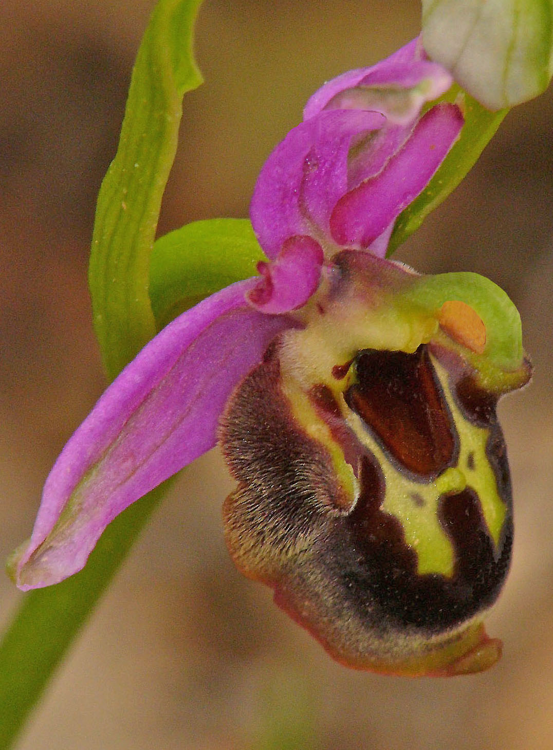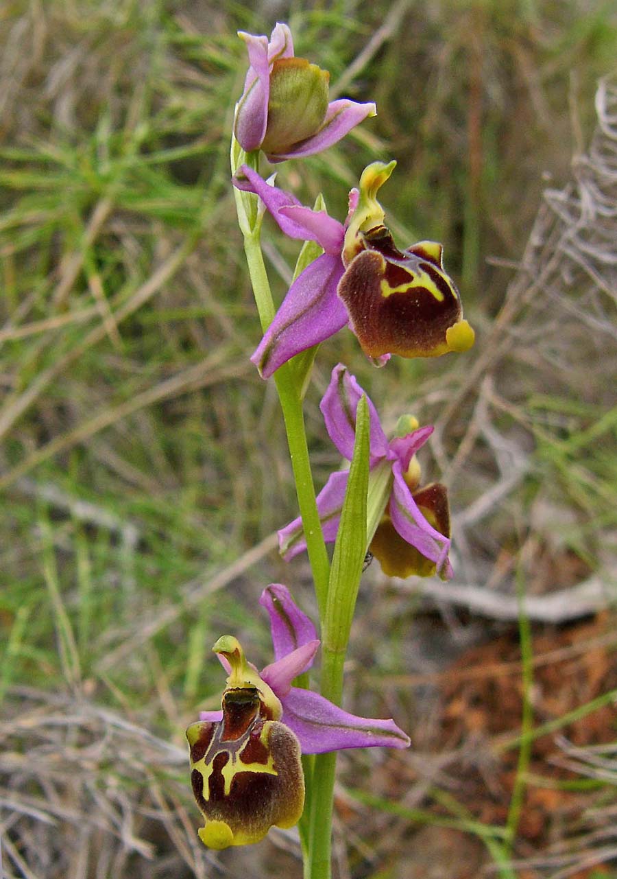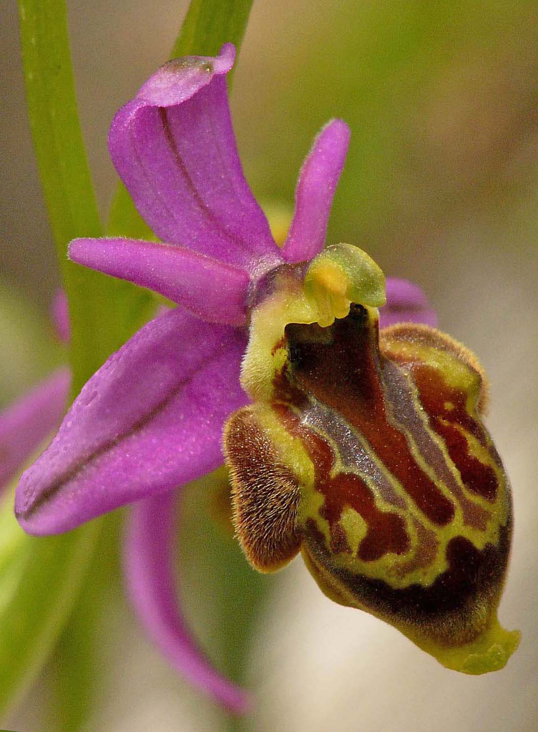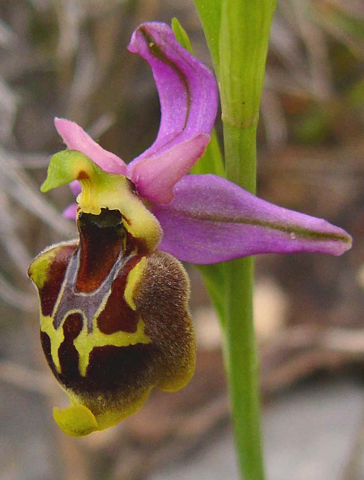 This Ophrys was first described in 1997 from the Aegean island of Chios but since that time has been found on the neighbouring islands of Lesbos, Samos and Kos, as well as in a single province of Anatolia. O. homeri is a member of the O. heldreichii group Its name commemorates Chios's most famous former inhabitant, the ancient poet Homer. In truth Homer probably never existed and was the invention of Herodotus some 400 years later in his effort to give credibility to those epic works, the Iliad and the Odyssey. Homer was deemed to be from Chios simply because he refers to "the men of Chios" in the Iliad. This is a highly variable species and easily confused with its close relative O. calypsus, an orchid which shares a similar distribution and many of its characteristics. Perhaps the most typical feature of O. homeri, is the weediness of the plant, which although not short, is spindly, with widely spaced individual flowers (see third photograph). Another important feature is the complete band of submarginal hair around the labellum of the flower, this being thick and pale coloured, contrasting with a lip that is normally dark brown and sometimes very nearly black. Speculum markings vary but are usually both elaborate and extensive, often covering the entire lip and extending along the "teddy bear" like basal swellings. The photographs all come from sites just outside the town of Pyrgi in Chios and date from the 12th of April, at which time flowering was just commencing. |