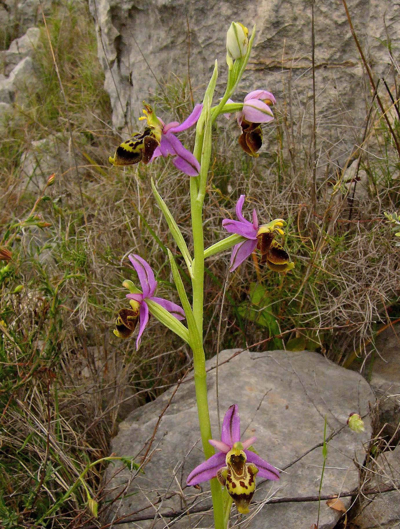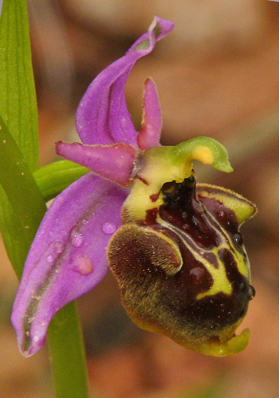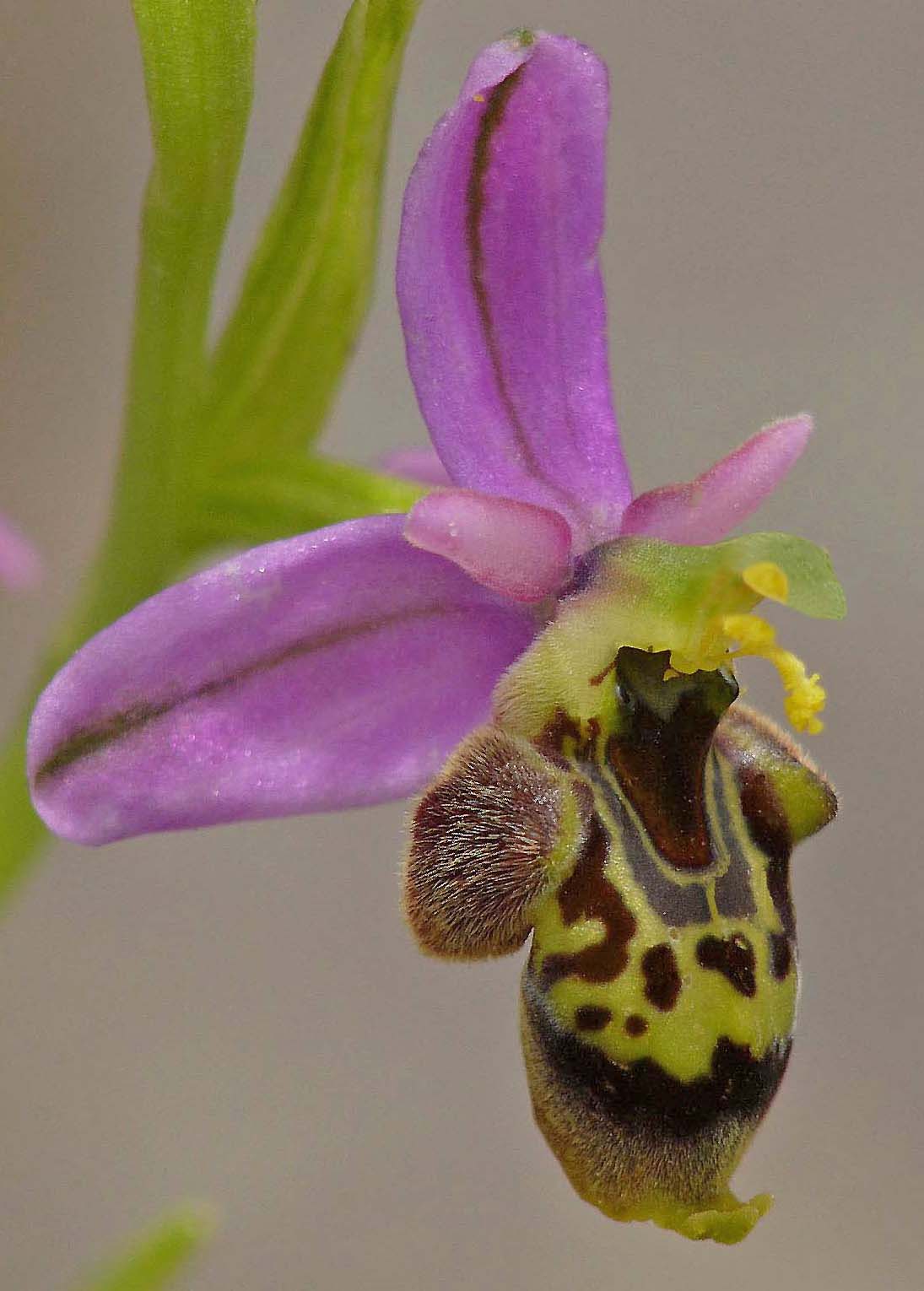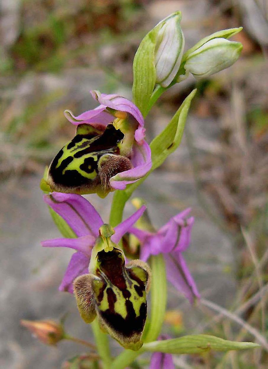 This Ophrys was first described in 1997 from the Aegean island of Chios but since that time has been found on the neighbouring islands of Lesbos, Samos and Kos, as well as in a single province of Anatolia. O. homeri is a member of the O. heldreichii group Its name commemorates Chios's most famous former inhabitant, the ancient poet Homer. In truth Homer probably never existed and was the invention of Herodotus some 400 years later in his effort to give credibility to those epic works, the Iliad and the Odyssey. Homer was deemed to be from Chios simply because he refers to "the men of Chios" in the Iliad. This is a highly variable species and easily confused with its close relative O. calypsus, an orchid which shares a similar distribution and many of its characteristics. Perhaps the most typical feature of O. homeri, is the weediness of the plant, which although not short, is spindly, with widely spaced individual flowers (see third photograph). Another important feature is the complete band of submarginal hair around the labellum of the flower, this being thick and pale coloured, contrasting with a lip that is normally dark brown and sometimes very nearly black. Speculum markings vary but are usually both elaborate and extensive, often covering the entire lip and extending along the "teddy bear" like basal swellings. The photographs all come from sites just outside the town of Pyrgi in Chios and date from the 12th of April, at which time flowering was just commencing. |