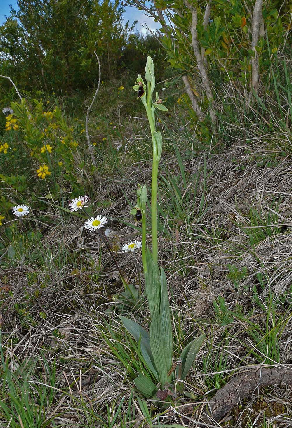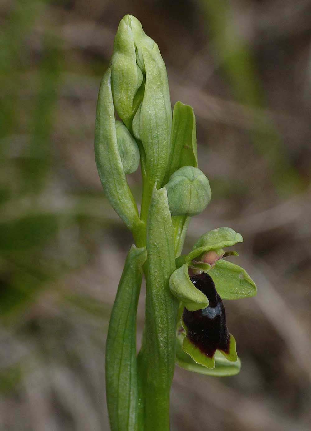 It is a very familiar and widespread Ophrys that holds some notoriety in European terms by being the most northerly occurring of its genus. It achieves this due to its presence in central Scandinavia but can otherwise be found through much of temperate mid Europe where although local, it can often be quite common. O. insectifera itself is a predominantly brown/red flower although a rare yellow margined form known as luteomarginata occurs throughout the range of the type species. The distribution of O. insectifera overlaps with that of the two yellow Fly Orchid species O. aymoninii and O. subinsectifera and hybridization is not uncommon. The pictures depict the offspring of genetic exchange between O. insectifera and O. subinsectifera and come from a location in the Navarra region of Northern Spain, near Pamplona. This particular site was the home for both the two full species and also the form luteomarginata , differentiation was nonetheless quite straightforward. The tiny size and small lateral lobes of O. subinsectifera is diagnostic, luteomarginata, although partly yellow, retains the longer arms (lateral lobes) and larger size of O. insectifera, whilst the hybrid O. insectifera x subinsectifera retains the larger size of the former and the lesser arms of the latter. See comparative illustrations 5, 6 and 7. The pictures date from the beginning of May at which time the flowers were only just beginning to fully open. |