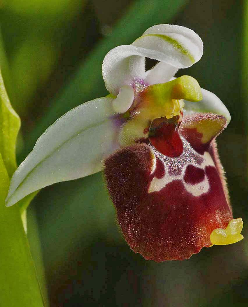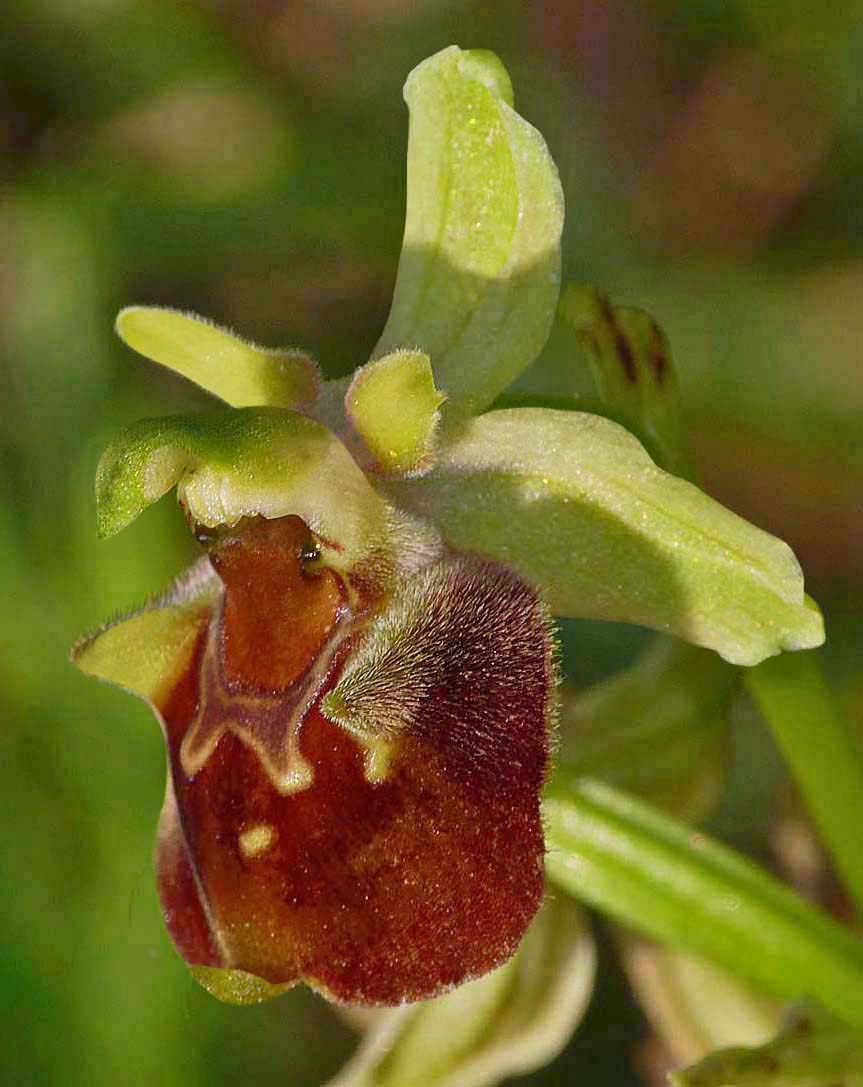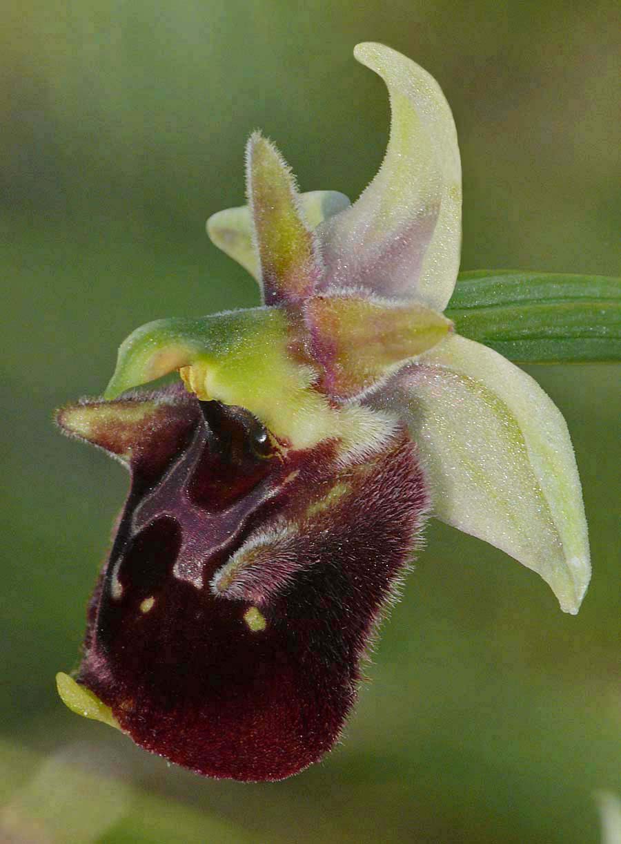 O. istriensis was first described from the Istrian peninsula of Croatia by Hertel, Paulus and Weyland in 2016 and so far as is currently known, restricted in range to the municipalities of Rovinj and Bale. This species is a difficult one to identify, with the two most significant differentiators being the size of the flower and its flowering period. Other morphological characteristics such as colouration, shape and lip pattern are unreliable as O. istriensis is hugely variable. As evidenced by the photographs, it appears in many forms, often closely resembling its compatriot species. The Istrian Orchid as it is commly referred to, is typically a robust plant with up to twelve, relatively large flowers that appear in mid April, at the same time as the very similar but smaller flowered O. untchjii, with which it frequently associates. O. medea and O. tetraloniae are similarly smaller flowered but will be at their best only as O. istriensis is fading. Sepal colouration is highly variable, ranging from dark pink (rare) to pure white, with green being the most usual. The stigmatic cavity is conspicuously large, being widest at the base and usually merging into a sizable and concolorous basal field. Basal swellings are always present and these may be significantly proportioned, close set and usually forward pointing unlike those of O. untchjii which are generally splayed outwards. O. istriensis can appear in conventional fuciflorid form (4), trapezoid (9) or very rarely, scolopaxoid, as in the photo opposite. Their is always a submarginal band of hair and unlike O. untchjii, this is both brighter and longer in the basal half of the lip. Although the number of known sites for this species is relatively small, it can occur in significant numbers. The photos date from the 7th of May 2016. |