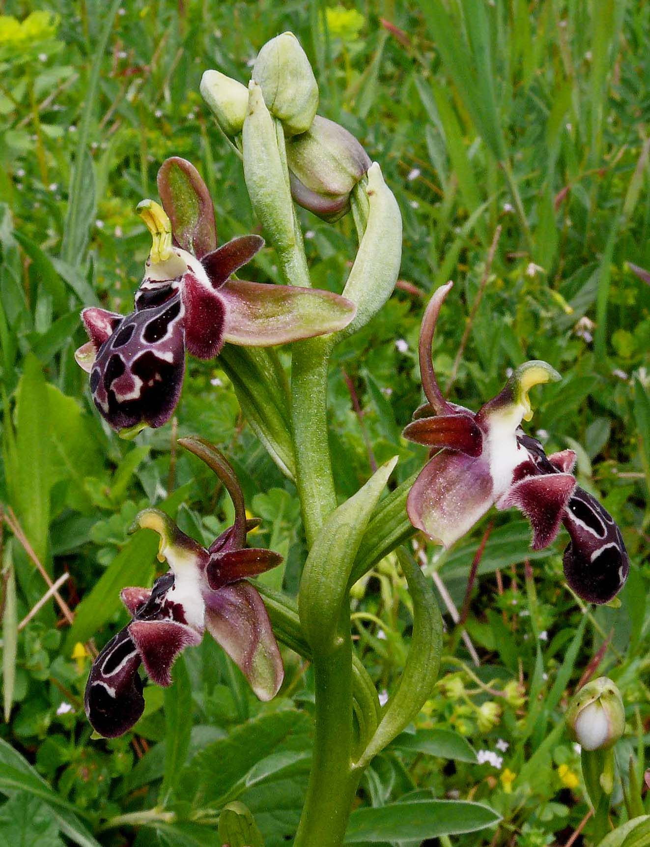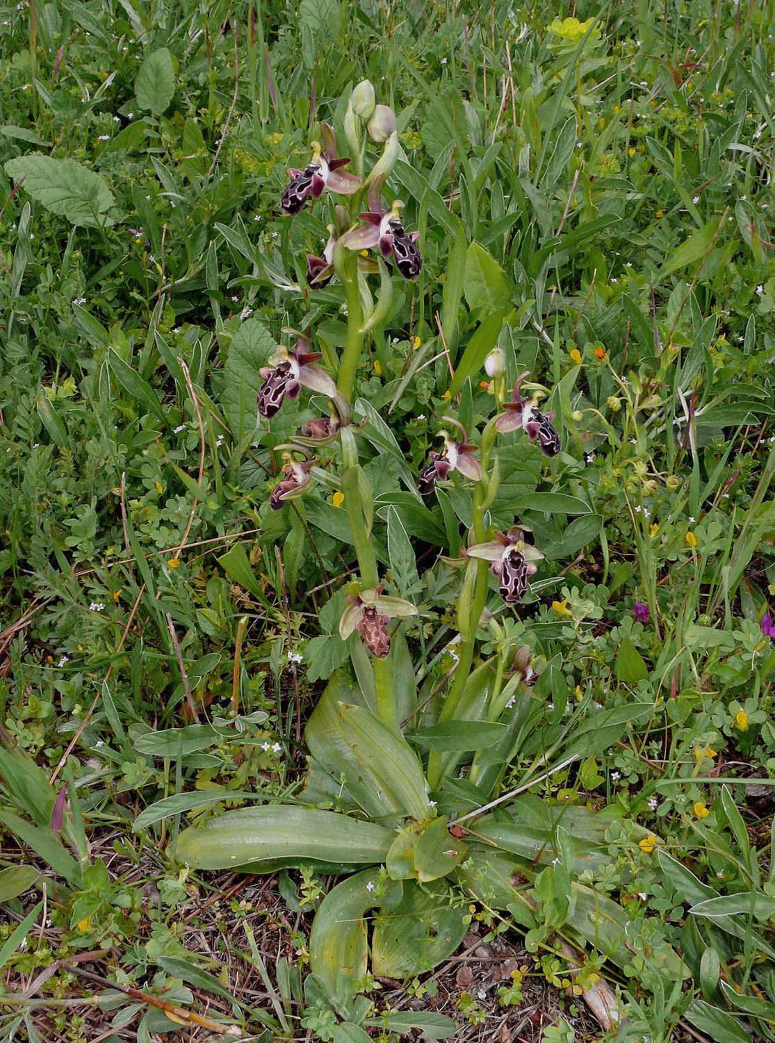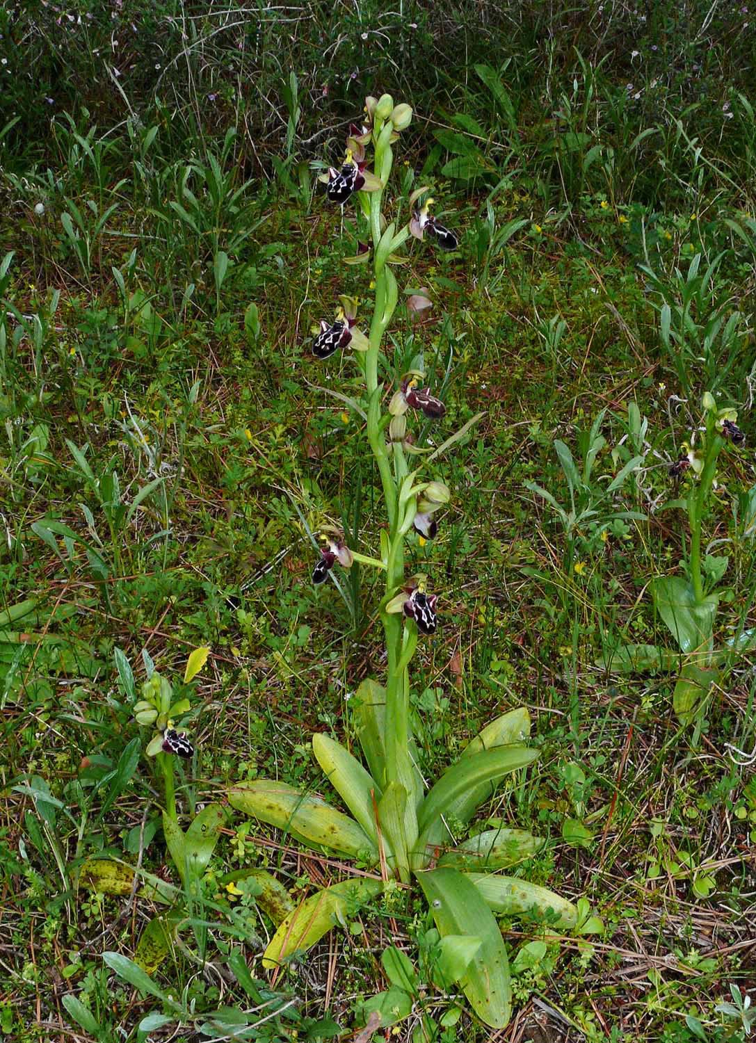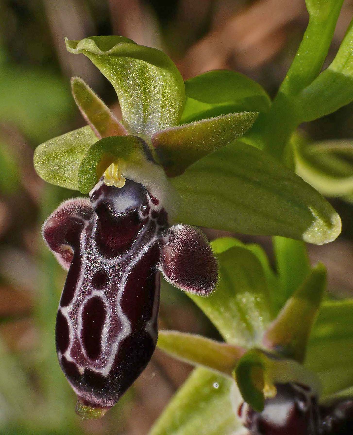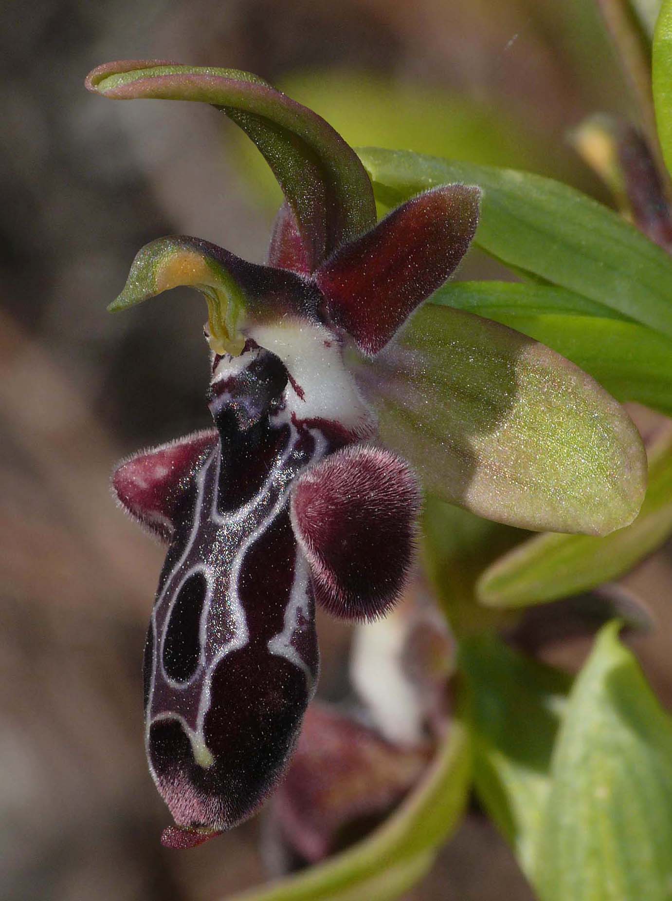 O. kotschyi is endemic to the island of Cyprus and although it can be reasonably plentiful in its stations, it is highly localised and never abundant. Its stronghold near the salt marshes of the Akrotiri peninsula in Southern Cyprus has long been well known but it does occur sparingly in other locations both in Akrotiri and further inland, notably around Lefkara. It is a highly distinctive orchid and despite the prescence of O. astarte, O. umbilicata and even O. rhodia it is unlikely to be confused with any other Cypriot Ophrys. There is however one rare exception to this general statement and this is the existence on the island of O. cretica, a morphologically similarspecies that could definitely create uncertainty. The two species although apparently not closely related, bear a striking resemblance to one another, indeed there are some who feel the similarity is more than simply a morphological adaptation to the same pollinator. One of the significant differences is in the stigmatic cavity, which in O. cretica is almost entirely white with minimal dark markings, in O. kotschyi the reverse applies. It should however be stressed again that O. cretica is extremely rare in Cyprus. O. kotschyi is generally a plant that thrives in a full sun position but can tolerate moderate shade where scrub has encroached on its habitat. The illustrations date from the the beginning of March and the species is normally past its best by the end of that month. |