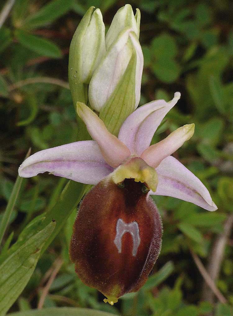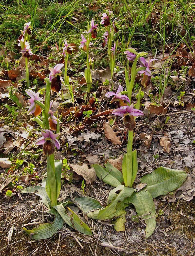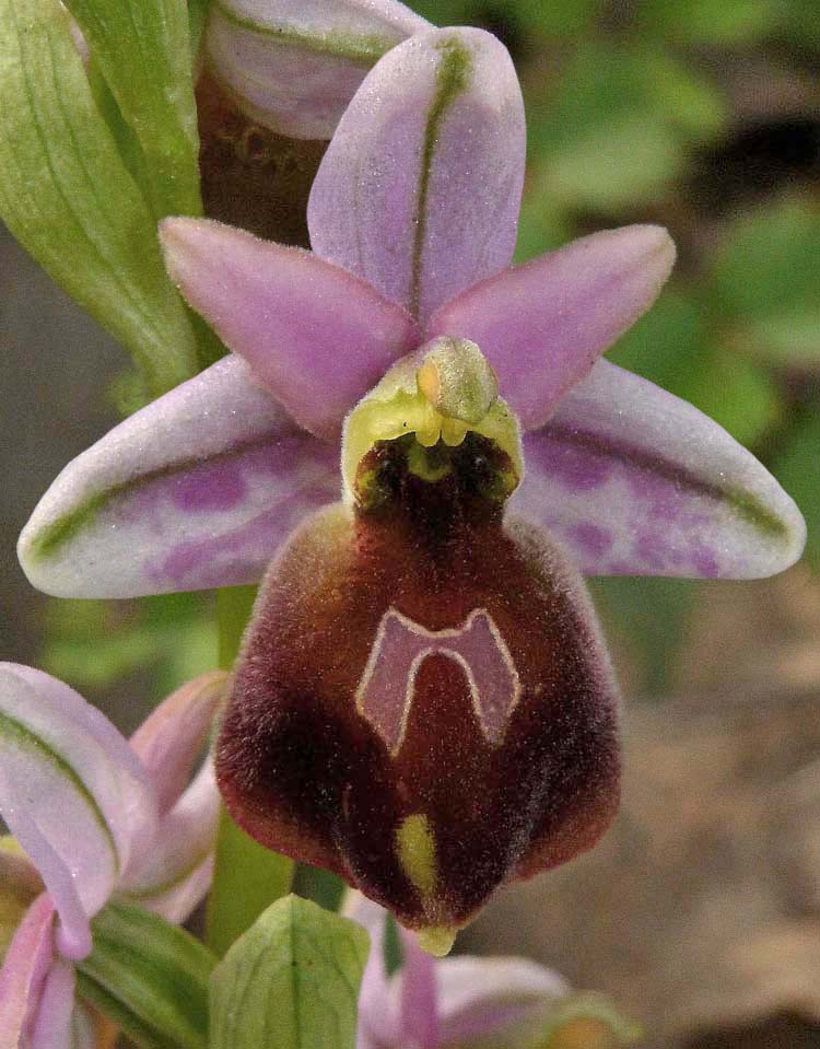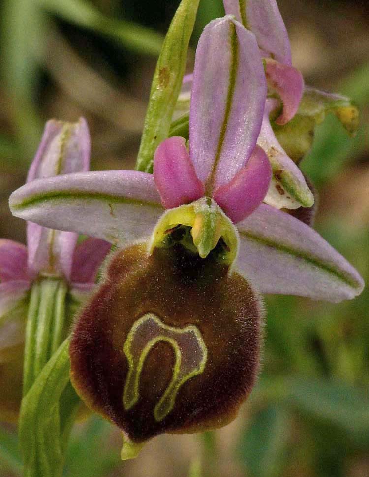 This species generally grows in small colonies and is only found in significant numbers where conditions are optimal. It prefers alkaline soils in either full sun or mid shade but seems to show a particular liking for moister substrates with light tree covering or other shade. This may be open oak woodland or as with the illustrations here, mixed pine. On the Aegean islands, O. lesbis is unlikely to be confused with other species, although there exists a small overlap of range with the similar O. lucis in both Rhodes and Anatolia. This species is a member of the O. argolica group, which although growing to a maximum of 30cms and producing up to ten flowers, is more normally a fairly low, sturdy plant with fewer than five. It can be variable in appearance and as was the case with the population illustrated here, will readily hybridize with other Ophrys. A single seemingly pure plant of O. villosa was growing amongst the colony and many of the nearby O. lesbis showed the unmistakable characteristics of the interloper, the second photograph depicts one of the more obvious examples of this hybridization. The pictures date from the first week of April. |