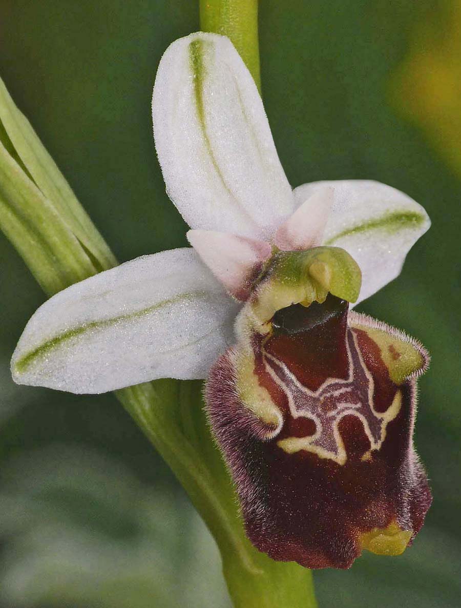 O. lorenae was first described as a subspecies of O. fuciflora from Emillia-Romagna, Italy by De Martino and Centurione in 2002. It is named after Lorena Moruzzi the discoverer of this plant. This species is restricted to the eroded clay formations of northern central Italy, where although generally uncommon, can grow in large numbers in favoured sites. It is currently known from the regions of Emillia-Romagna, Marche and Tuscany. O. lorenae is a slender plant with up to eight small, rectangular to trapezoid shaped flowers with relatively modest protuberances. The perianth is almost invariably white with green central veins, though pink and even red have been recorded. The basal field is distinctive, being either dark brown or a dark rusty red and which sits below a virtually coal black stigmatic cavity. The speculum is normally uncomplicated, comprising a violet background bordered by pale yellow lining. Flowering commences in mid April and runs to late May. The taxonomic status of this species is not fully understood as it bears a strikingly close morphological resemblance to O. annae, an orchid that is currently thought to be restricted to Corsica and Sardinia, more than 200kms across the Tyrrhenian Sea to the west. The single photo comes from the Orvietto area and dates from the first week of May. |