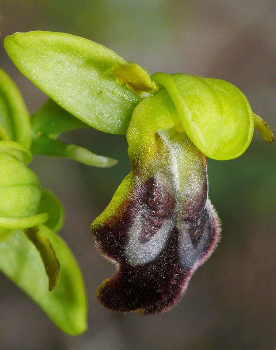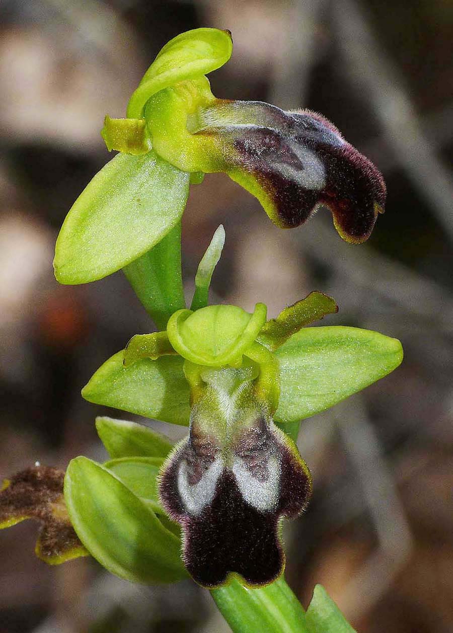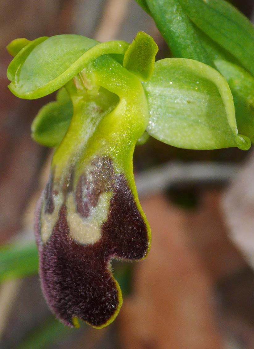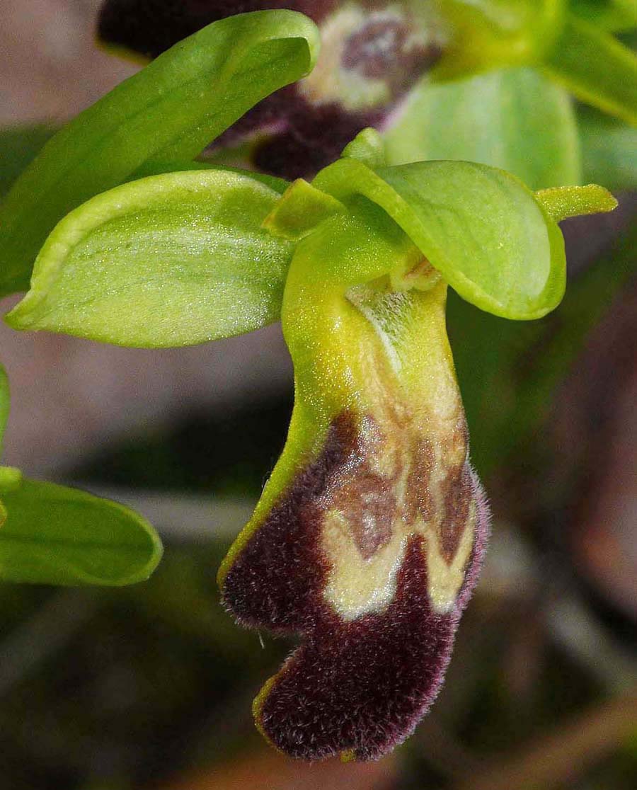 In Sicily, O. lupercalis can appear very much like the endemic O. sabulosa but although the two species can be found in similar habitats, the former orchid would be in poor condition by the time the latter comes into flower. There is a view amongst local botanists that O. lupercalis, O. sabulosa and O. gackiae are in fact seasonal morphs of the same species. In southern Spain it comes into contact with both O. malacitana and O. clarae, though only the former taxon flowers concurrently. O. lupercalis is a tall lant with up to ten large flowers, the lips of which exhibit significant longitudinal prominences, below which is a slight bend in the otherwise flat surface. The upper labellum is divided by a deep central groove . The photos are from Sicily and southern Spain, dating from late March at which time they were declining. |