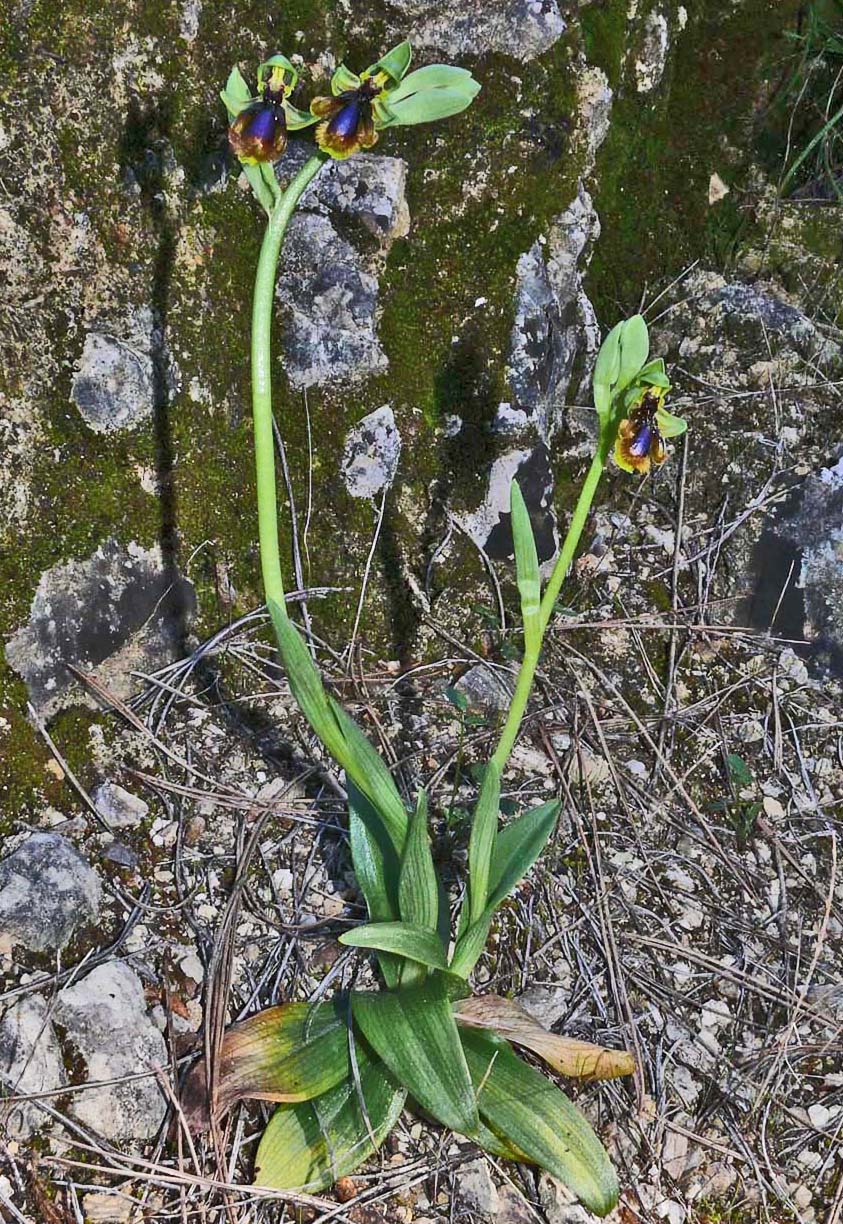 O. lusitanica is confined to localized populations in the southern half of Portugal, together with some similarly scattered outposts in Southern Spain. Here its range is centred on Andalucia but can also be found in just one or two sites as far north as the Province of Jaen. It is rare throughout its range but in some of its colonies, it can number hundreds of individual plants. This species frequently grows alongside O. speculum and despite a relatively short flowering overlap, the two readily hybridize, forming large intermediate populations that can present problems with identification. In pure populations however, differentiation is quite straightforward and perhaps the most striking contrast between the two is their differing proportions. O. speculum is spindly and rarely grows above 20cms whereas O. lusitanica is robust and capable of reaching 50cms or more. The flowers themselves also differ in size but in the latter species, the median and lateral lobes are significantly longer than those of the more rotund O. speculum. It does not normally appear until at least mid April, some two or three weeks after O. speculum. The pictures come from Malaga Province, Spain and the Algarve of Portugal, dating from the end of April. |