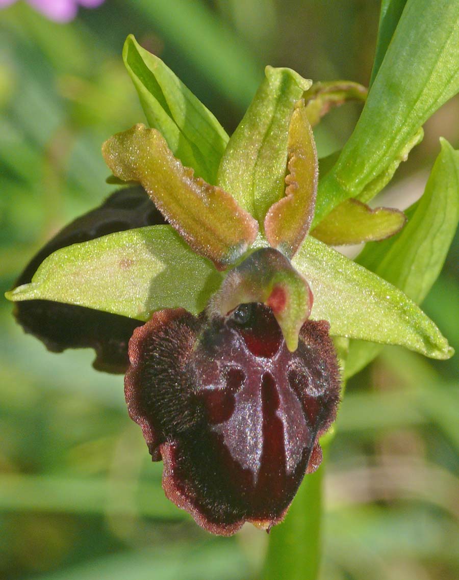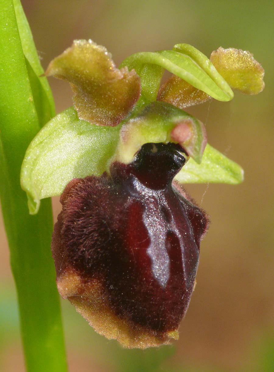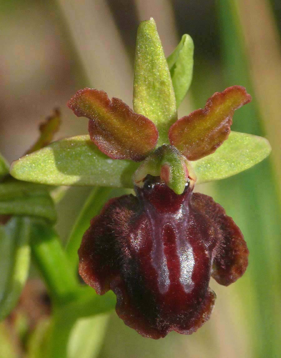 The Ophrys of peninsula Italy have attracted much research over the last two decades and this has resulted in a significant number of new species being described, the ranges of which are in several cases still not full understood. This large group of Ophrys exhibit a high degree of natural variation and have always presented botanists with a challenge with species separation. Distinguishing them is further complicated by the presence of large populations of intermediate plants arising from introgressive hybridization. The photos here depict Ophrys from a substantial mixed colony of O. maritima and O. garganica near the coast between Livorno and Grosetto. The two species share identical flowering times and were therefore simultaneously receptive to cross pollination, potentially by the same pollinating species. It should be mentioned however, that other species were close by and could also have contributed to the gene sharing. The pictures date from the first week of April. |