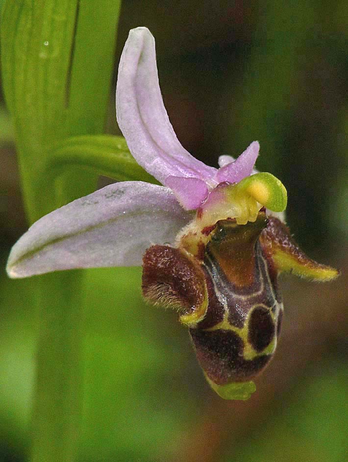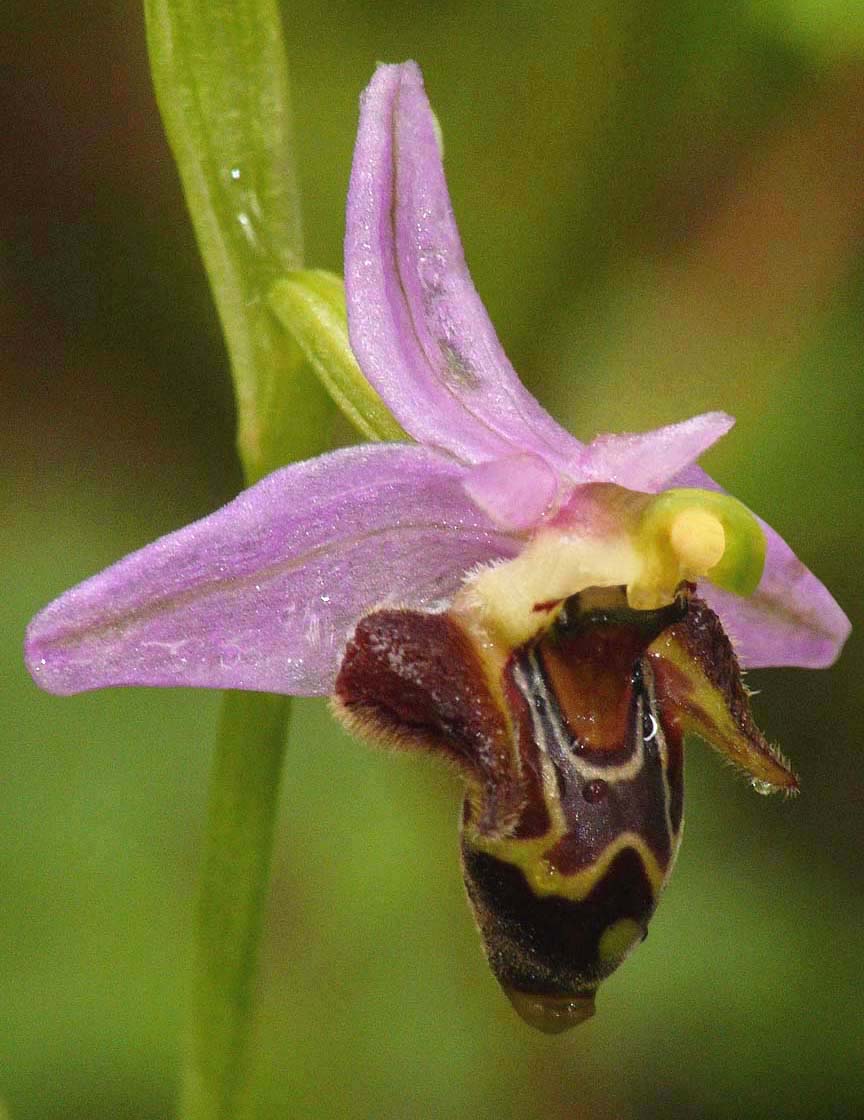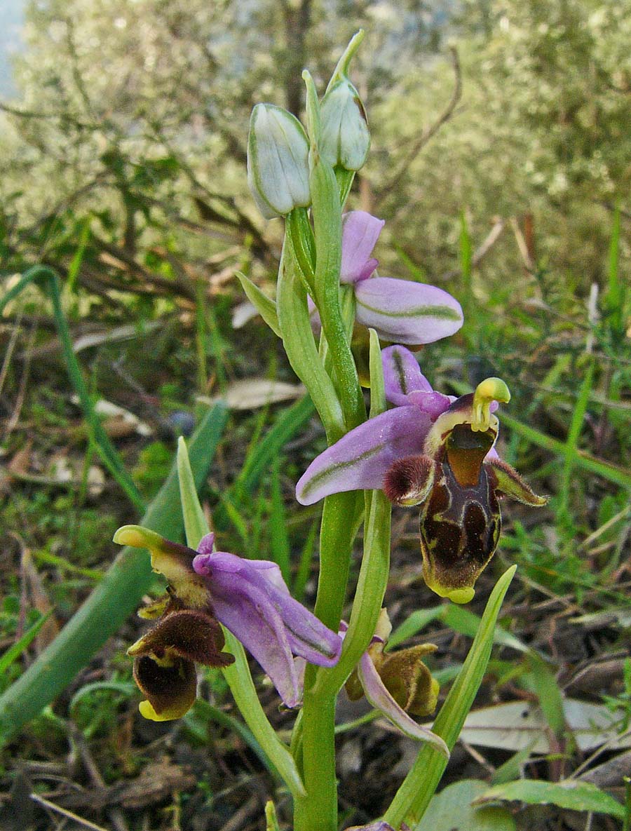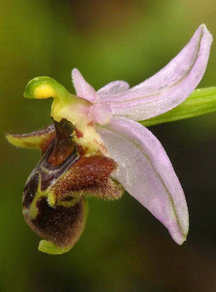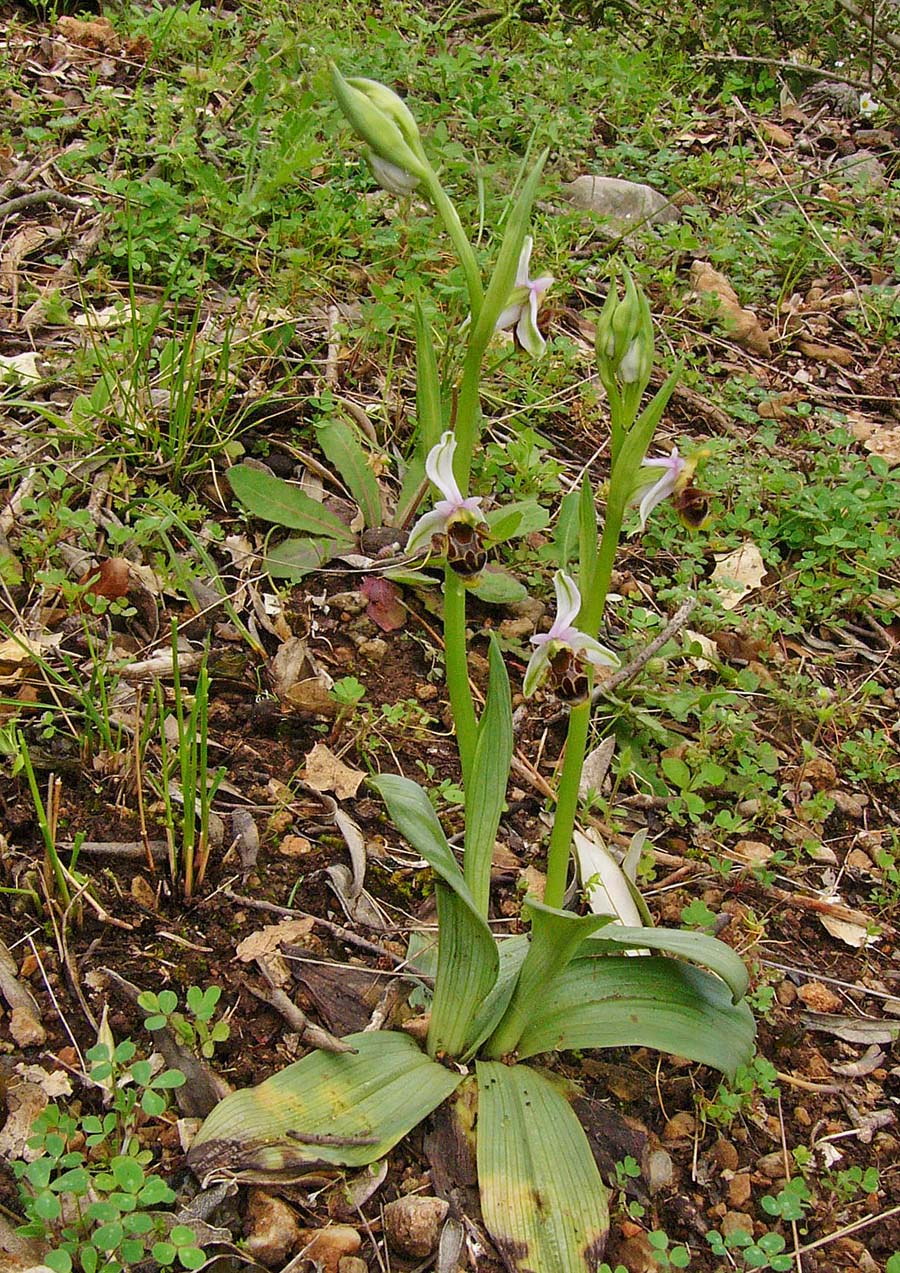 O. minutula was first described from Lesbos in 1989 by Golz and Reinhard and its name refers to the very small size of its flowers. It is a member of the burgeoning and increasingly confusing O. oestrifera group. Its range is not understood with absolute certainty but is best known from the eastern Aegean islands of Lesbos, Chios and Samos, as well as adjacent areas of the Turkish mainland. It does not reach as far south as Rhodes where the similar O. dodaekanensis (now O. heterochila) is the dominant small O. oestrifera group representative. To ensure a degree of confusion, this latter Ophrys which was once thought to be endemic to Rhodes, has now been recognized from Chios, Samos and Lesbos. O. minutula is slender, with a basal rosette of large leaves and can be 35cms tall with as many as 10 flowers arranged loosely up the stem. The lateral lobes are most typically short but there are populations on Lesbos which have longer horns and appear very much like O. cerastes. Sepals are usually white or very pale pink but can occasionally be darker. These sepals are virtually always strongly curved backwards and this is an important feature in identification. Another key characteristic is the inflorescence which is frequently (though not always) loosely one sided, interestingly however this only becomes apparent with age. O. minutula can be variable and at the extremes of variation, difficult to separate from other small group members but in its typical form, the combination of light coloured, narrow, swept back sepals and small size is usually a reliable indicator. The illustrations are all from Lesbos and date from the first week of April. |