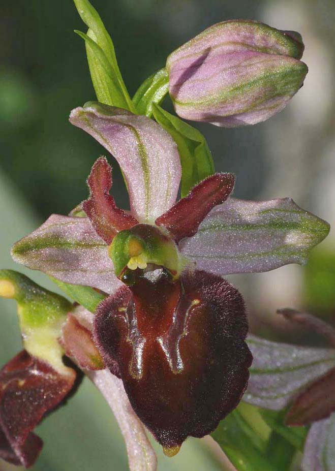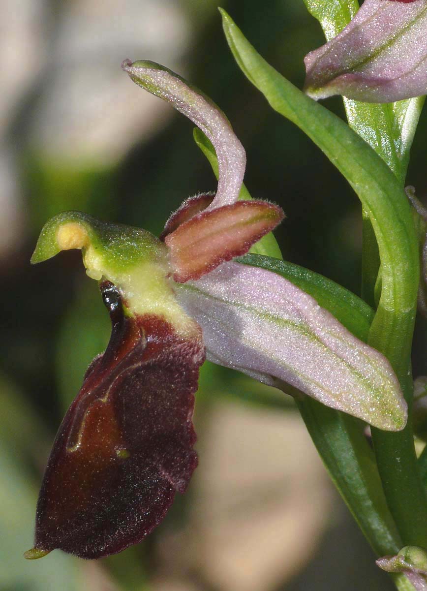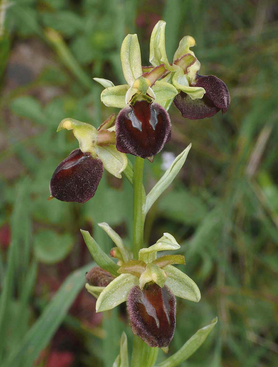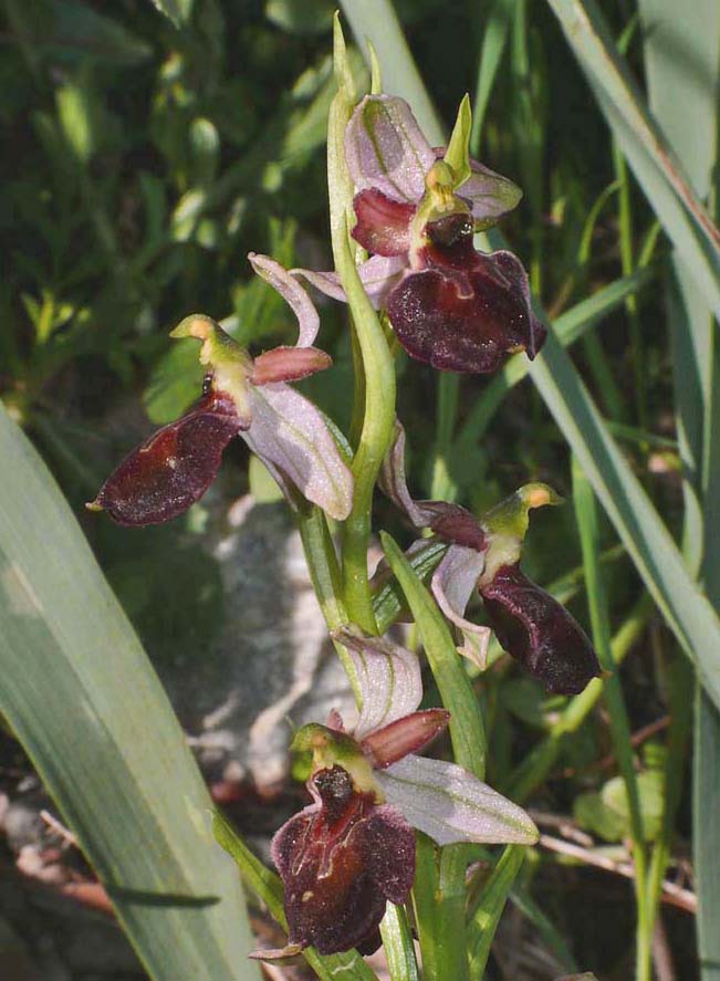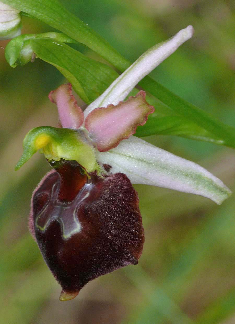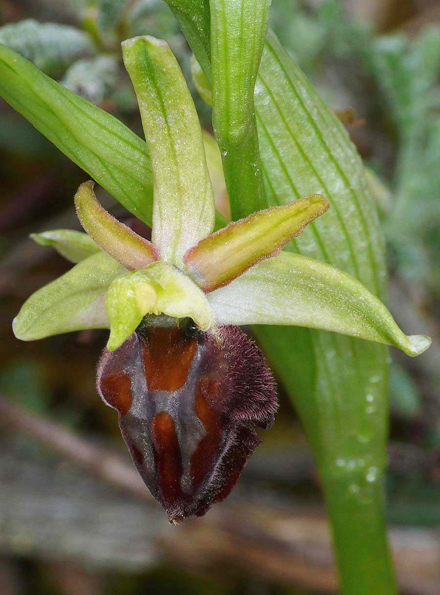This species is endemic to Sardinia and Corsica where although often local, is not at all uncommon and can be found in most soil conditions bar those of a strongly acidic nature. As can be seen from the pictures, it is hugely variable to the point that a concise description is virtually impossible. The range of O. morisii often brings it into contact with a fellow endemic, O. praecox and the two share a number of similarities which can often cause difficulty with identification. These similarities are attributable in no small part to the hybrid origins of O. morisii , where the generally accepted belief is that it was heavily introgressed by a now completely absorbed member of the O. exaltata group, similar to O. praecox. It is unsurprising therefore that some plants of O. morisii can be difficult to distinguish from O. praecox, particularly in forms exhibiting white sepals and simple specular marking. O. praecox is however an earlier flowerer and will be in a poor condition when O. morisii is starting to appear in early April. Typically O. morisii has a dark brown to rusty red lip with a slightly lighter coloured basal field sitting above a speculum loosely based on an H pattern but which can vary from complex to greatly reduced. Sepals can be of any shade, usually green veined but petals will generally be more richly coloured. It flowers during April and May in full sun or mid shade and appears quite comfortable growing at altitudes up to approx 1500 metres. |