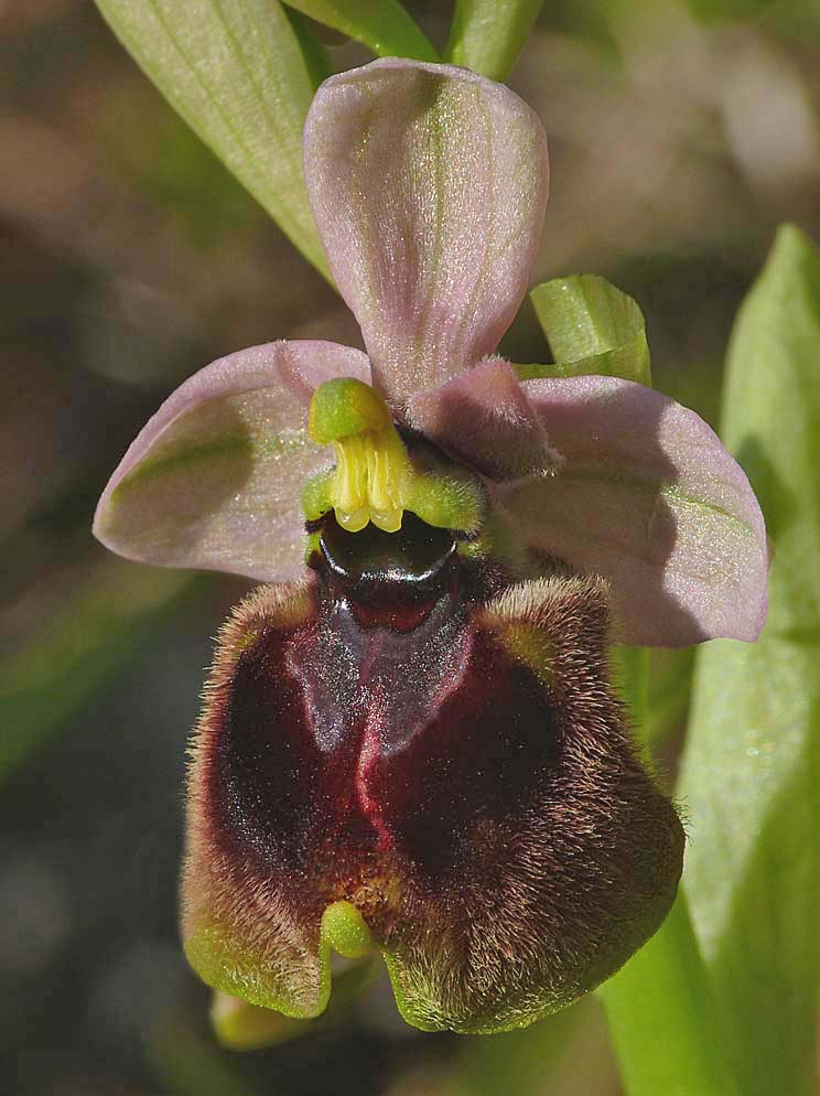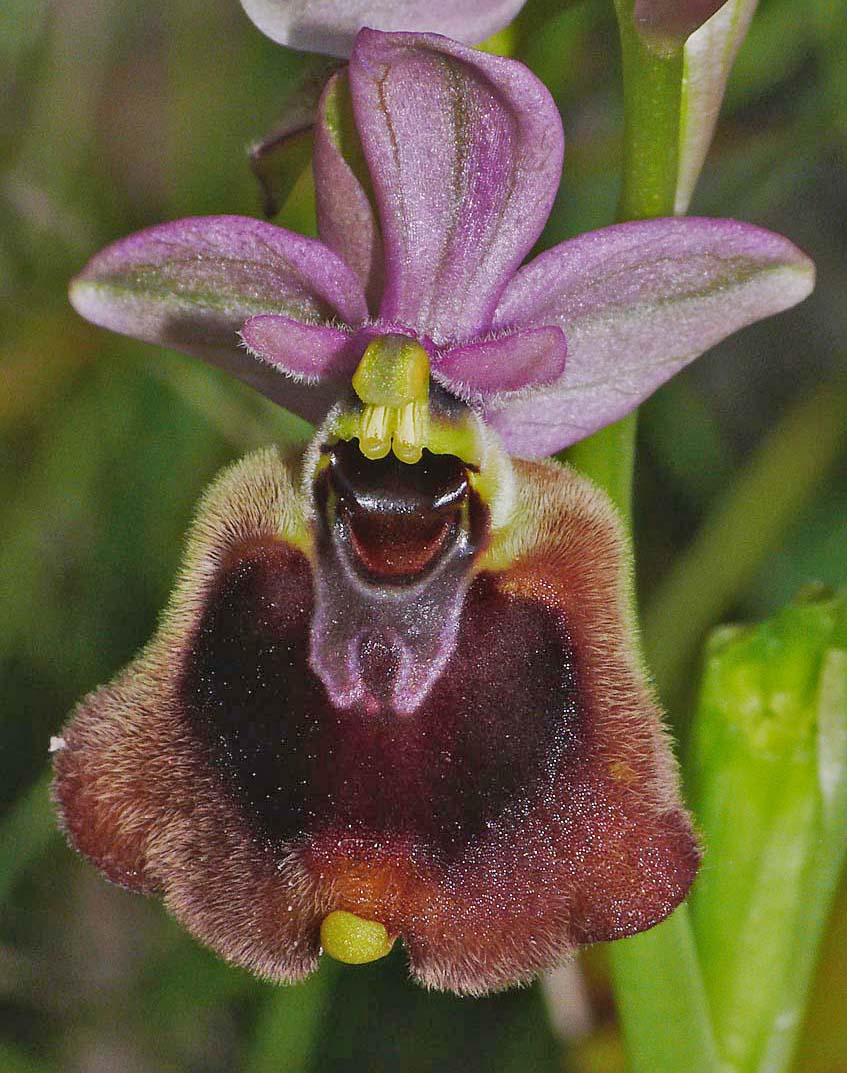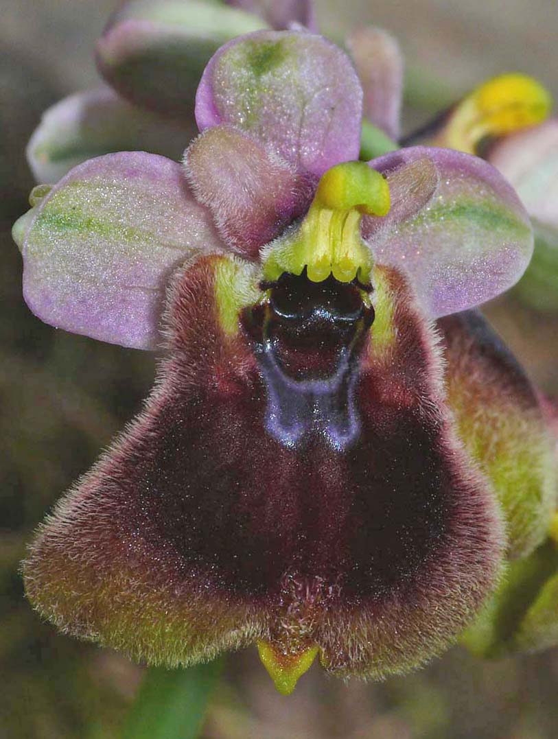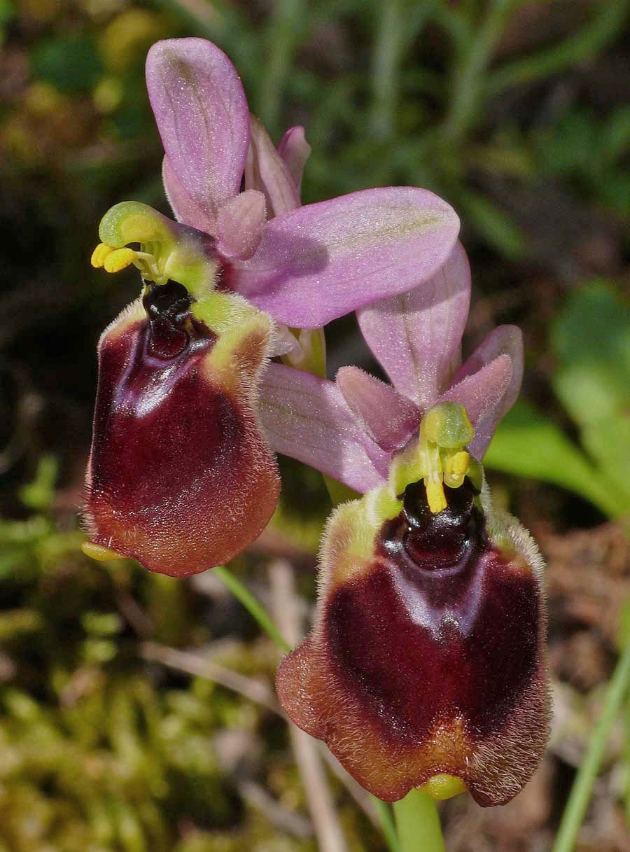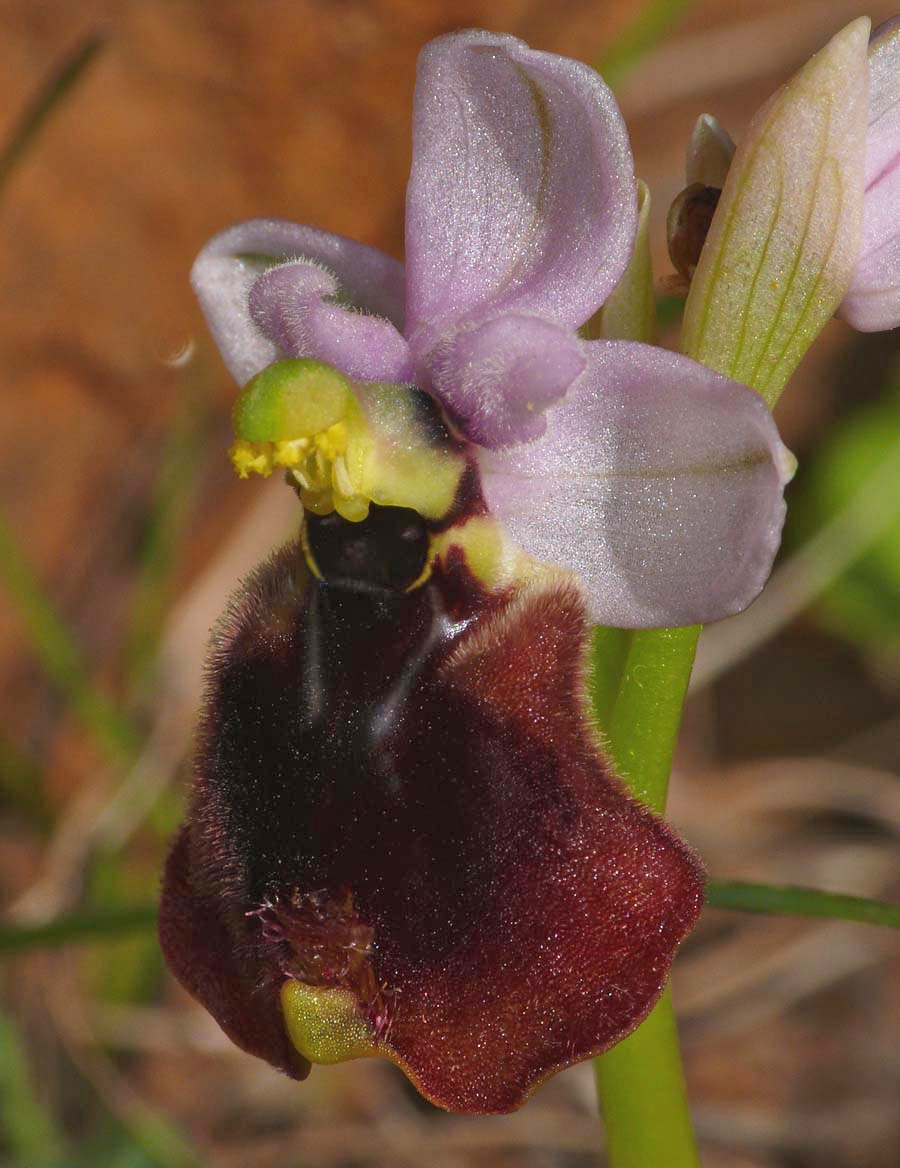 O. normanii and O. chestermanii are sympatric, share a pollinator and bloom at the same time. Hybridisation would therefore seem a strong potentiality and yet there have been no reports of intermediate's. It would appear that sympatry, a common pollinator and coincidental flowering have not led to gene ingression, thus indicating the presence of reproductive isolation mechanisms that prevent any interspecific gene flow. O. normanii in its dark phase can appear remarkably similar to O. chestermanii and this is assumed to be adaptation to the same pollinator (see below). In the species stronghold among the mountains to the north of Domusnovus, it is possible to find O. normanii in forms that at one end of the scale, are typical of the tenthredenifera group and at the other, specimens virtually indistinguishable from O. chestermanii. |