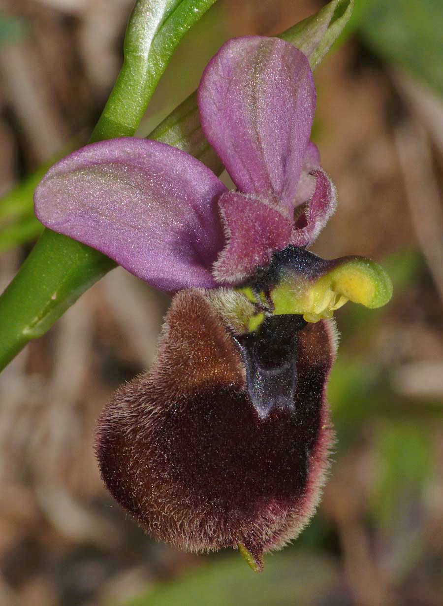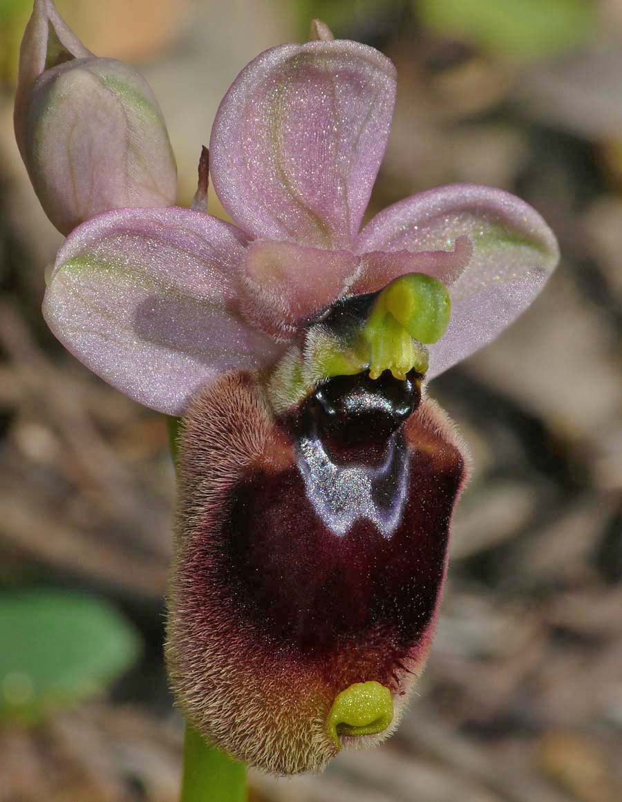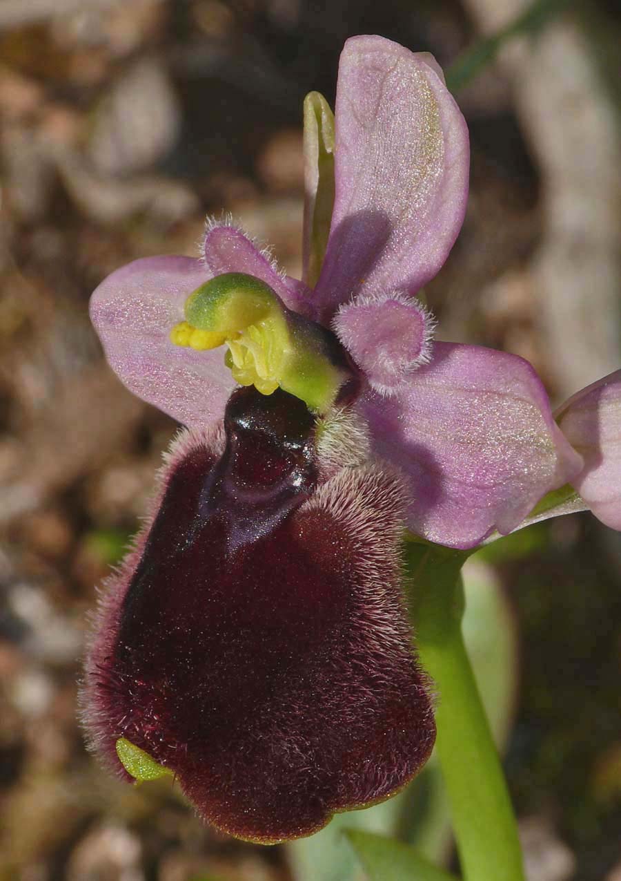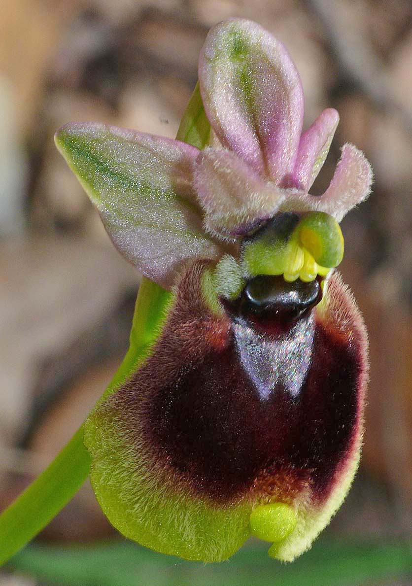 O. normanii and O. chestermanii are sympatric, share a pollinator and bloom at the same time. Hybridisation would therefore seem a strong potentiality and yet there have been no reports of intermediate's. It would appear that sympatry, a common pollinator and coincidental flowering have not led to gene ingression, thus indicating the presence of reproductive isolation mechanisms that prevent any interspecific gene flow. O. normanii in its dark phase can appear remarkably similar to O. chestermanii and this is assumed to be adaptation to the same pollinator (see below). In the species stronghold among the mountains to the north of Domusnovus, it is possible to find O. normanii in forms that at one end of the scale, are typical of the tenthredenifera group and at the other, specimens virtually indistinguishable from O. chestermanii. |