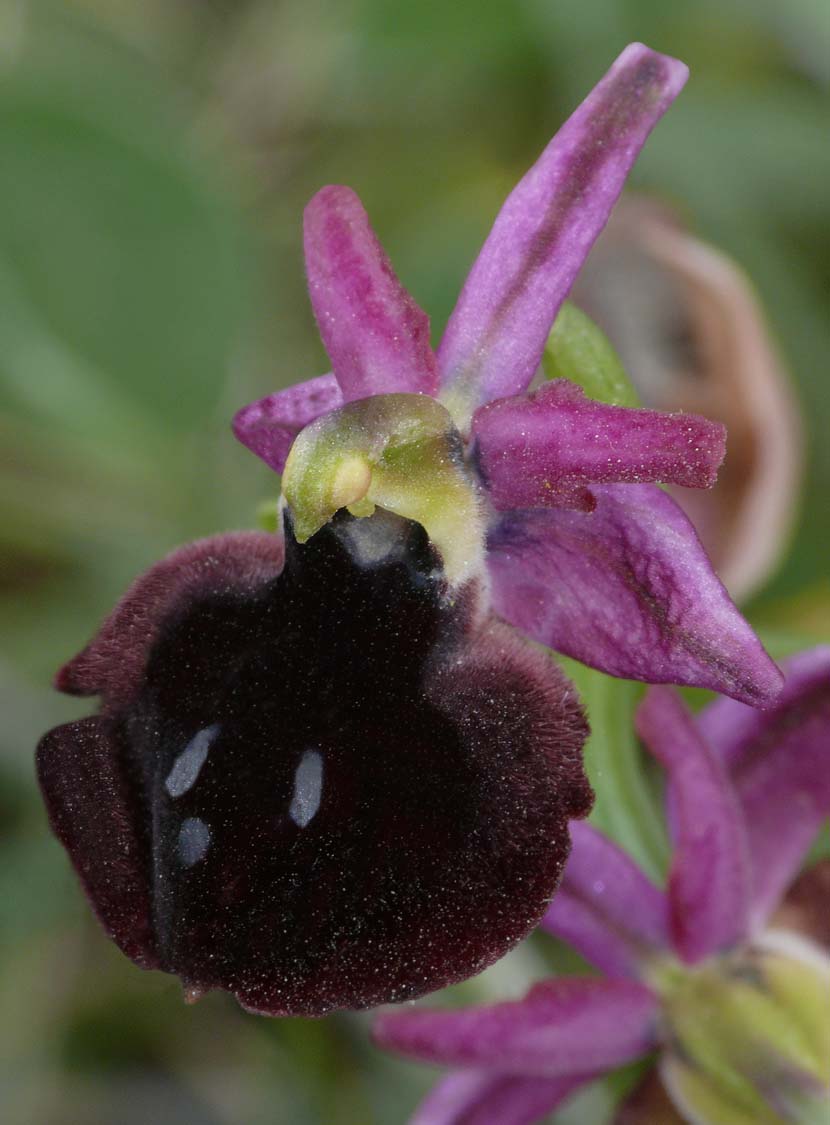 This new species is best described as a cross between O. ferrum-equinum and O. argolica and it may well be that these two species are its hybidogenous ancestors. It is hugely variable, appearing in forms that closely resemble either of these species and the situation can be further confused by back hybridisation with O. ferrum-equinum, a species which it frequently grows alongside. O. olympiotissa is only found in a small area to the south of Mount Olympus and well over 100 kms north of the nearest population of O. argolica. This is an extremely rare orchid growing on rocky calcareous hillsides and whose known population numbers just a few hundred, shared between two main colonies. The plant is somewhat spindly and carries a stem of two to six flowers, each of which are often remarkably varied, particularly in respect of specular pattern. The lip colouration is generally an O. ferrum-equinum like dark brown, with shoulders of thick, off white or brown hair, although the extent and sometimes the density of this hair is variable. The speculum is equally variable and ranges from a pair of O. argolica like eyes to a horseshoe and sometimes a complete bib. O. olympiotissa is a relatively late flowerer which first appears in late April and can still be around in early June. These illustrations date from early May. |