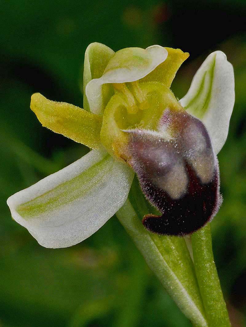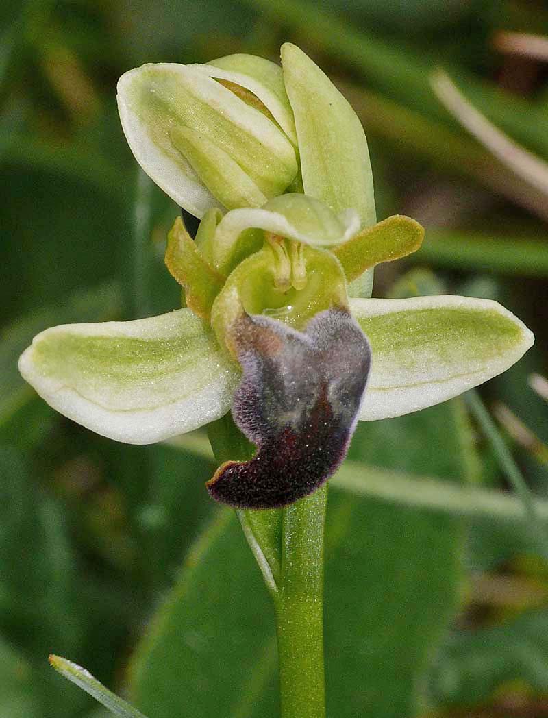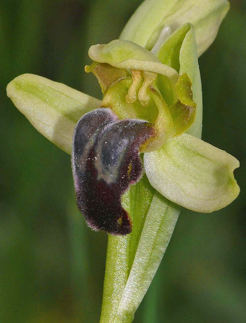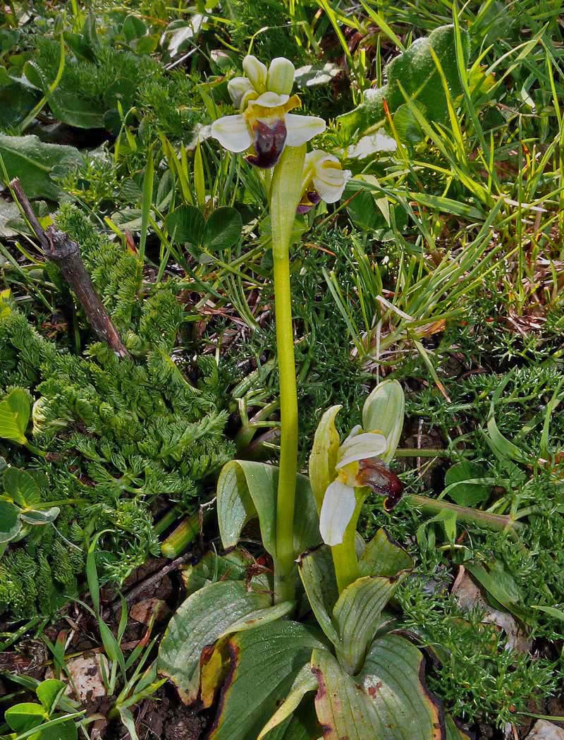 O. pallida was first described in 1810 by Rafinesque from the Palermo region of Sicily and was originally thought to be one of the many orchids endemic to that island. It has now been recognized however that O. pallida is in fact the same species as was known from Algeria as O. pectus and following the paper produced by Messrs Lowe, Gugel and Kreutz in 2007, the name O. pectus is now regarded as a junior synonym of O. pallida. The population of O. pectus from Tunisia has now been reclassified and renamed O. carpatina. Notwithstanding this extension to its known range, this species is rightly regarded as a very rare Ophrys being at its most frequent in a small area of western Sicily, centred on the beautiful Ficuzza Forest. It can be relatively easy to find, generally growing in small colonies, sometimes over a wide area and often in association with another of the area's specialties, Dactylorhiza markusii. Although as can be seen from the illustrations it is variable, it's impossible to mistake O. pallida for any other Pseudophrys. The strongly convex centre, large longitudinal protuberences and recurved tip combine to give the lip the appearance of a swollen and strongly bent knee joint. Its thought that the origins of O. pallida are quite distinct from its fellow group members and may be very ancient, possibly justifying a separate group status in its own right. Reports of hybridization are rare and populations seem largely genetically pure. The species has a relatively long flowering period and can be found from early March through to mid May. All the illustrations are from the Ficuzza Forest to the south east of Palermo and were taken during the third week of April. |