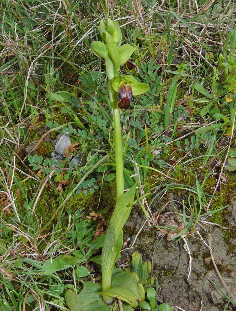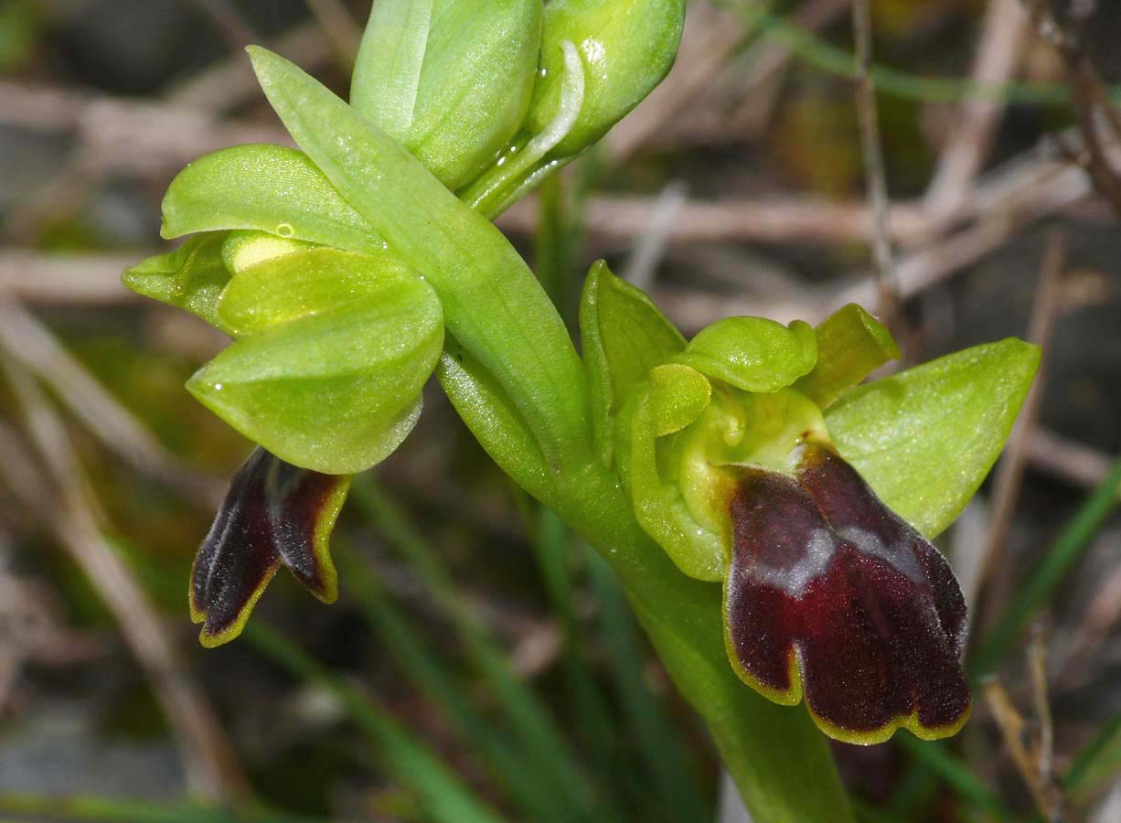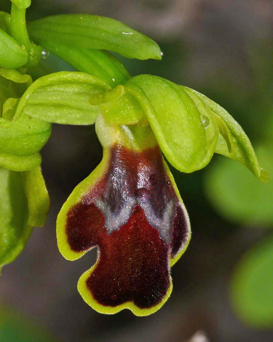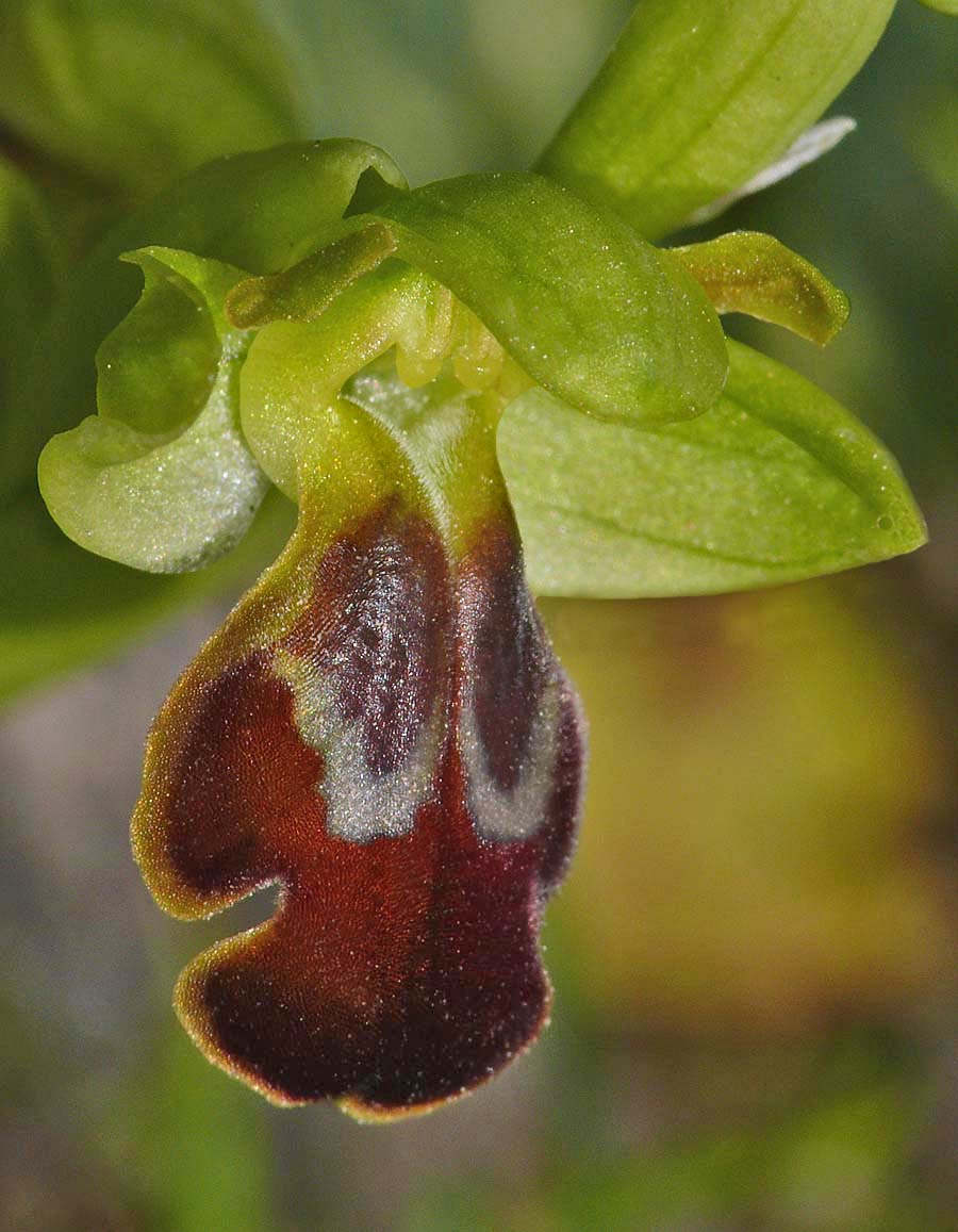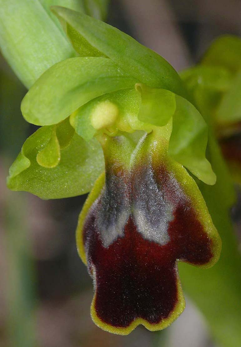 O. pallidula resulted from a study into the Cretan late flowering fusca group and is endemic to the Thripti mountains in the east of the island. Although extremely local it does not appear to be particularly uncommon and indeed has been found to readily hybridize with the similar O. phaidra. When it comes to identification this latter species is the cause of some confusion, a situation not helped by the presence of intermediates. O. pallidula is very reminiscent of O. lindia from Rhodes and like that species, the colour of the lip is a pale chestnut brown, although this does not necessarily distinguish it from O. phaidra which although normally darker, can often appear with this chestnut colouration. These two species, as well as the very rare O. cressa, share similar flowering times (late March and April) depending on altitude. The speculum of O. pallidula is variable both in colouration and extent. In some examples it may be large and reach the sinus (see pictures 3 & 4) and in others be restricted to the central area without touching the margins at all. The base colour ranges from brown to metallic blue but is generally quite dull, usually with a visible milky crescent. There is invariably a bright yellow marginal band and this can often be broad. The illustrations date from the middle of April and come from the Oreino district of eastern Crete. |