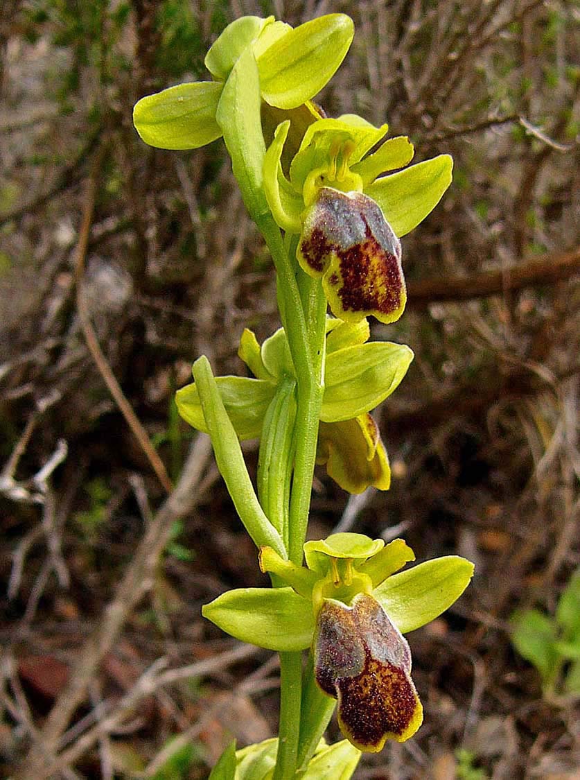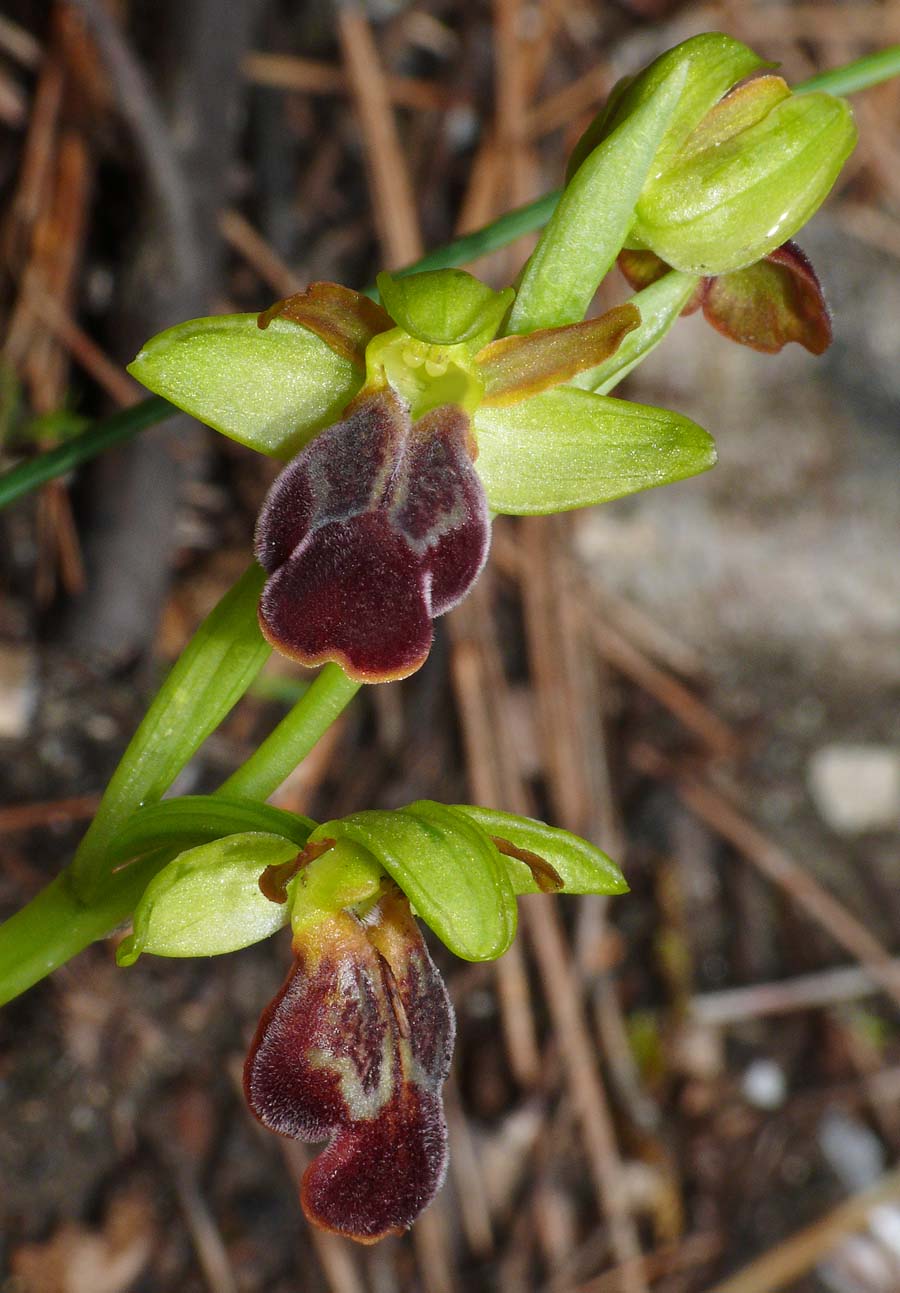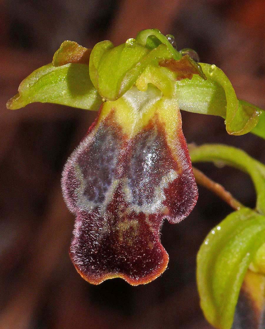 O. parosica was first described by Delforge from Paros in 1995 and is a member of the O. attaviria group of Ophrys. This species together with O. phaseliana and the more recently described O. pelinaea have been presenting taxonomic challenges for over a decade now, most particularly in terms of conspecificy but also the question of their very presence in the eastern Aegean. In 2006, Delforge acknowledged the possibility of conspecificy but nonetheless described O. parosica and O. phaseliana as separate species, both to be found in the islands of the eastern Aegean. His opinion subsequently moved to a reduction of O. phaseliana's status to one of variety (O. parosica v phaseliana). Further research by Paulus and Hirth (2015) does not accord with this view and recommended reclassification of both these species (together with O. meropes and O. theophrasti) from the eastern Aegean as O. pelinaea. Confirming O. parosica to be restricted to the Cyclades and O. phaseliana to south west Turkey, the latter therefore outside of the scope of this site. The situation has now settled into an understanding that O. phaseliana is restricted to Turkey, O. pelinaea is an individual and widespread species and O parosica is also a full species with a range through much of the Aegean. The illustrations are from Chios and Samos and depict plants with the typical marbling, yellow lip margin and open sinuses that are so characteristic of O. parosica. They date from the first week of April. |