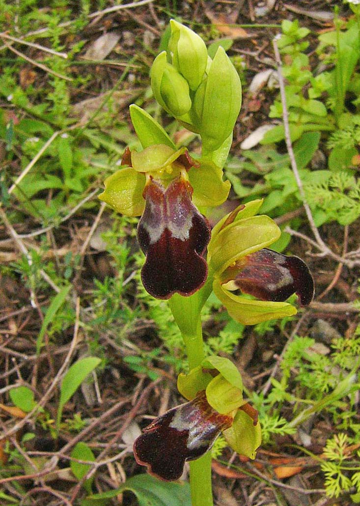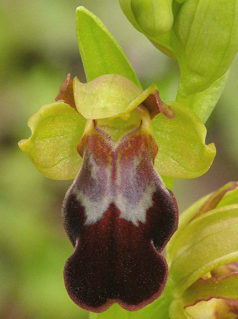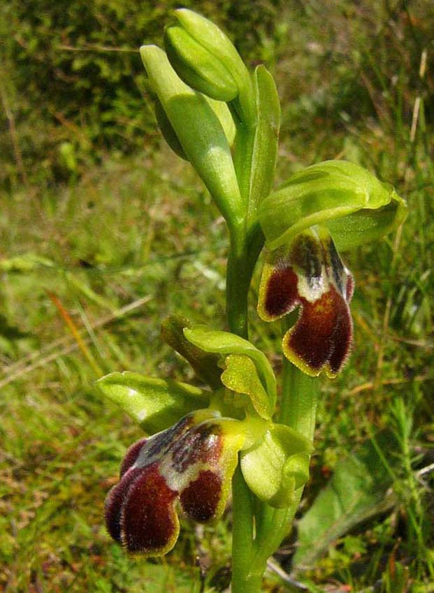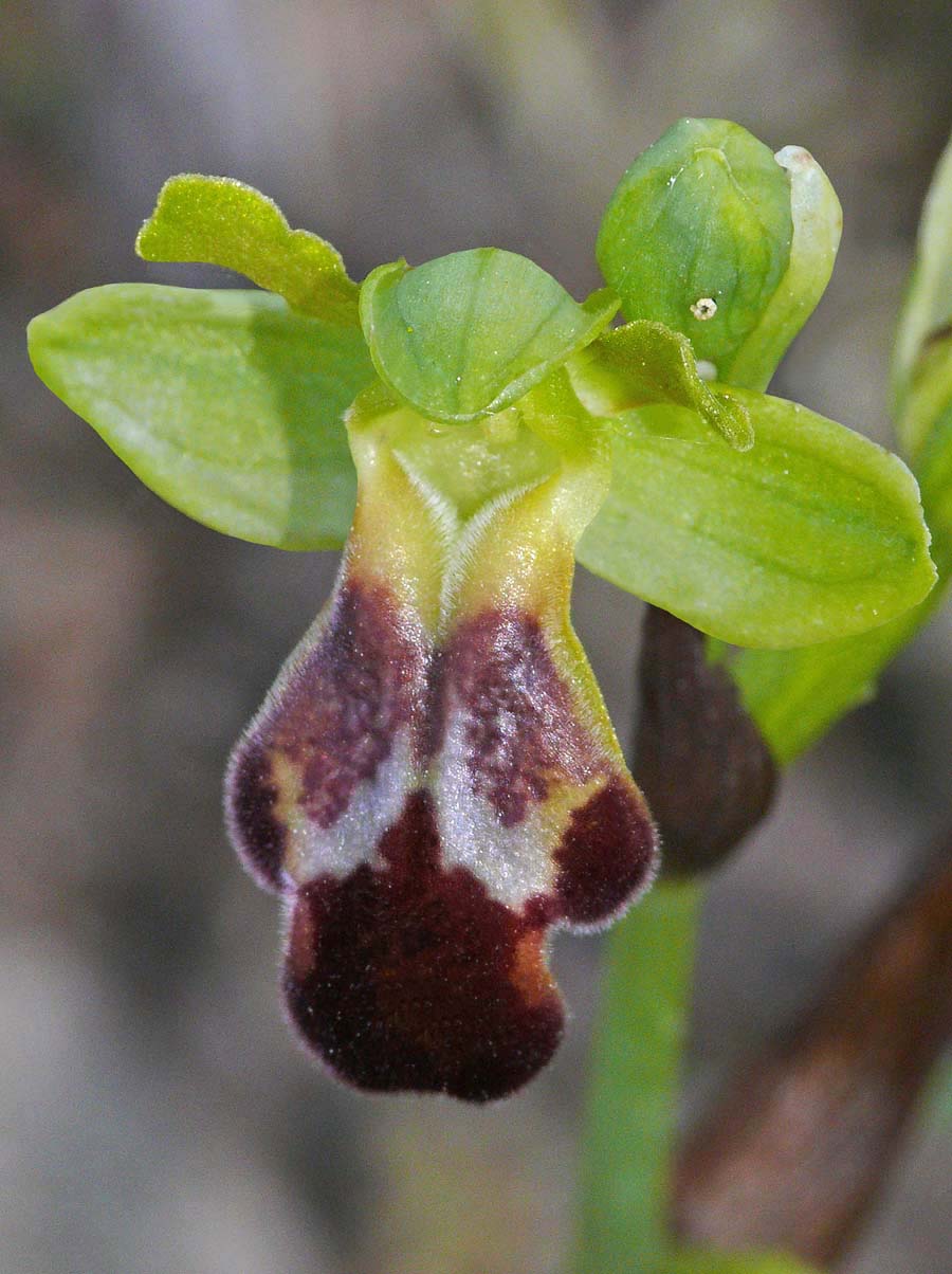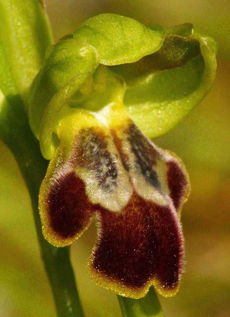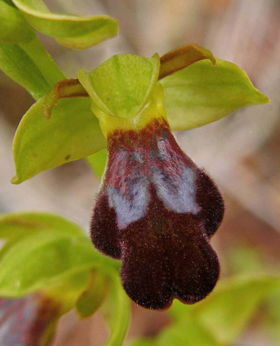 In 2015, Paulus and Hirth produced research that established this orchid to be a widespread species throughout the eastern Aegean and that it encompassed a range of Pseudphrys, then variously considered to be late flowering forms of O. sitiaca or O. leucadica and separate taxons including O. parosica and O. phaseliana. It was proven by exhaustive testing that they all shared the same pollinator, Andrena gravida and therefore, despite significant morphological differences were a single species. Delforge first described O. pelinaea in 2007 from the island of Chios where it was found on Mount Pelineo but since then it has been discovered to be widespread and common on many other eastern Aegean islands and probably also occurs in western Turkey. The illustrations are from Lesbos and Chios, demonstrating very well the significant variation in appearance of this species. It is thought to be of hybrid origin, with the hybridogenous O. sitiaca as one of its forebears. Its perhaps unsurprising therefore that O. pelinaea is so variable. Perhaps the most consistent identifying feature of O. pelinaea is the broad silvery omega at the tip of the speculum, very reminiscent of O. sitiaca but with a pronounced V shaped groove in the basal area. The lip is three lobed and generally with a yellow or orange margin though this feature is often disguised by the strong reflexation. As with other members of the O. omegaifera grouping, it is both large flowered and a particularly robust plant. The photographs date from the middle of April. |