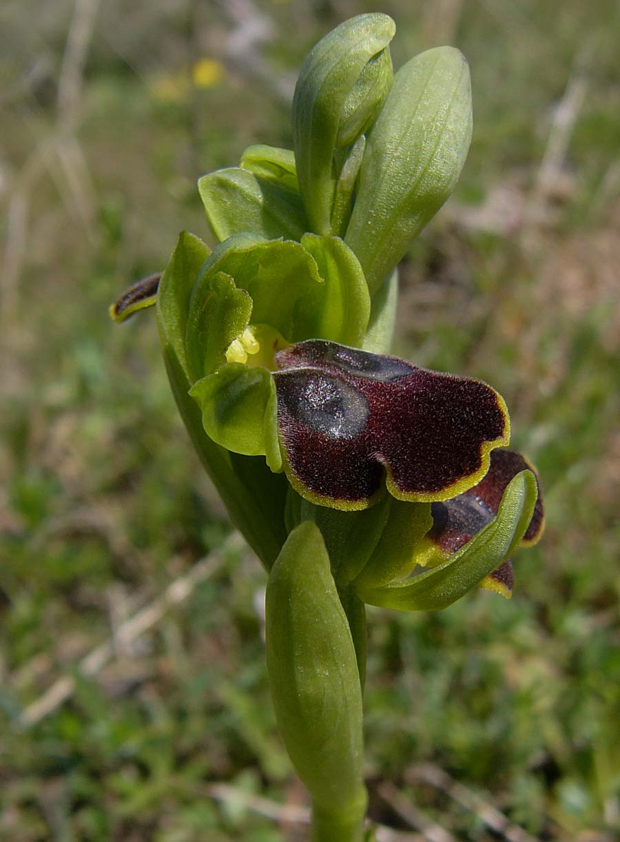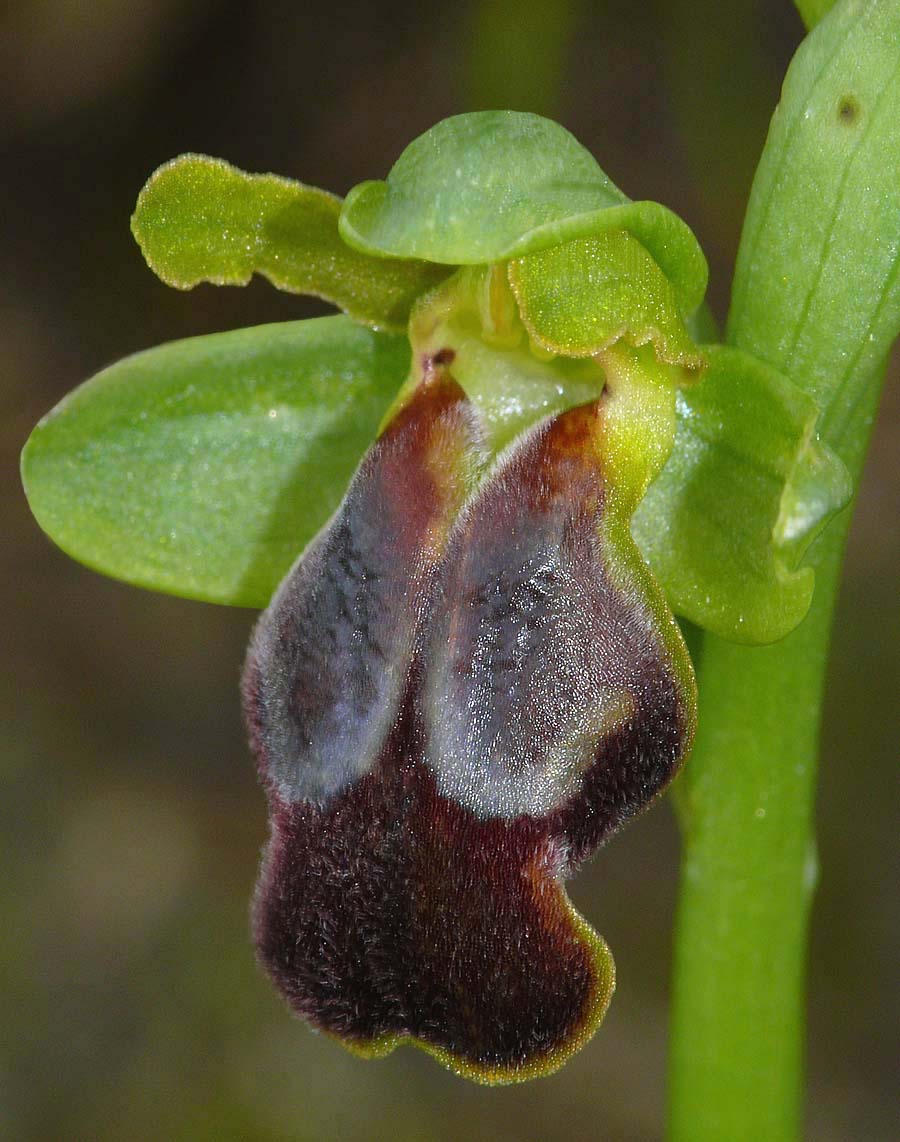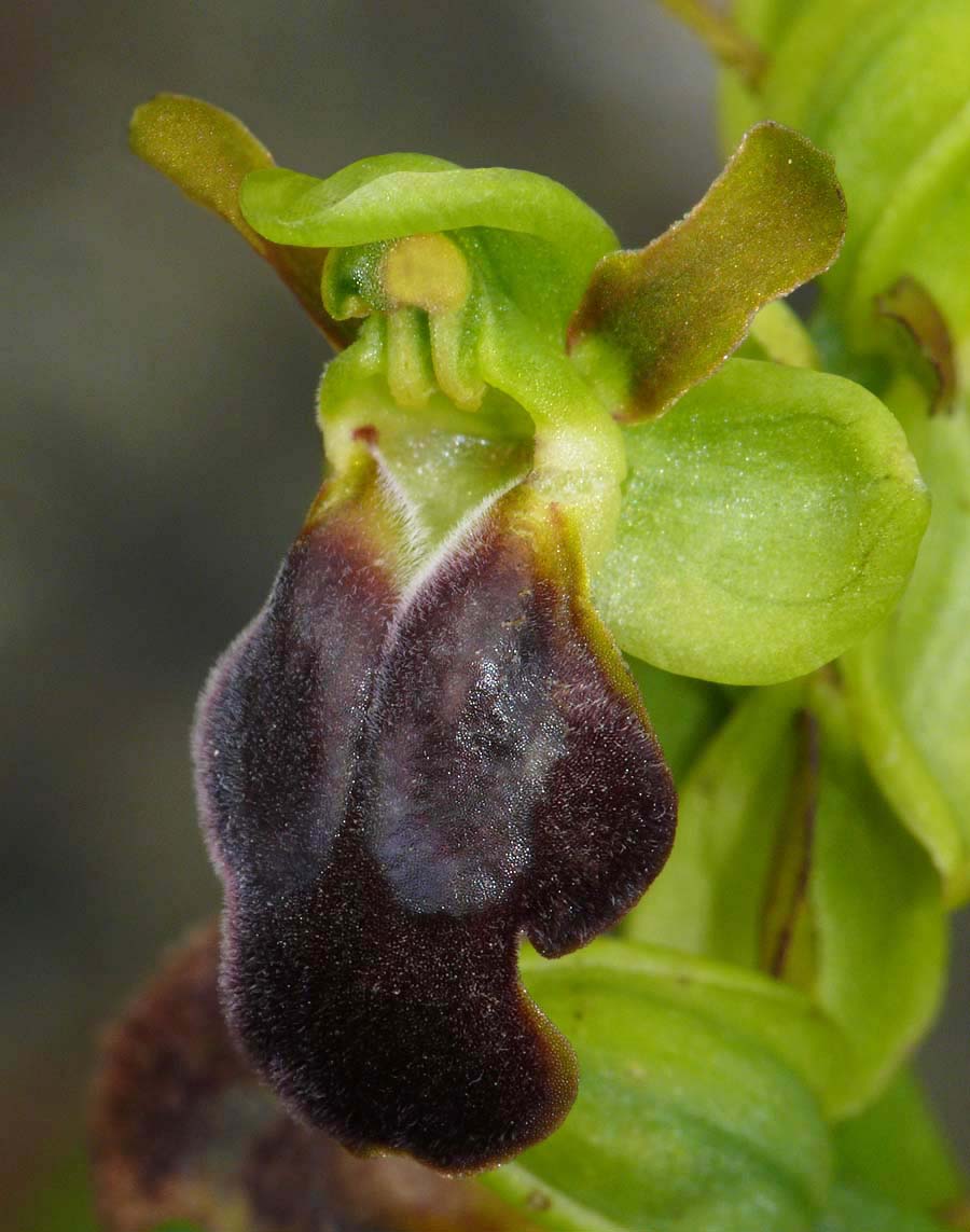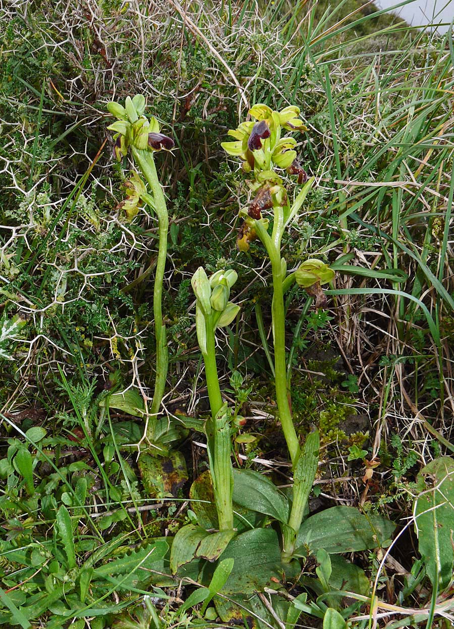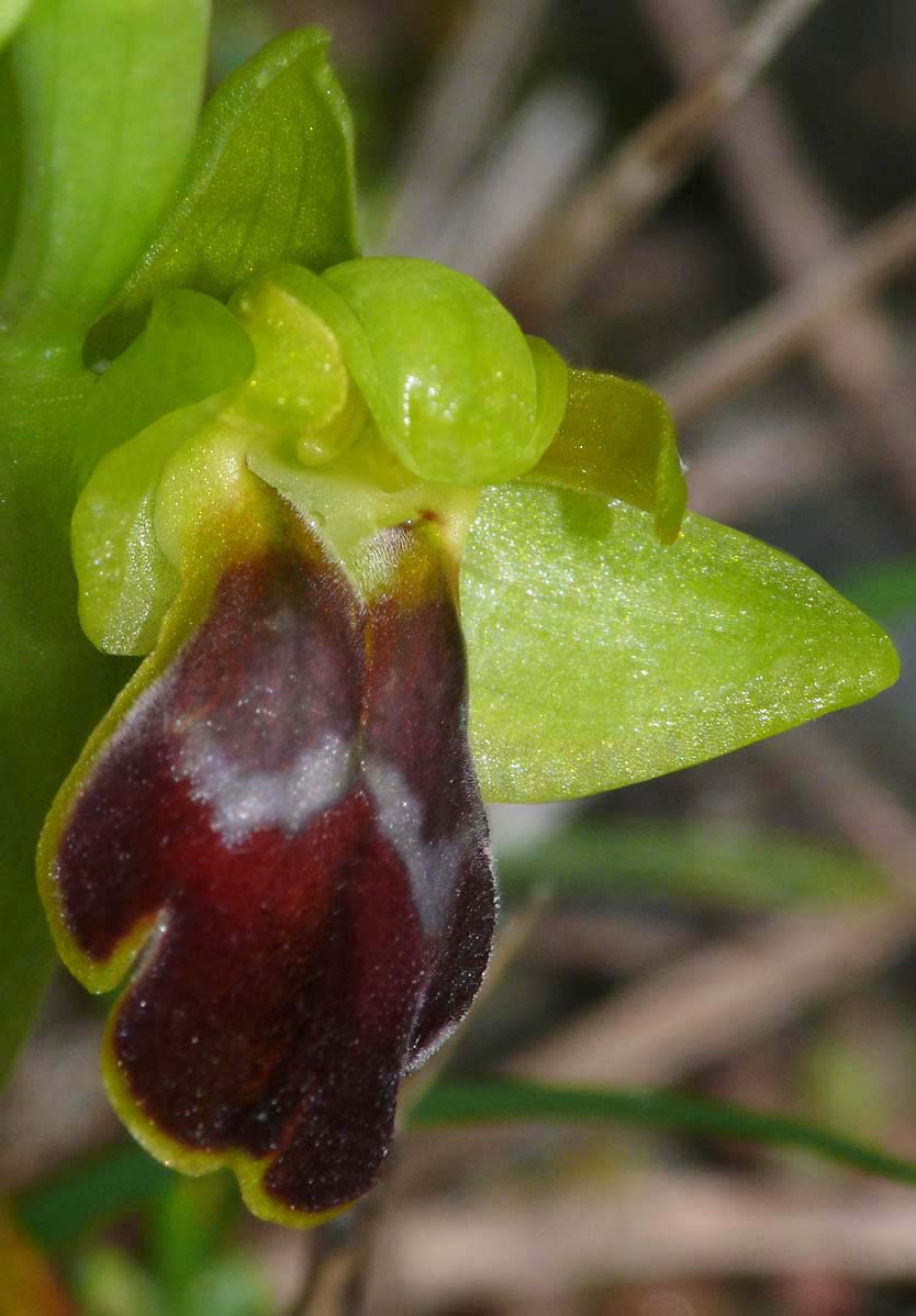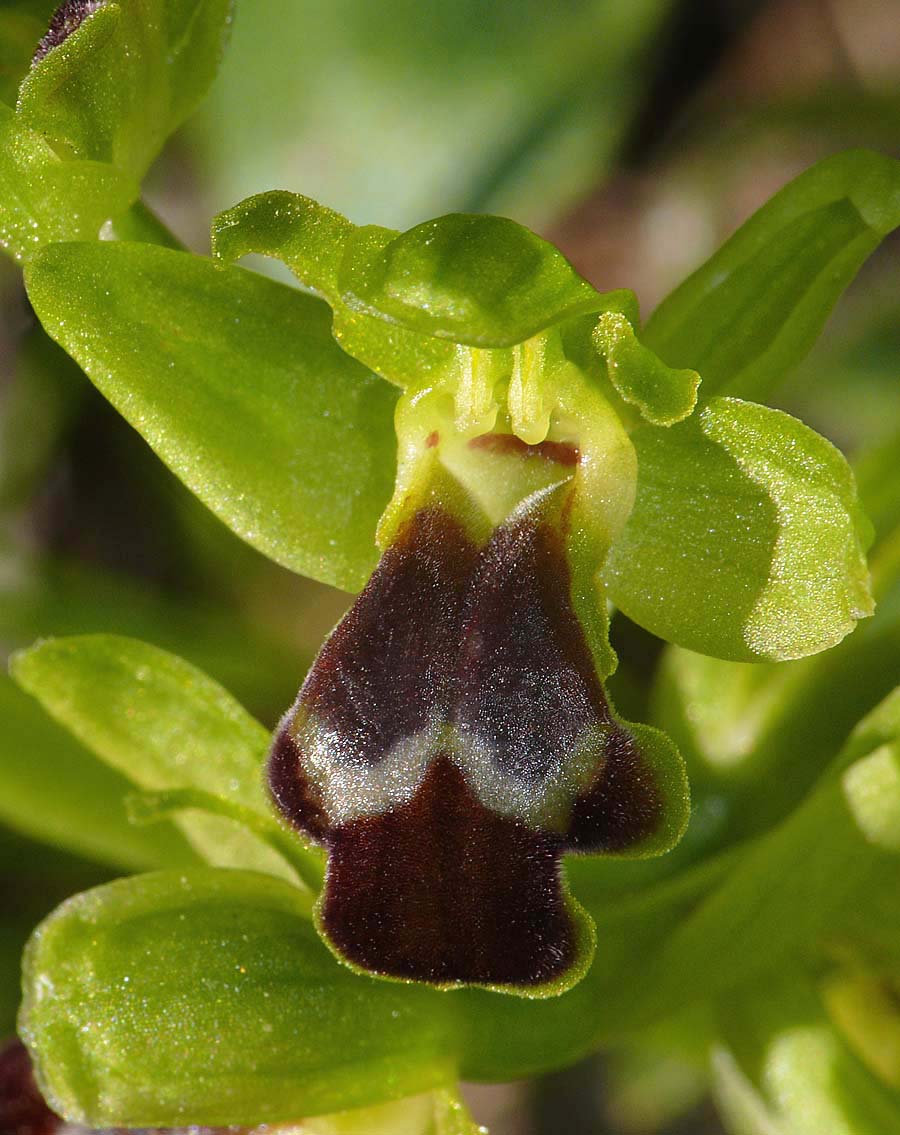 O. phaidra is endemic to Crete but is not at all uncommon and appears to be spread widely across suitable habitats throughout the island. Its distribution includes the Thripti mountains and it is therefore in contact with several other of the numerous Cretan Pseudophrys species in that area, not least the similar O. pallidula. It can also be mistaken for the widespread O. creberrima but differs from this species primarily by the deeper and longer central groove separating the lip, which also tends to be flatter and less recurved at the margins. Importantly it is a later flowerer and although the two species may be found growing concurrently, O.phaidra will be at its best when the flowers of O. creberrima are fading. O. phaidra and O. pallidula share identical habitat preferences and flower at a similar time, its therefore unsurprising that hybridization is recorded, although the pollinator of O. phaidra has yet to be identified. This species flowers during April and early May and the picture here was taken at a well known site above the village of Spili on the 17th of April. |
