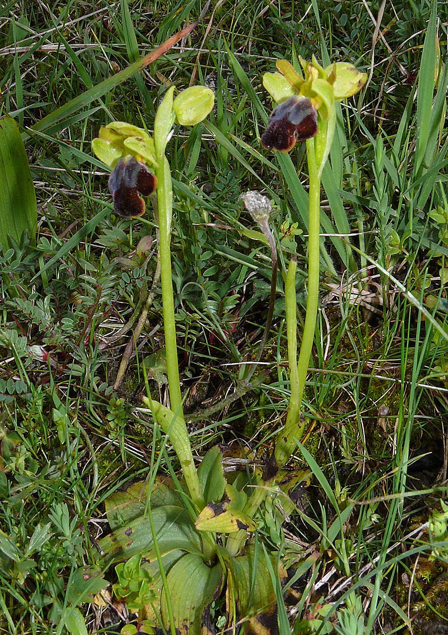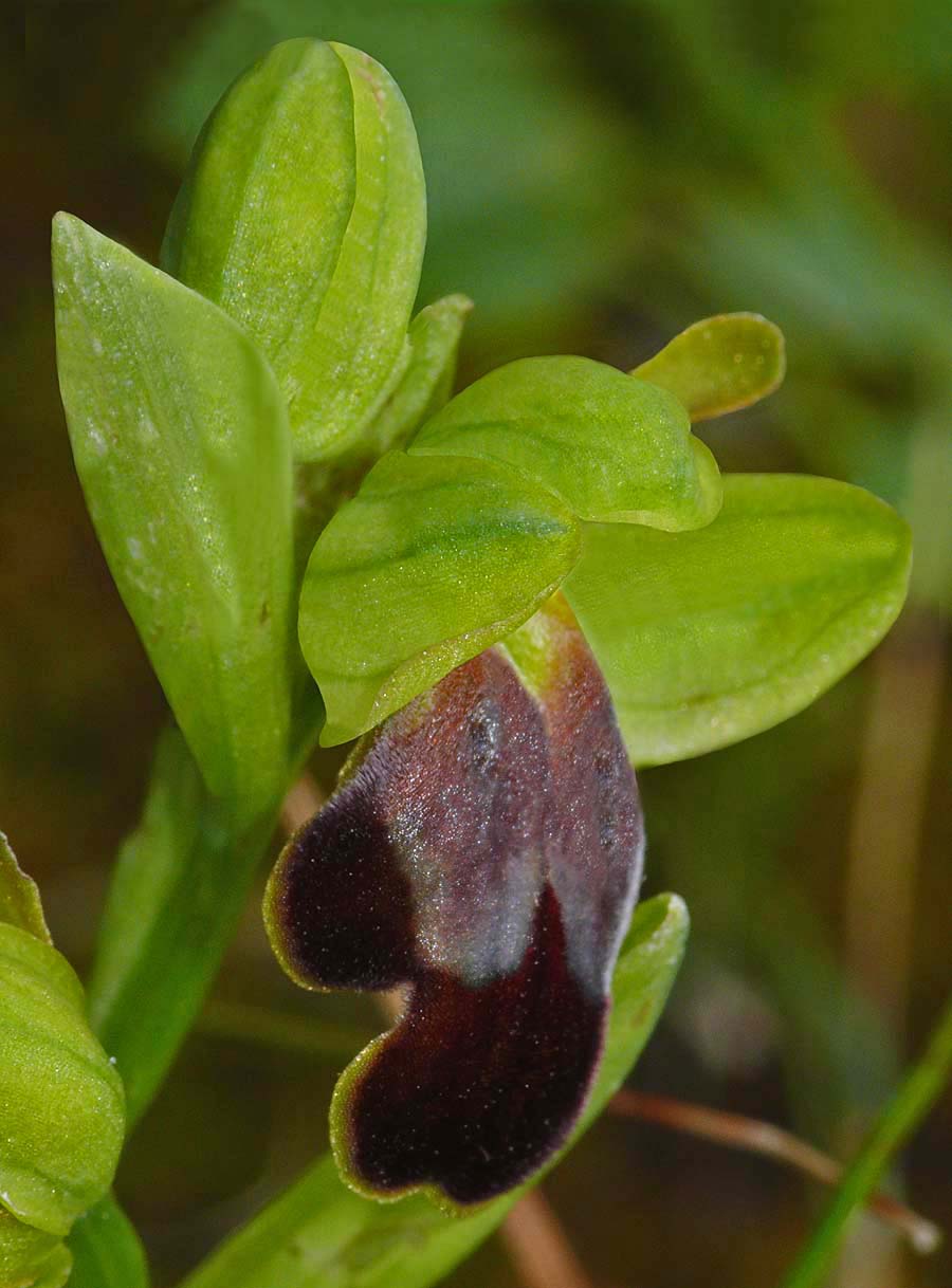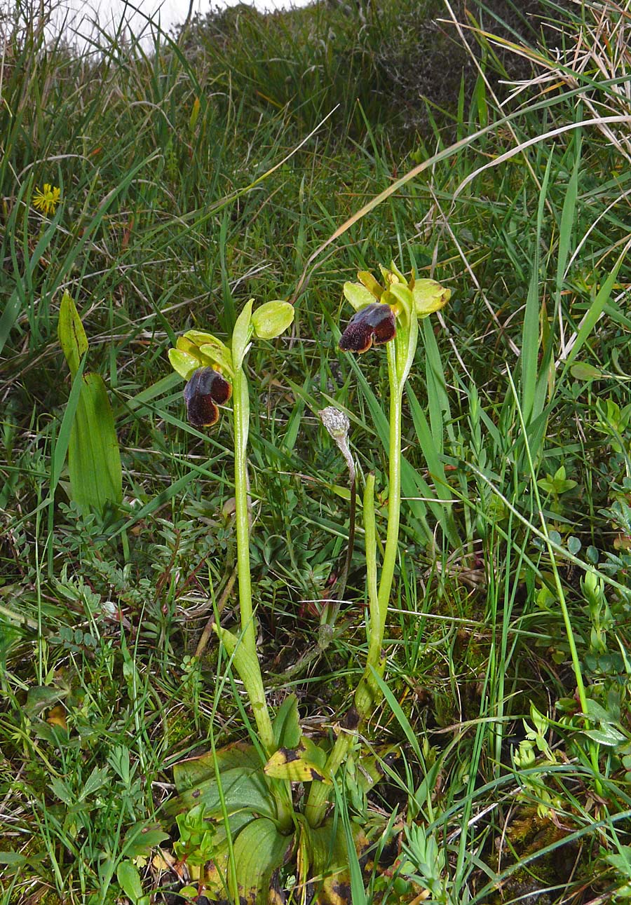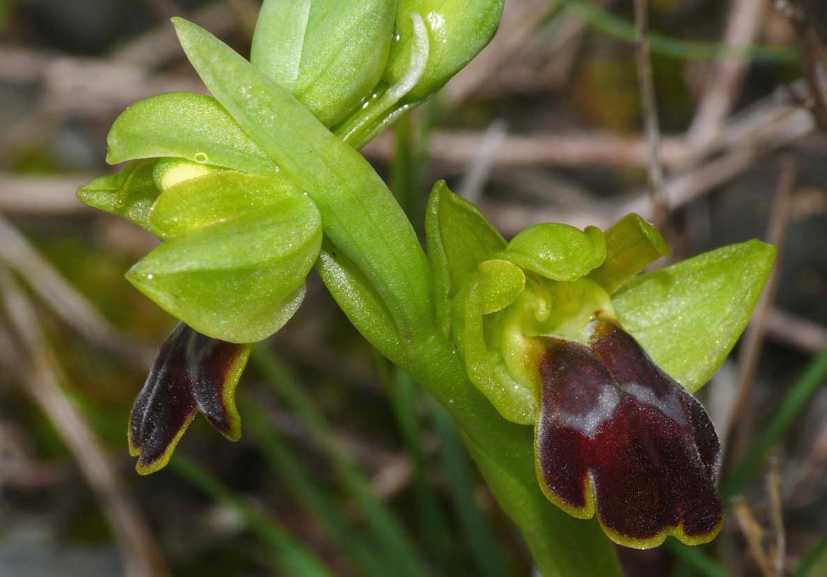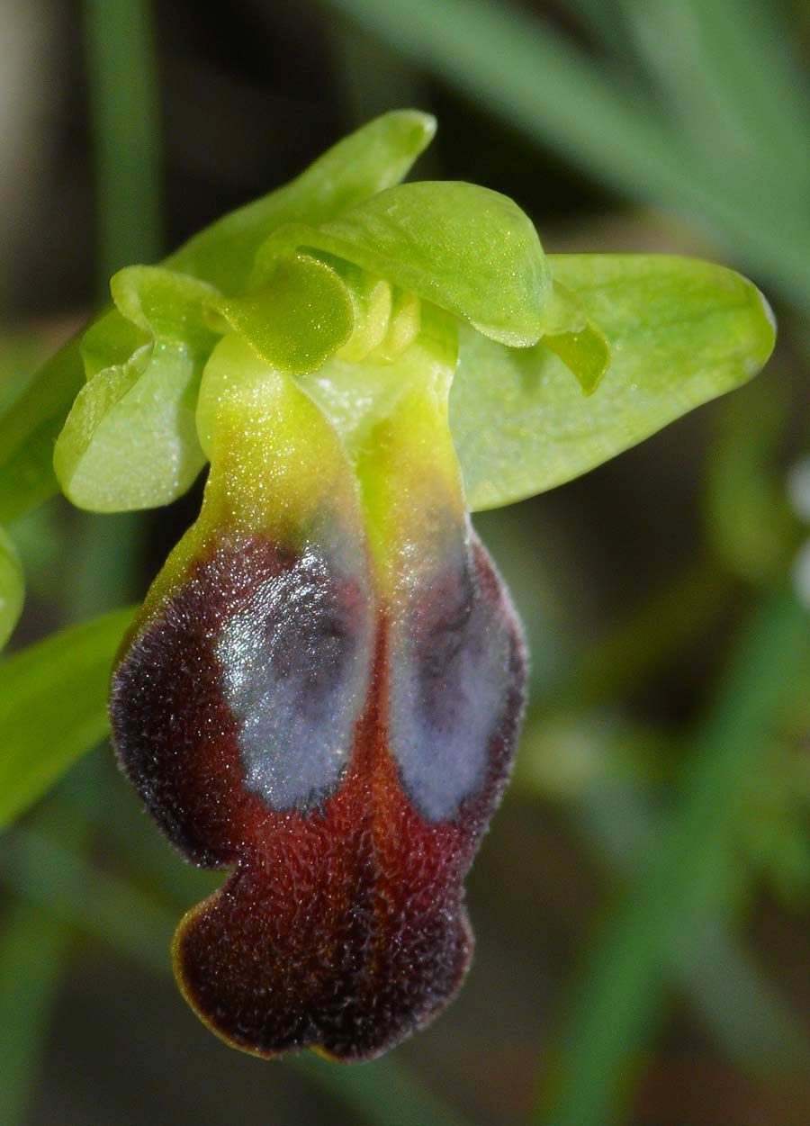 O. phaidra is endemic to Crete but is not at all uncommon and appears to be spread widely across suitable habitats throughout the island. Its distribution includes the Thripti mountains and it is therefore in contact with several other of the numerous Cretan Pseudophrys species in that area, not least the similar O. pallidula. It can also be mistaken for the widespread O. creberrima but differs from this species primarily by the deeper and longer central groove separating the lip, which also tends to be flatter and less recurved at the margins. Importantly it is a later flowerer and although the two species may be found growing concurrently, O.phaidra will be at its best when the flowers of O. creberrima are fading. O. phaidra and O. pallidula share identical habitat preferences and flower at a similar time, its therefore unsurprising that hybridization is recorded, although the pollinator of O. phaidra has yet to be identified. This species flowers during April and early May and the picture here was taken at a well known site above the village of Spili on the 17th of April. |
