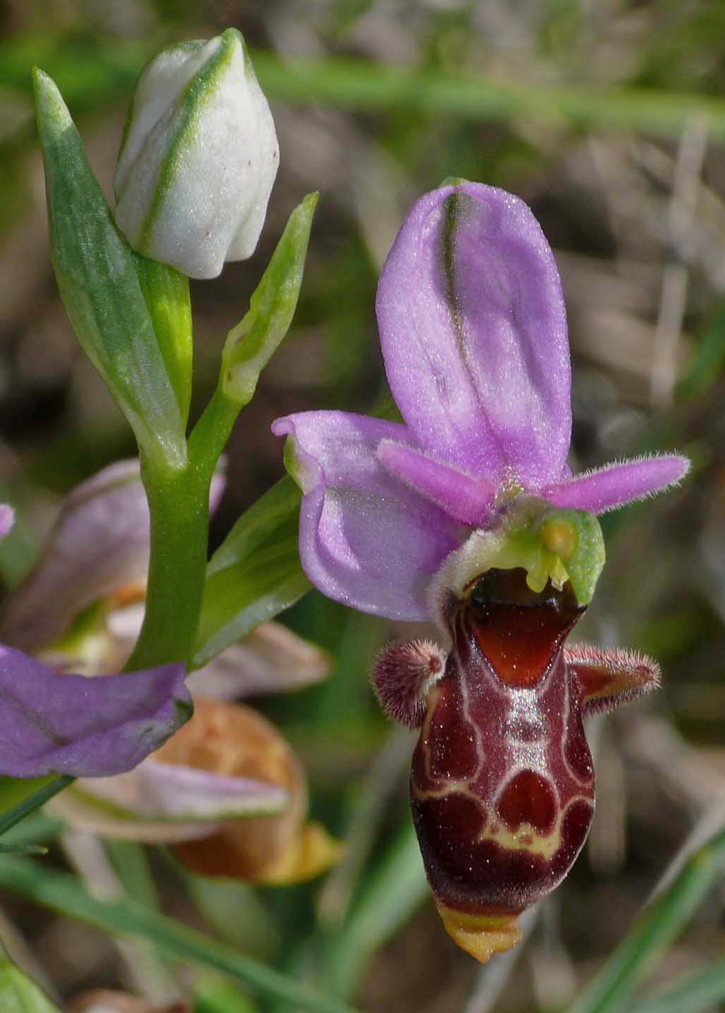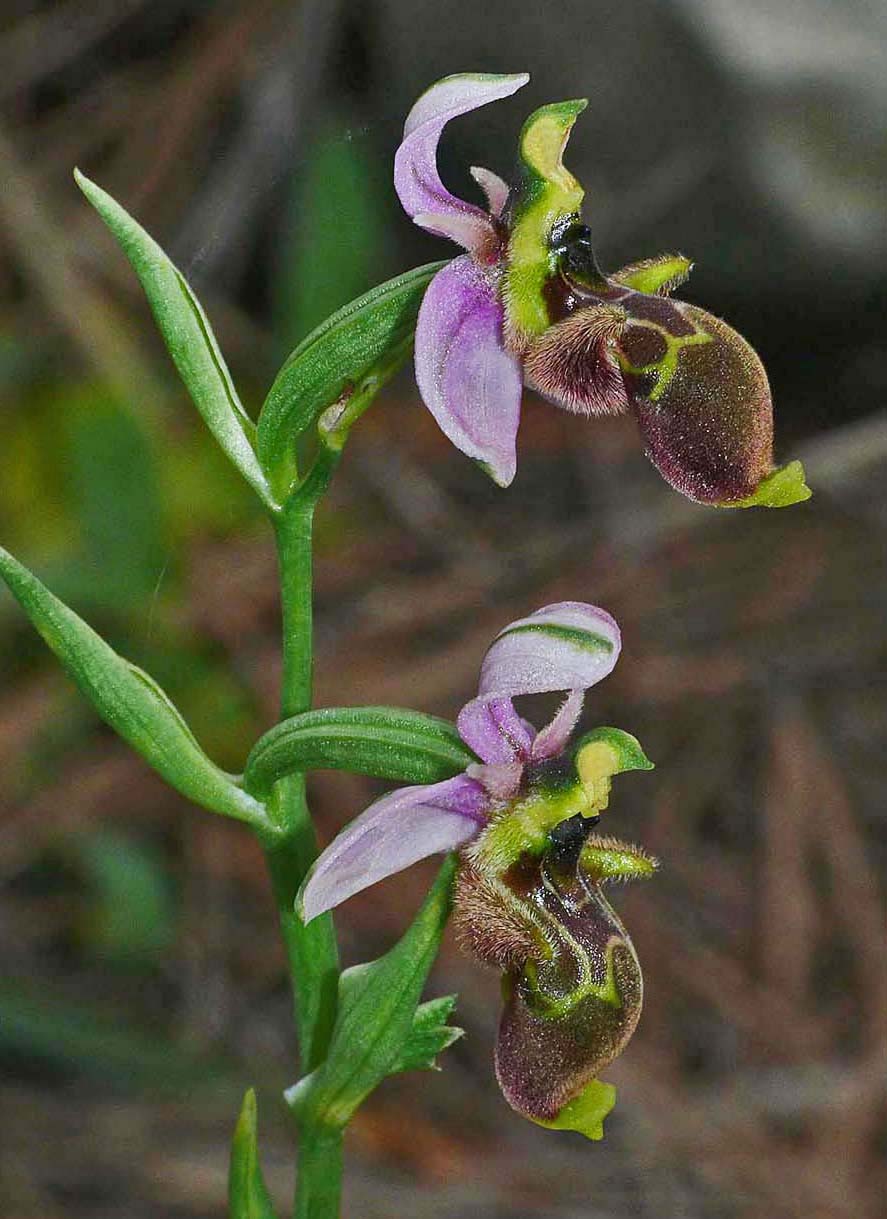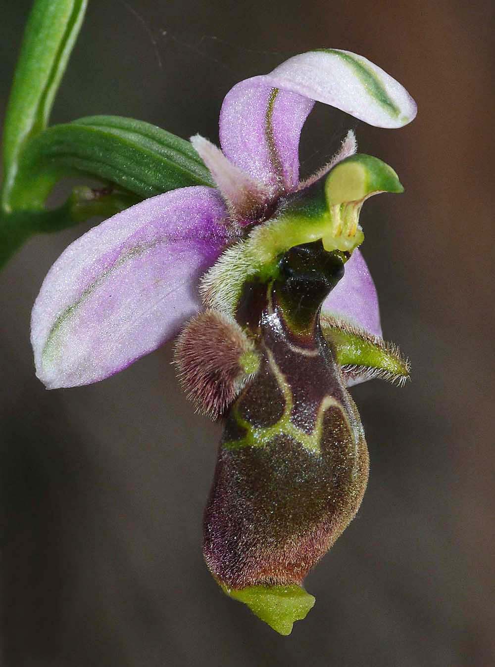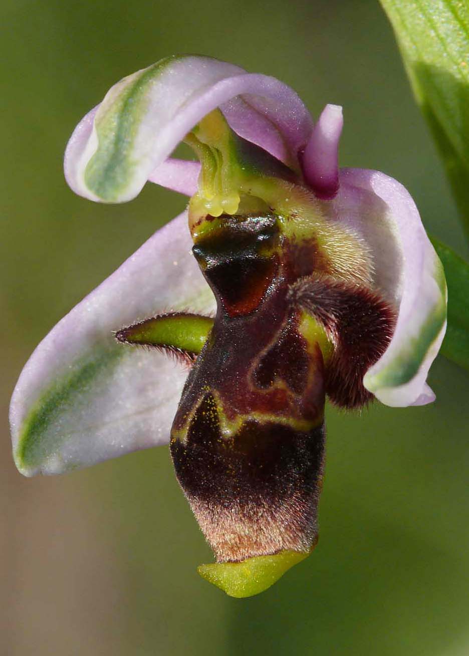 This species is essentially an orchid of the Iberian peninsula but which can stray across the French border into the Pyrenees, as far north as the Corbieres. O. picta may also be found in Sardinia, Tunisia and possibly Morocco, albeit very rarely. Its range is not however known with any certainty due to its similarity to other locally occurring species such as O. sphegifera. Although the labellum is very similar it differs from this species by virtue of the sepals which in that species are always greenish whereas in O. picta can vary from white to pale pink. They are never a dark pink and this characteristic helps differentiate it from the more robust flower of O. scolopax. The petals are usually long, thin, vaguely triangular and of a darker shade than the sepals. In the paler examples the base of the petals are often washed with a violet hue and this characteristic can be clearly noted in picture ten. The stigmatic cavity is large, usually dark brown to dark rusty red and the base is broad and less constricted than that of either O. scolopax or O. sphegifera. O. picta is an early flowerer (February to May) and is normally past its best when both the above Ophrys are in their prime. Its a species of alkaline soils and although it will tolerate moderate shade, clearly prefers a position in full sun. The accompanying pictures are all from the Corbieres region of Southern France and the Province of Malaga in Southern Spain. They date from the middle of April by which time many of the plants were well past their best.. |