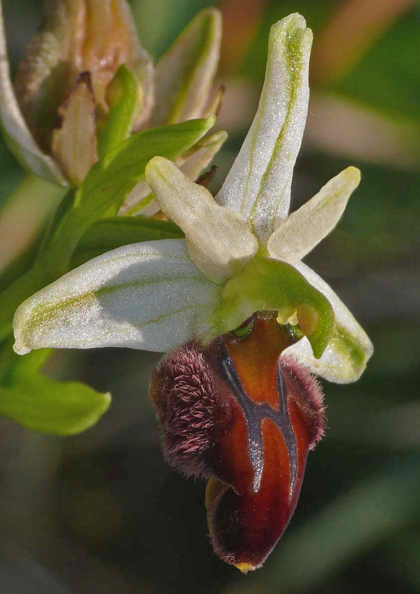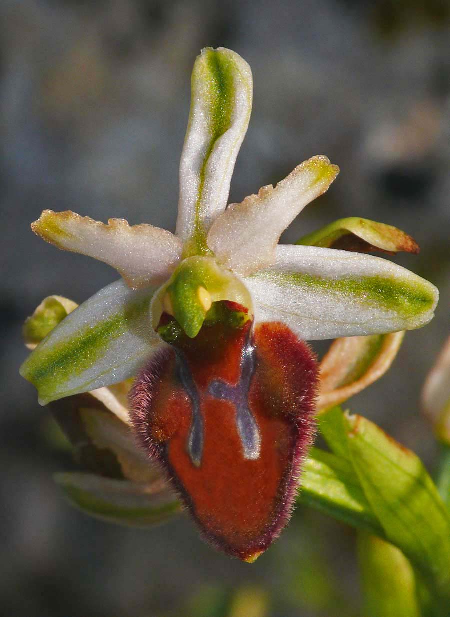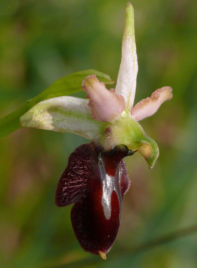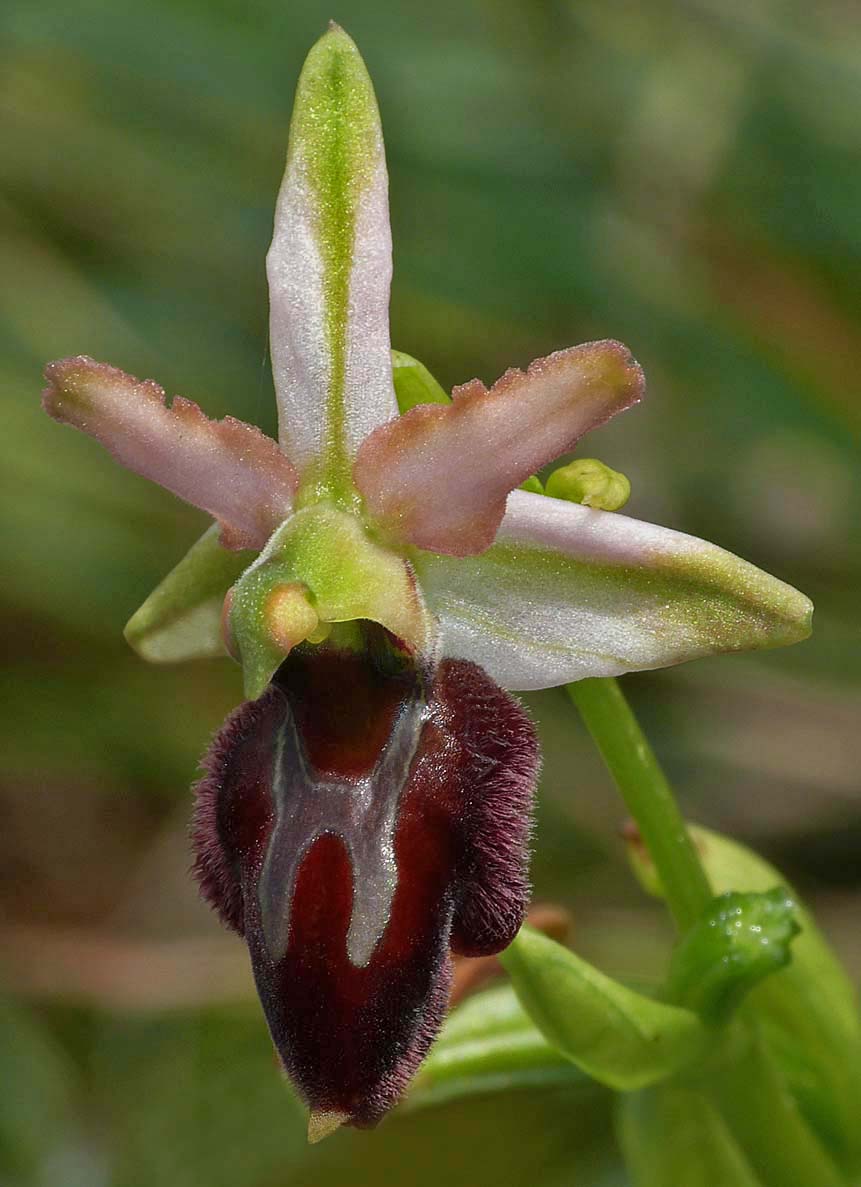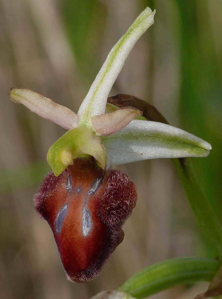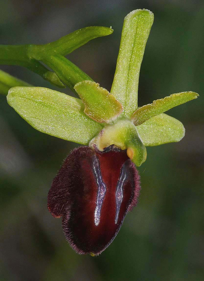 This species is endemic to Sardinia and Corsica where it is both very local and very rare. In Sardinia it is restricted to the north of the island, centred on the Province of Sassari whilst in Corsica it is similarly restricted, but to the southern most parts of the island around Bonaficio. Despite its tolerance of a wide range of habitats and light conditions, it is an extremely shy orchid that is unaccountably absent from large, apparently suitable areas of the islands. As can be seen from the illustrations, O. praecox can be a variable species though typically it is small flowered with a dark red lip and normally concolorous basal field and stigmatic cavity. The speculum is uncomplicated, varying from a simple H, to a pair of parallel lines or droplets and sepals that are green veined white/pink with darker petals. O. praecox is a very early flowerer but can marginally overlap with O. morisii when the latter appears at the start of April. These two species can sometimes be difficult to separate, this being unsurprising given that O. morisii is thought to be a hybridogenous species with O. praecox or a similar O. exaltata group member as one of the parents. The most reliable way of differentiating them is flowering time as O. praecox will be rapidly declining when O. morisii is just commencing its flowering cycle. The photos come from Sardinia and date from the first week of April at which time the plants were well past their best. |