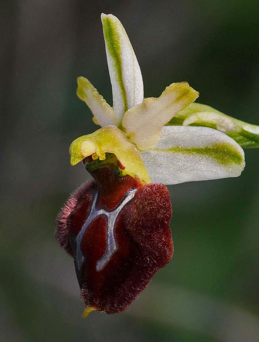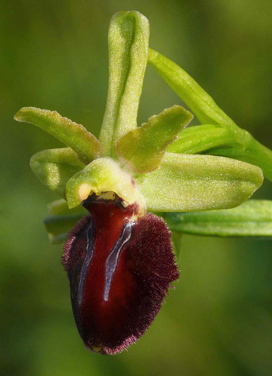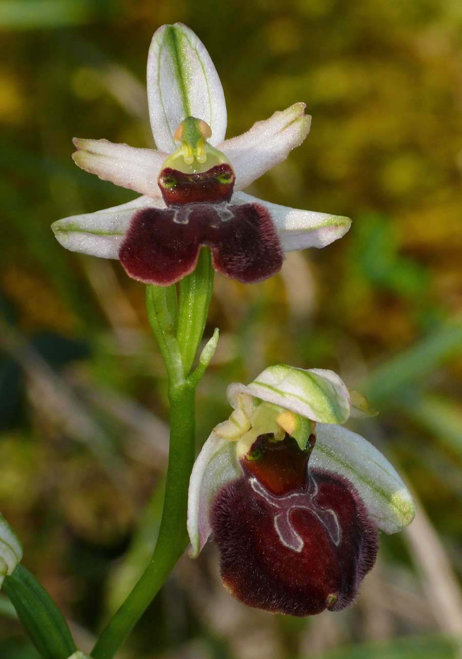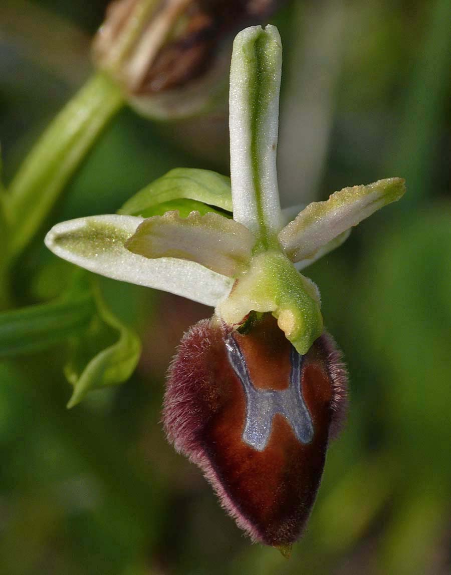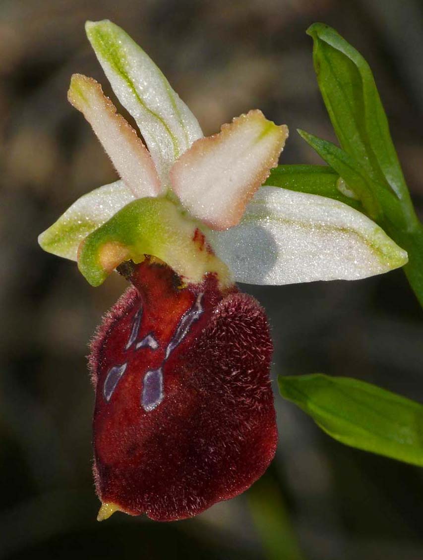 This species is endemic to Sardinia and Corsica where it is both very local and very rare. In Sardinia it is restricted to the north of the island, centred on the Province of Sassari whilst in Corsica it is similarly restricted, but to the southern most parts of the island around Bonaficio. Despite its tolerance of a wide range of habitats and light conditions, it is an extremely shy orchid that is unaccountably absent from large, apparently suitable areas of the islands. As can be seen from the illustrations, O. praecox can be a variable species though typically it is small flowered with a dark red lip and normally concolorous basal field and stigmatic cavity. The speculum is uncomplicated, varying from a simple H, to a pair of parallel lines or droplets and sepals that are green veined white/pink with darker petals. O. praecox is a very early flowerer but can marginally overlap with O. morisii when the latter appears at the start of April. These two species can sometimes be difficult to separate, this being unsurprising given that O. morisii is thought to be a hybridogenous species with O. praecox or a similar O. exaltata group member as one of the parents. The most reliable way of differentiating them is flowering time as O. praecox will be rapidly declining when O. morisii is just commencing its flowering cycle. The photos come from Sardinia and date from the first week of April at which time the plants were well past their best. |