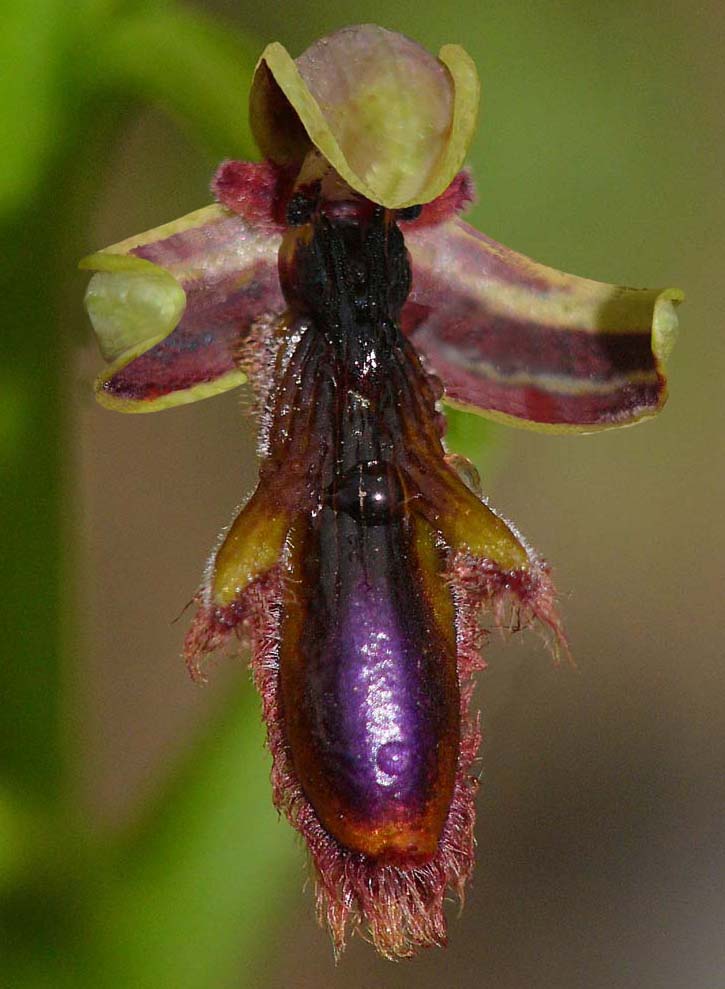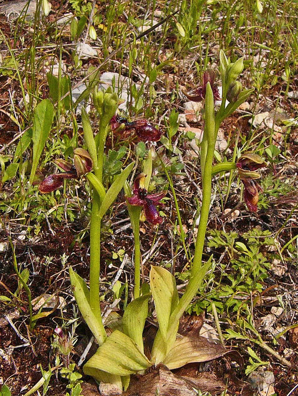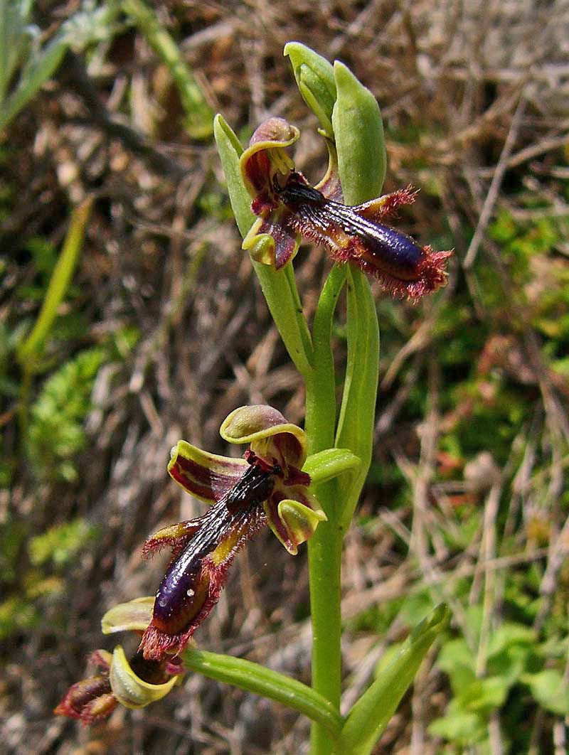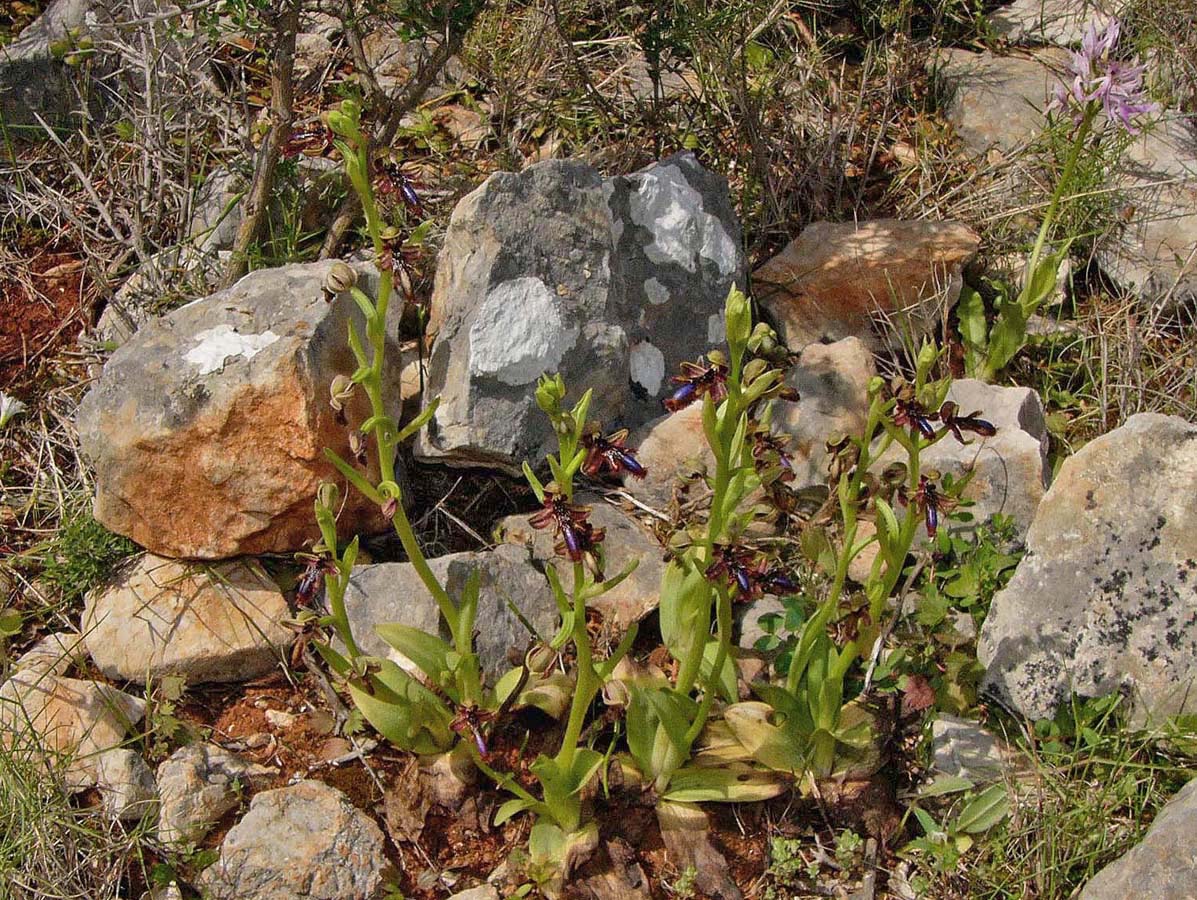 Named after Ferdinand the first, King of Bulgaria, this little Ophrys originally rejoiced in the name of Ophrys regis-ferdinandii-coburgii. It almost seems a shame that such a regal name has now been abbreviated, though whether the late monarch was entirely pleased to lend his name to such an unprepossessing flower is unknown. Unprepossessing it may be but this rare little Ophrys possess a great deal of character and interest. As with its two cousins in the O. speculum group, it is a small plant and easily overlooked. It occasionally grows to 25cms but is more usually somewhat shorter, though it can produce a good number of individual flowers per spike and form many stemmed clumps. In its genetically pure form it is a remarkably stable species but is however promiscuous and regular hybridisation can create some peculiar looking results. On Rhodes, O.regis-fernandii can grow in close proximity to its near relative O. speculum and hybrids are relatively common. Its range is limited to western Anatolia and the Aegean basin where it is present on Chios, Samos and Rhodes, though curiously absent from Lesbos. Very much an orchid of full sun and dry calcareous soils, this species , perhaps unsurprisingly, does not retain its flowers for very long. It appears early and is in full bloom by mid March, at a time when O. speculum is still 2 or 3 weeks away from flowering. The pictures are from Chios and Rhodes, dating from the first week of April. |