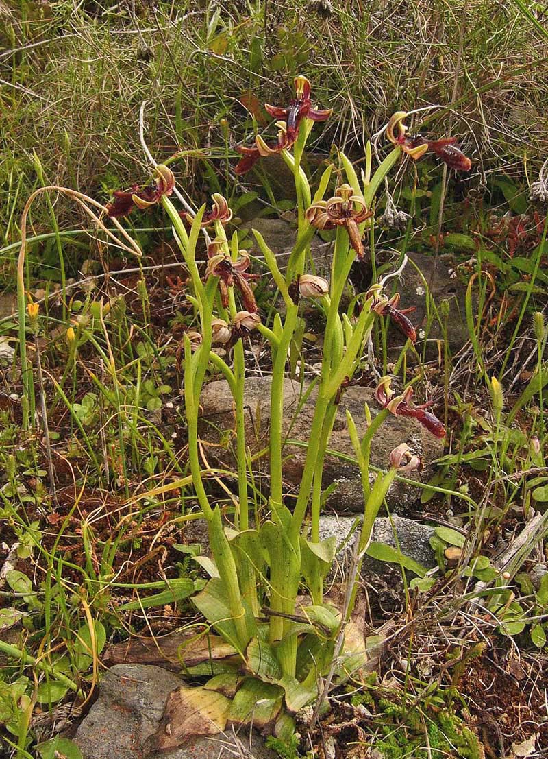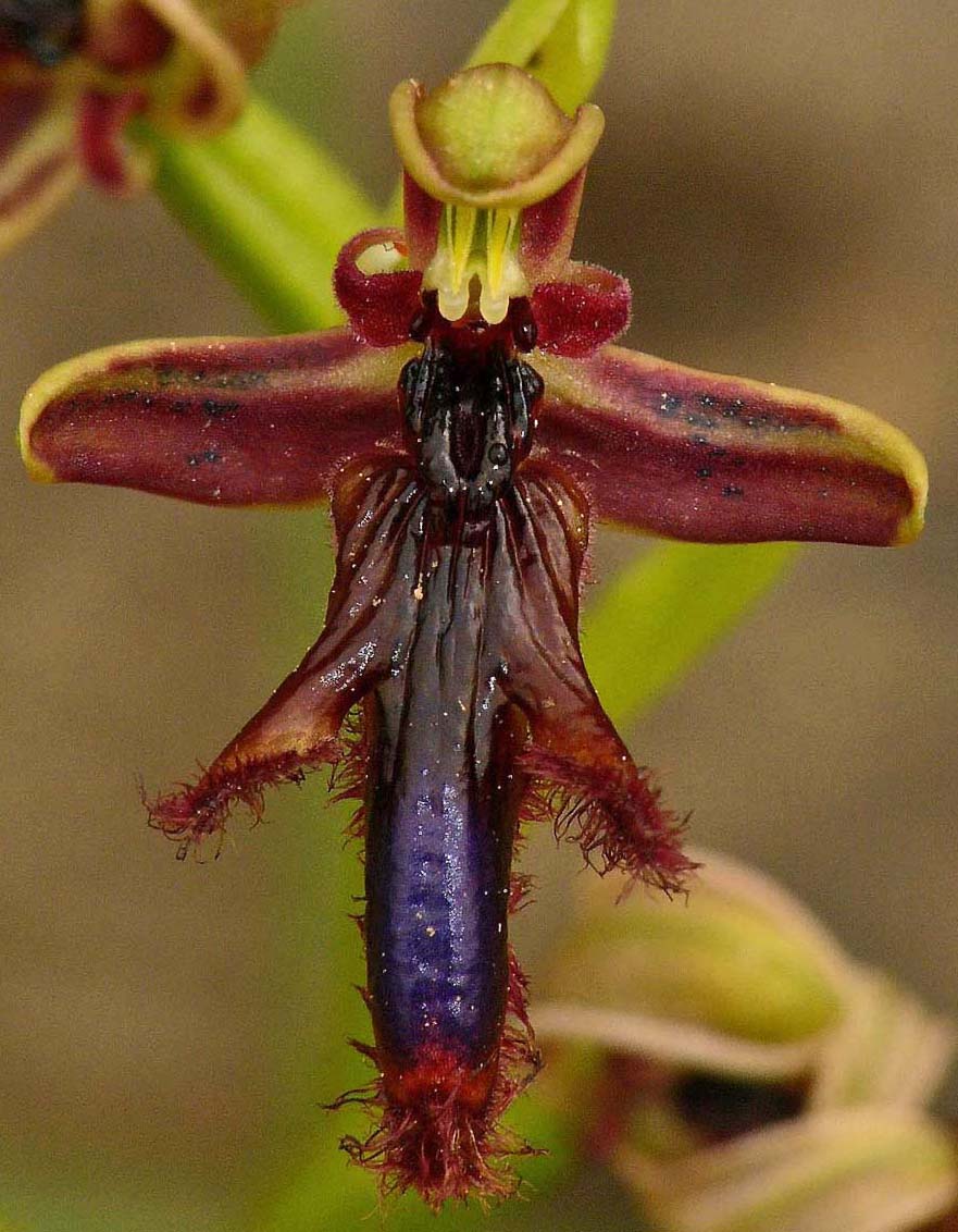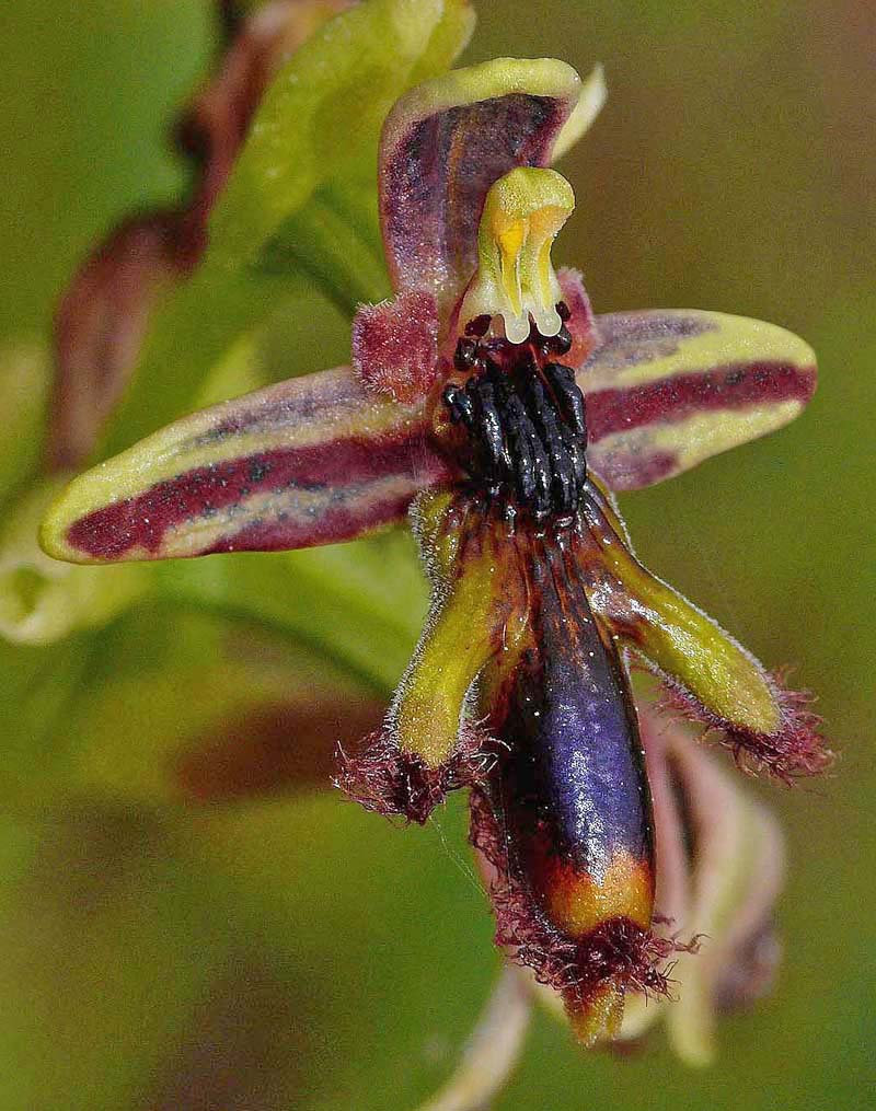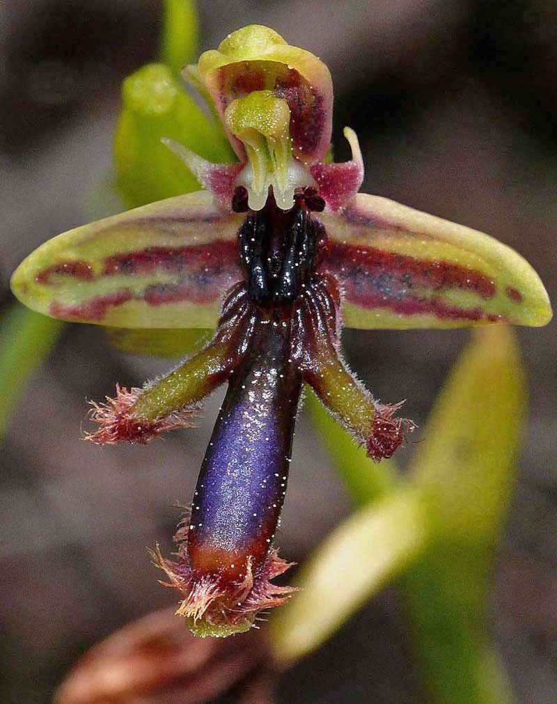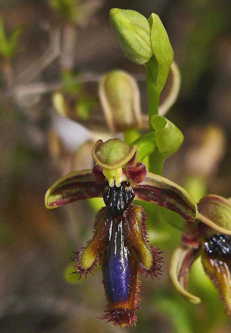 Named after Ferdinand the first, King of Bulgaria, this little Ophrys originally rejoiced in the name of Ophrys regis-ferdinandii-coburgii. It almost seems a shame that such a regal name has now been abbreviated, though whether the late monarch was entirely pleased to lend his name to such an unprepossessing flower is unknown. Unprepossessing it may be but this rare little Ophrys possess a great deal of character and interest. As with its two cousins in the O. speculum group, it is a small plant and easily overlooked. It occasionally grows to 25cms but is more usually somewhat shorter, though it can produce a good number of individual flowers per spike and form many stemmed clumps. In its genetically pure form it is a remarkably stable species but is however promiscuous and regular hybridisation can create some peculiar looking results. On Rhodes, O.regis-fernandii can grow in close proximity to its near relative O. speculum and hybrids are relatively common. Its range is limited to western Anatolia and the Aegean basin where it is present on Chios, Samos and Rhodes, though curiously absent from Lesbos. Very much an orchid of full sun and dry calcareous soils, this species , perhaps unsurprisingly, does not retain its flowers for very long. It appears early and is in full bloom by mid March, at a time when O. speculum is still 2 or 3 weeks away from flowering. The pictures are from Chios and Rhodes, dating from the first week of April. |