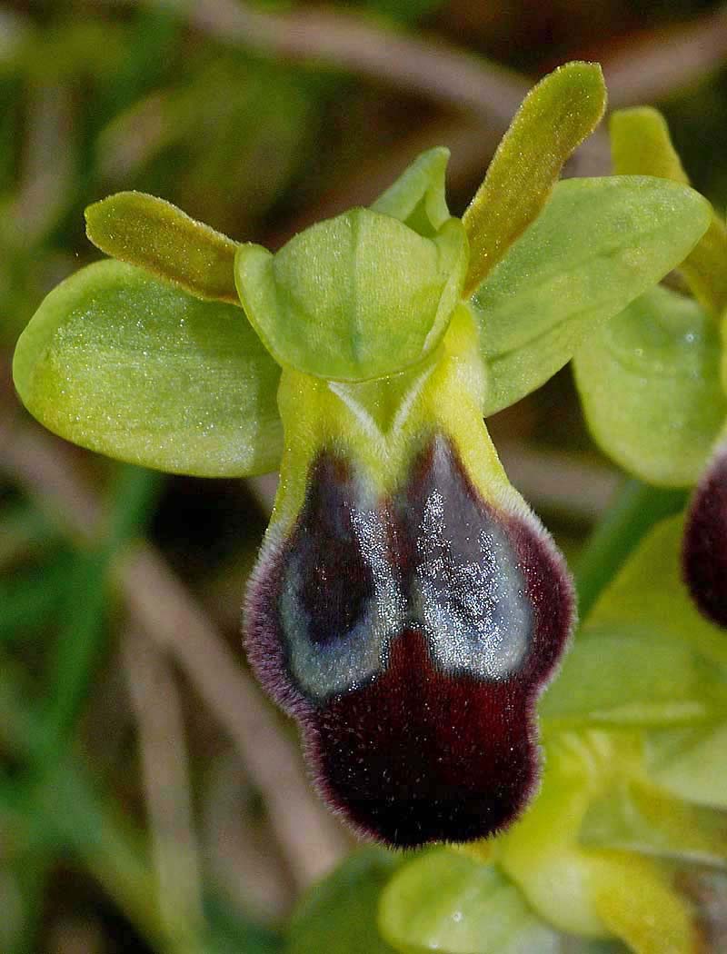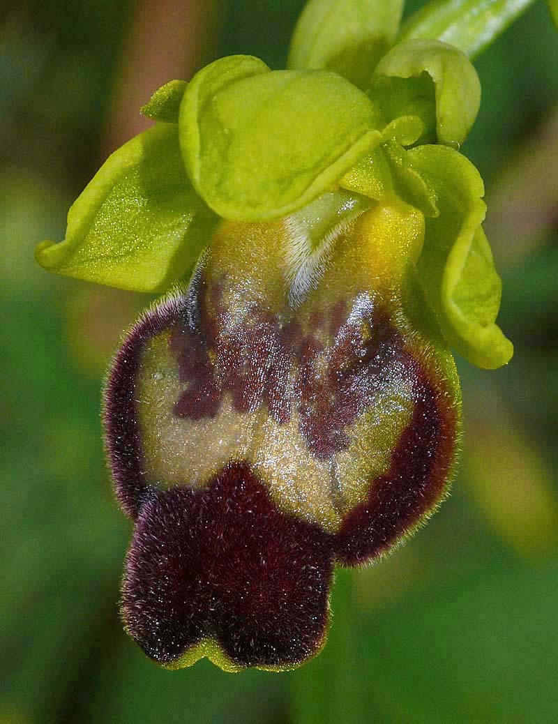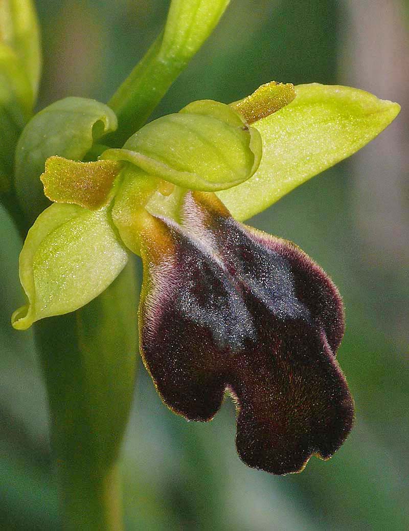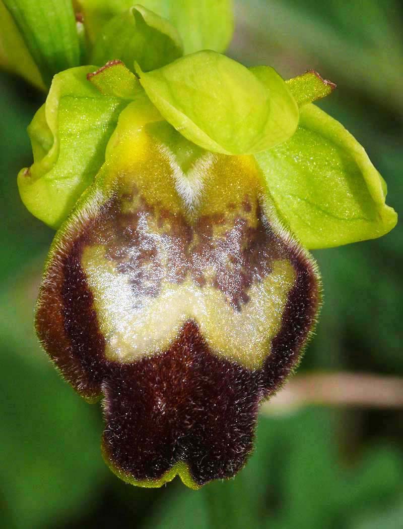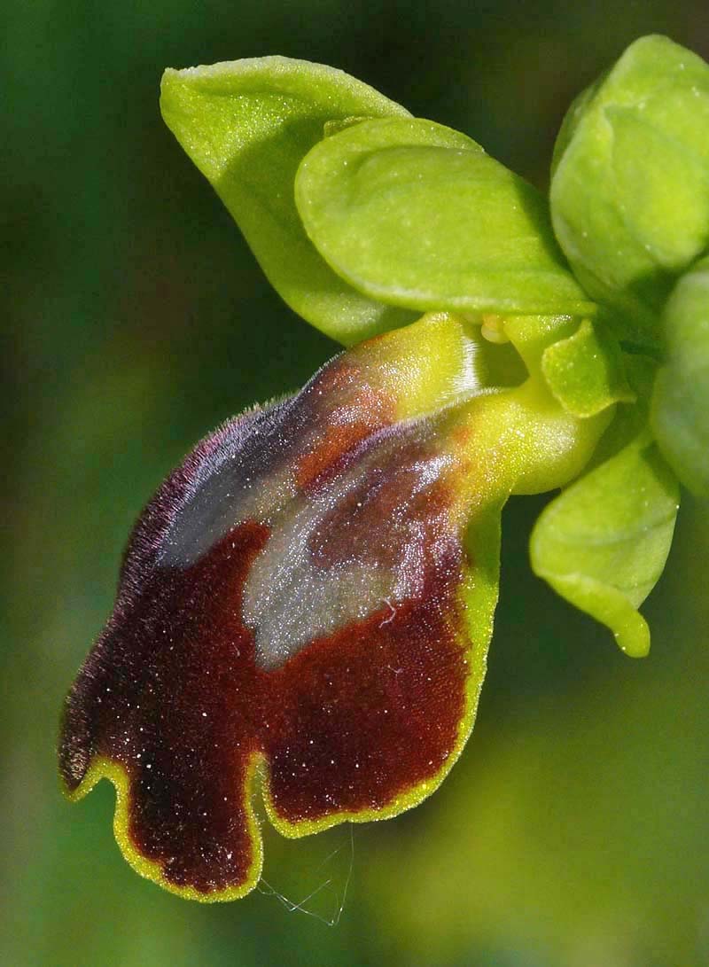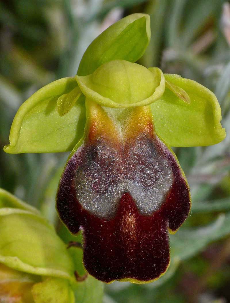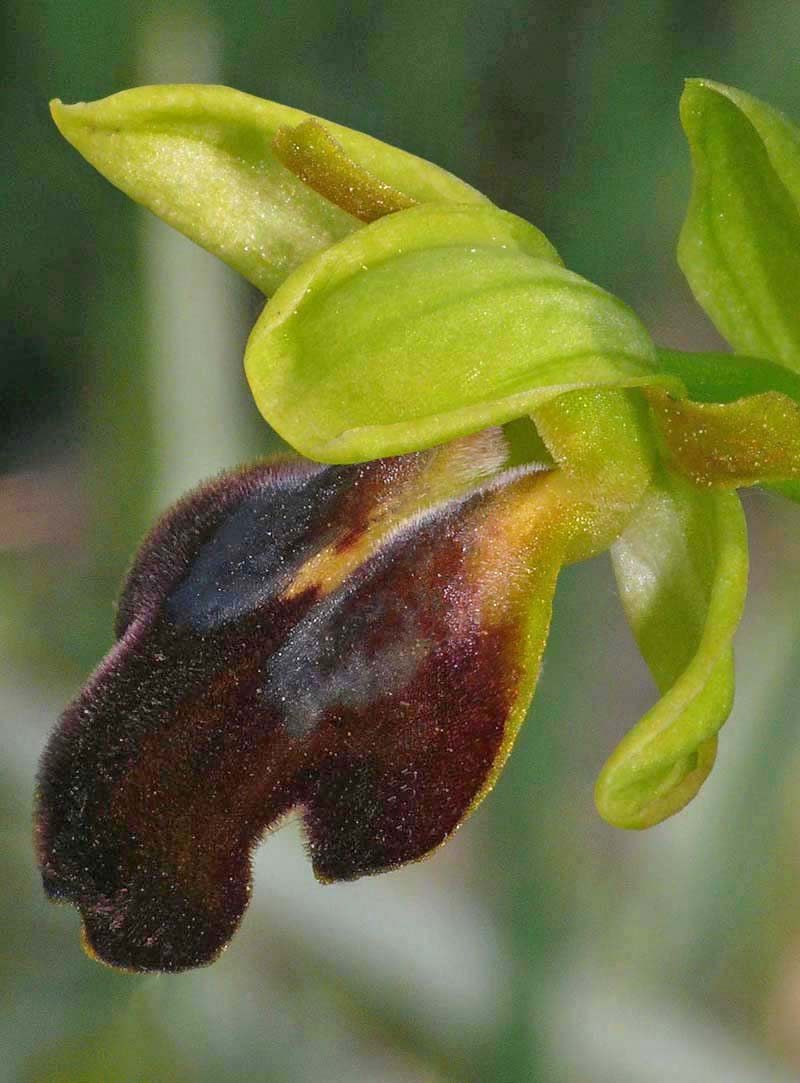 This Ophrys was first described by Paulus and Gack from Palermo, Sicily in 2004 and was named after its pollinator (Andrena sabulosa). O. sabulosa is one of several Sicilian Pseudophrys that were being studied in the late 20th century, and as described under O. flammeola, is one of the species that has caused some considerable botanical argument, particularly between Paulus/Gack and Delforge. There is still some difference of view regarding the relationship between this Sicilian endemic and both O. gackiae and O. lupercalis, where despite comprehensive segregation work, there remains a significant number of authorities who believe them all to be simply seasonally influenced morphs of the same species. In Sicily O. lupercalis is morphologically very like the endemic O. sabulosa although the former orchid is an extremely early flowerer and would be virtually over by the time the latter is starting to appear. It is just possible to find the two species flowering concurrently at different altitudes. O. sabulosa is the largest of these similar Pseudophrys both in flower size and in the robustness of the plant itself. The longitudinal prominences are massive and not only give the lip a pronounced kink but also serve to emphasize the depth and width of the stigmatic cavity. These features together with the deep central groove are highly distinctive and in the field, leave one with the impression of a very sturdy, rugged Ophrys. The photographs are all from southern Sicily where it grows quite commonly on calcareous substrates in full sun. The species is a late flowerer by Sicilian standards and the pictures here all date from the second two weeks of April. |