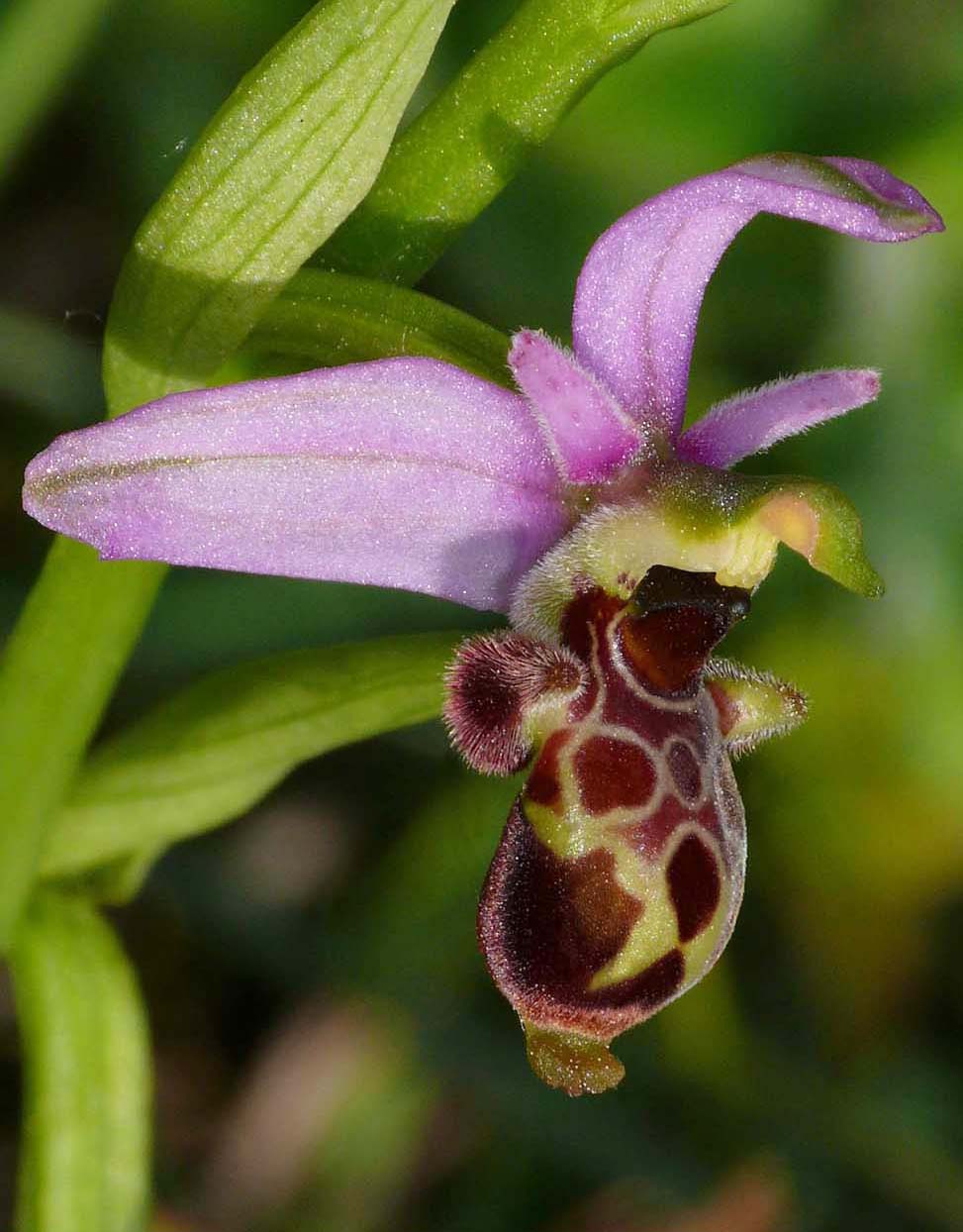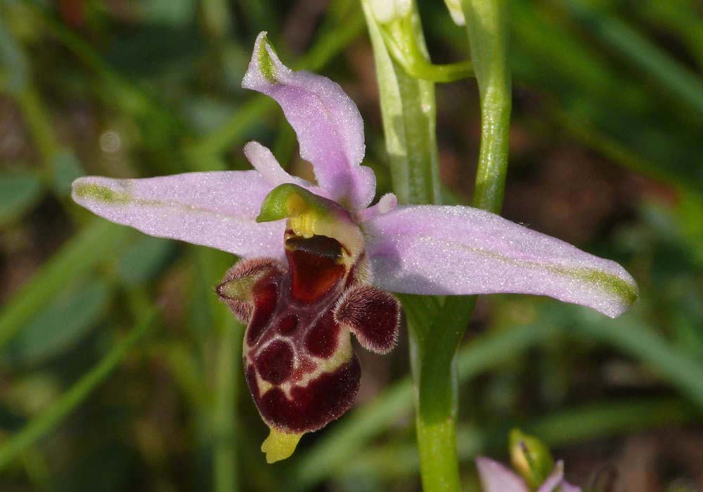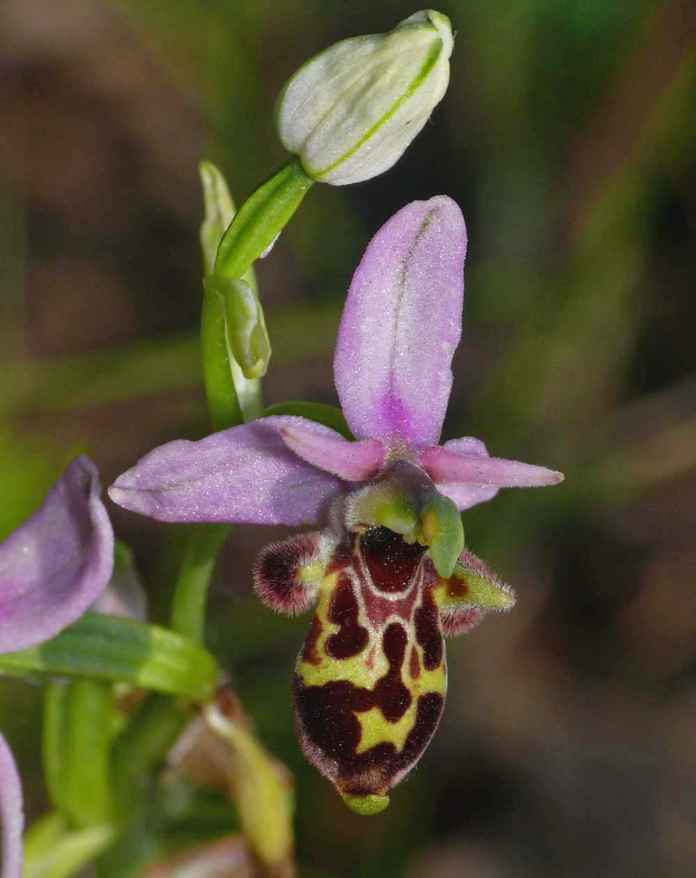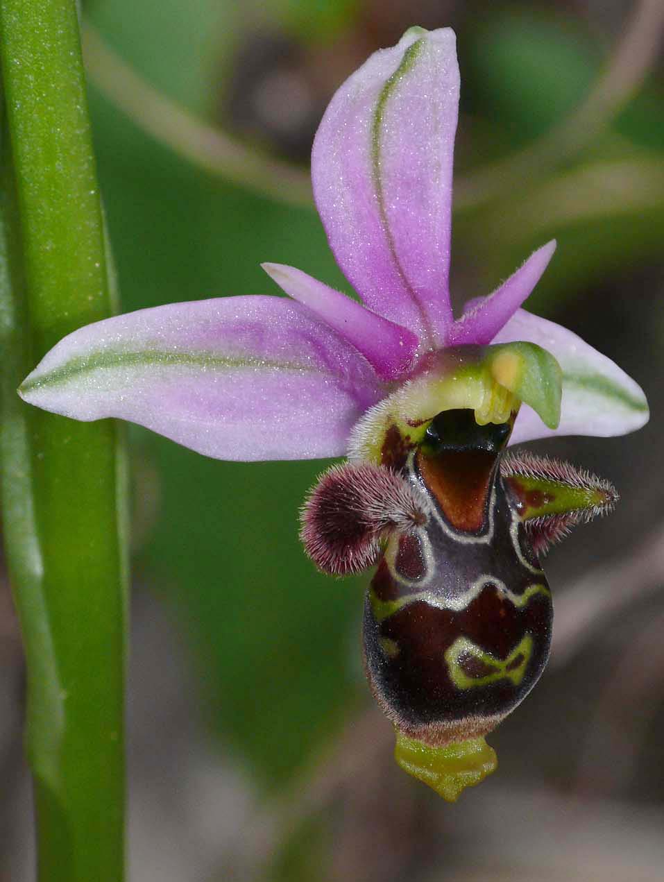 O. scolopax was first described by Cavanilles from Albaida, Spain as long ago as 1793 and takes its name from its perceived resemblance to the plumage of the woodcock, a small, long billed game bird ? Unsurprisingly its vernacular name is the Woodcock Ophrys. This is a widespread, western Mediterranean member of the small O. scolopax group with a range that takes it from Spain, through the Pyrenees into Southern France and as far east as Liguria in Italy. It can be found growing in very different types of habitat, tolerating either alkaline or acidic substrates, both in full sun or mid shade. Although O. scolopax frequently grows in the company of similar species, it's not particularly difficult to distinguish though some populations have suffered genetic interference from both O. corbariensis and O. picta and can exhibit intermediate characteristics. O. scolopax normally comes into flower in early April which depending on location, is up to a month later than O. picta and usually a month prior to O. corbariensis. In terms of proportions, both the flower and the overall plant of O. scolopax is mid sized between these other two species, being a significantly smaller flower than O. corbariensis but larger than O. picta. It is also by far the commonest of the three species and in its favoured locations may be abundant. The petals and sepals are normally concolourous and vary in shade from white to mauve, although they can very occasionally be a pink washed green. The pictures here come from various regions of southern France and northern Spain, dating from the first two weeks of April. |