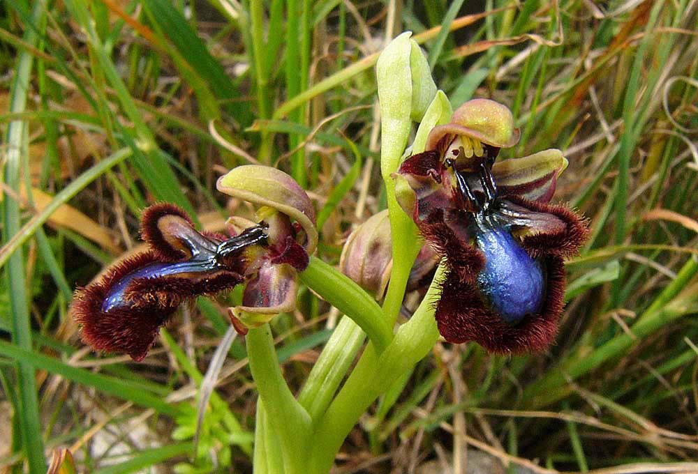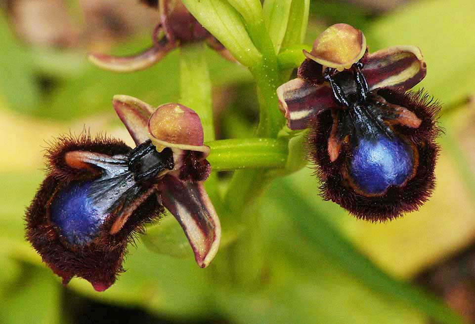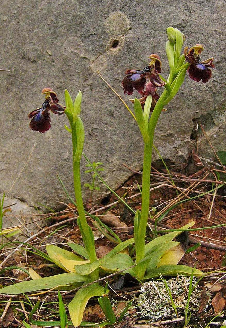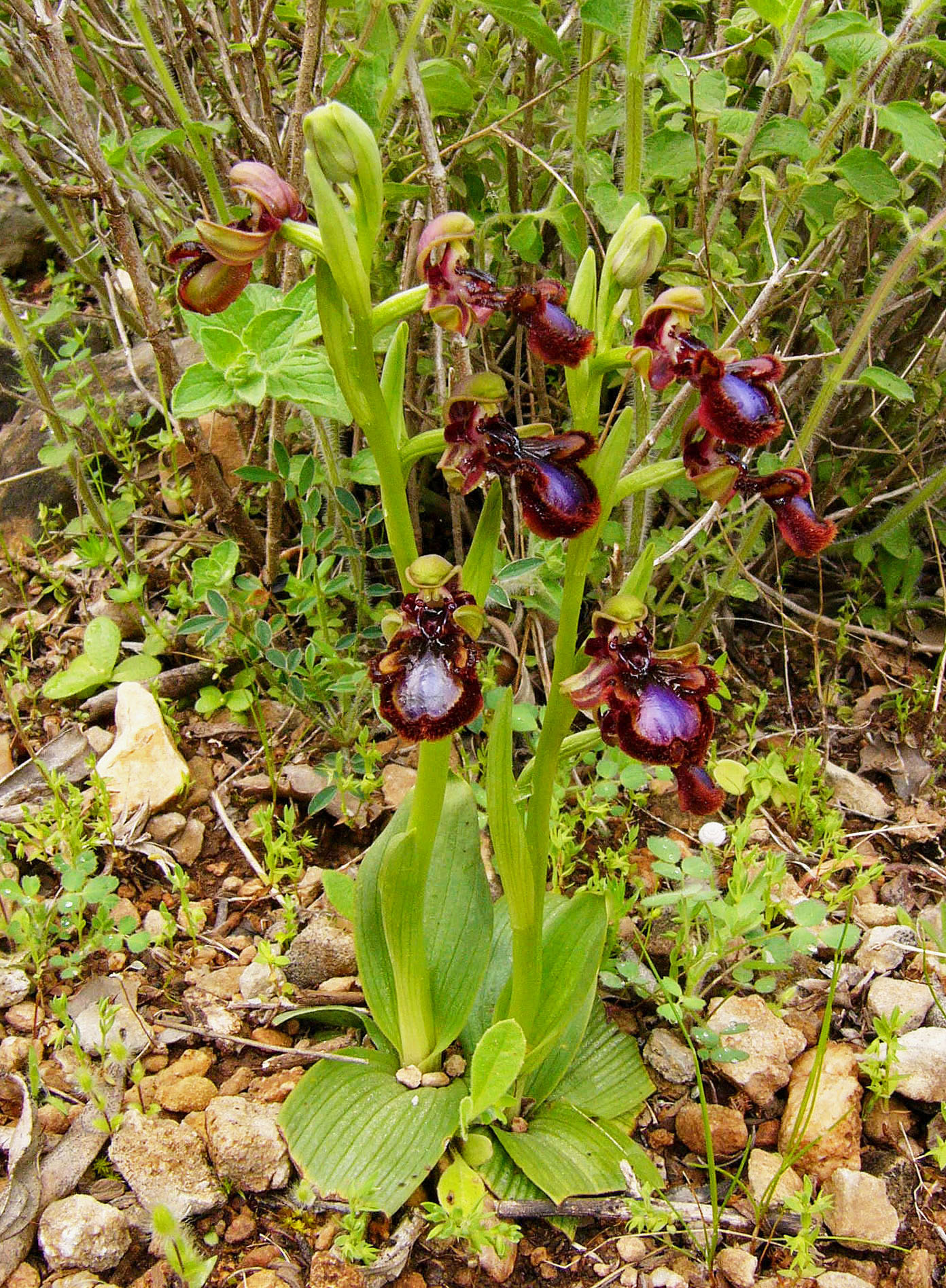 O. speculum was first described from Setubal, Portugal in 1800 and its name refers to the mirror like speculum. This species has long been known to botanists by its common name, the Mirror Ophrys. This is one of the Mediterranean's most widespread Ophrys, occurring throughout the region but in varying degrees of abundance. It's considered an extreme rarity in France and northern Italy, being at its most common in the southern parts of its range in Greece, Spain, Portugal, North Africa and Sicily where, although sporadic, can occur in huge colonies. O. speculum is a small but distinctive orchid that cannot readily be confused with any other Ophrys apart from its rarer close relatives O. regis-fernandii and O. vernixia with which there are some limited overlaps in range. In the Aegean it is present on Lesbos whereas on Chios and Samos it is replaced by O. regis-fernandii whilst Rhodes maintains populations of both. This is a small orchid and despite its distinctive flower, can be very easily overlooked in the field. It can grow to a height of 25cms but is usually no greater than 10cms, with a spike of perhaps 3 flowers. The flowers are relatively large and not hugely variable. In the east of its range however is a darker variant named, orientalis. The precise distribution of this variety is not clear but is certainly well known from mainland Greece and the pictures here come from the Peloponnese O. speculum v orientalis is easily distinguished from type by the extent of the black colouration in and below the stigmatic cavity and by the generally darker speculum and peripheral hair. |