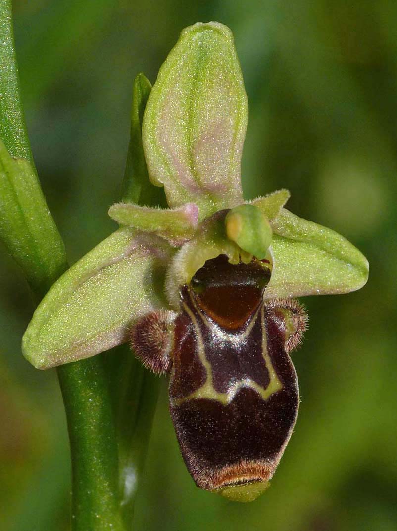 O. sphegifera was first described by Carl Ludwig Willdenow from Algeria as long ago as 1805 and its name literally means "wasp bearing". Its common name is the Tunisian Bee Orchid. This is an uncommon member of the small O. scolopax group with a range that takes it from Southern Spain and Portugal across the Mediterranean to Tunisia and Algeria. This distribution model is not however universally accepted, with some authorities believing it to be limited to northern Africa whilst others allow for a wider dispersal that includes southern France and Sardinia. It can be found growing in very differing types of habitat, tolerating both alkaline and acidic substrates in full sun or mid shade positions. The range of O. sphegifera brings it into contact with two other closely related and morphologically similar species, namely O. scolopax and O. picta. The most immediately obvious differentiator is perianth colouration with O. sphegifera invariably exhibiting green sepals and petals and the other two species pink through to white. It is not unusual for O. spegifera sepals to be lightly washed pink or O. picta to be washed green but with the former, the base colour is firmly green. O. sphegifera is noticeably the smallest flower of the three and the plant itself is much the spindliest and shortest, rarely exceeding some 25cm. The waistline of O. sphegifera is higher than both its cousins, being at least halfway up the labellum whereas the others are below this point. The pictures come from an area of southern France near the Spanish border, so clearly fall outside many peoples view of the species range. The plants do however conform to type description and the reader is therefore left to accept or otherwise thier authenticity. |