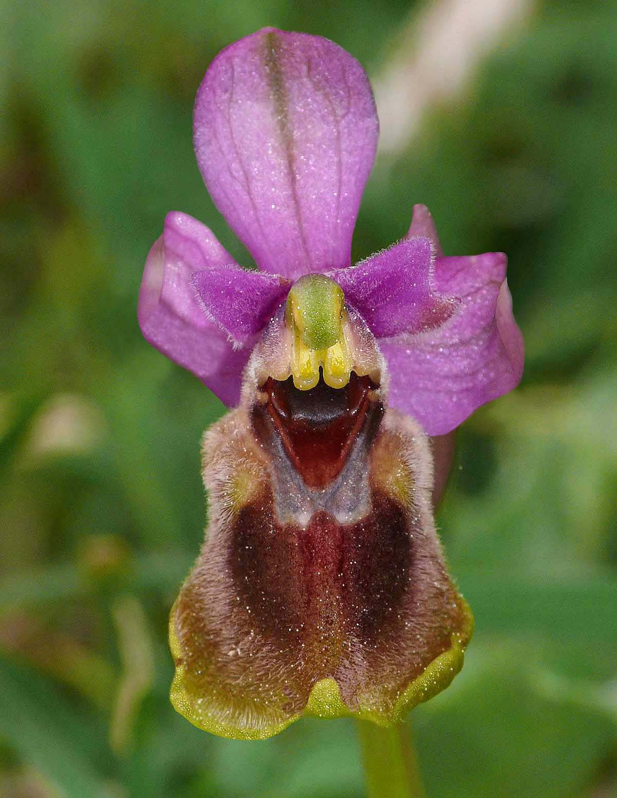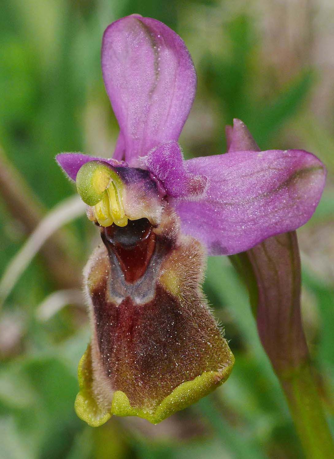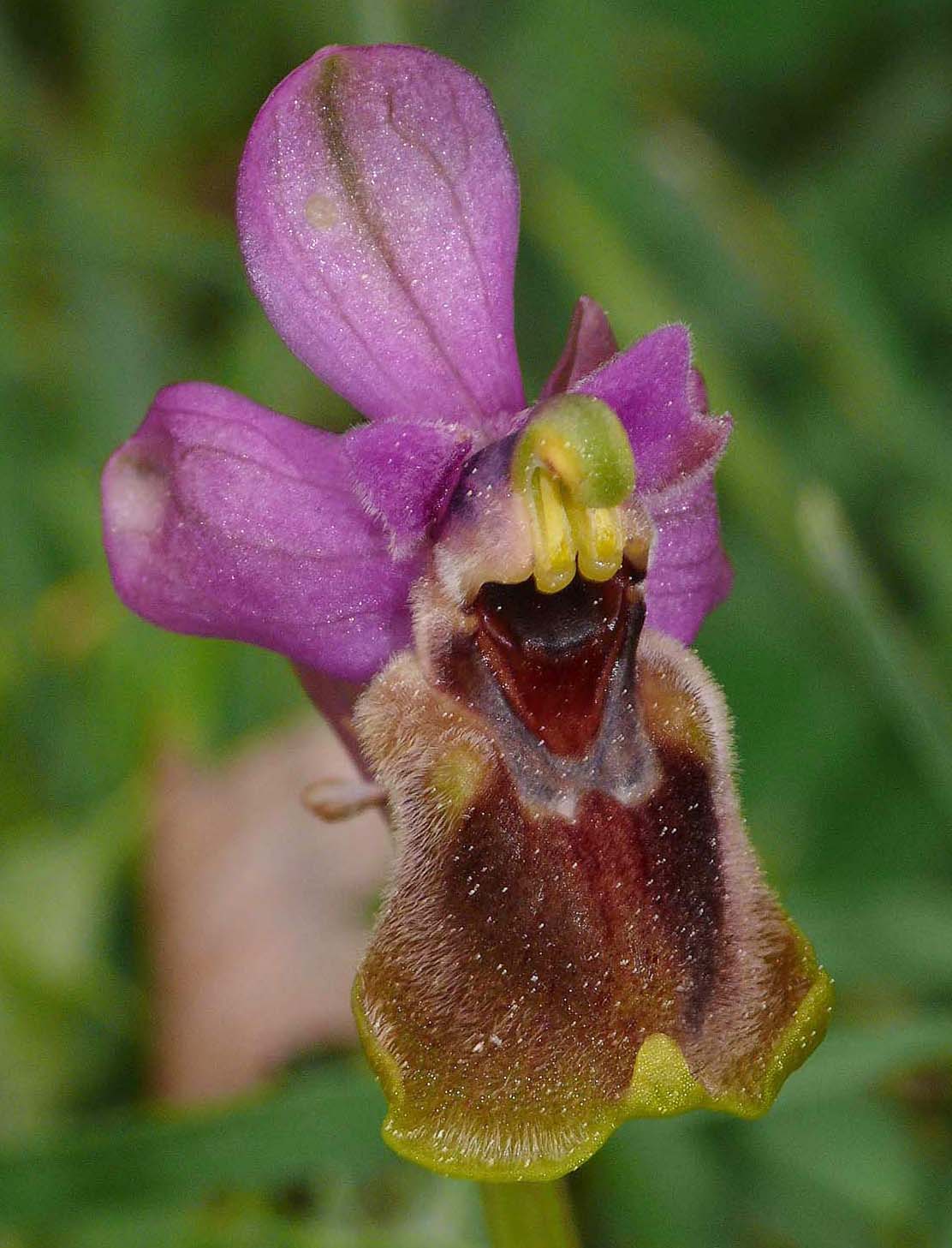 This variety is difficult to separate from O. tenthredinifera itself and attempting to portray differences by means of photography is hard to achieve. The dissimilarities are small and best observed in the field, ideally with both species and variety in close proximity. This situation would however be difficult to manufacture given that flowering times do not coincide very closely, with O. tenthredinifera v praecox coming into full bloom in January, and being well past its best in March. Although in favourable conditions O. tenthredinifera may be found in flower in late January, in the areas of overlap between the two types it is more usual to see flowering start in late February or March. The likelihood is that the two plants will rarely be found in their prime together and this in itself is a key to identification. A second important differentiator is size and this becomes very apparent in the field, with the variety being noticeably smaller in all its parts. The plant itself is less robust and carries fewer individual flowers, often just one or two. The flower is narrow shouldered and possesses much reduced basal swellings ; the appendage is similarly reduced but this feature is a difficult one to detect. Overall, O. tenthedinifera v praecox presents a rather dull appearance in comparison to O. tenthredinifera but in instances of an overlapping flowering period, the former can easily be confused with weaker specimens of the latter. This variant is currently known from central Portugal and in just a few stations further south, it is however believed that it probably occurs unrecorded throughout the range of O. tenthredinifera. |